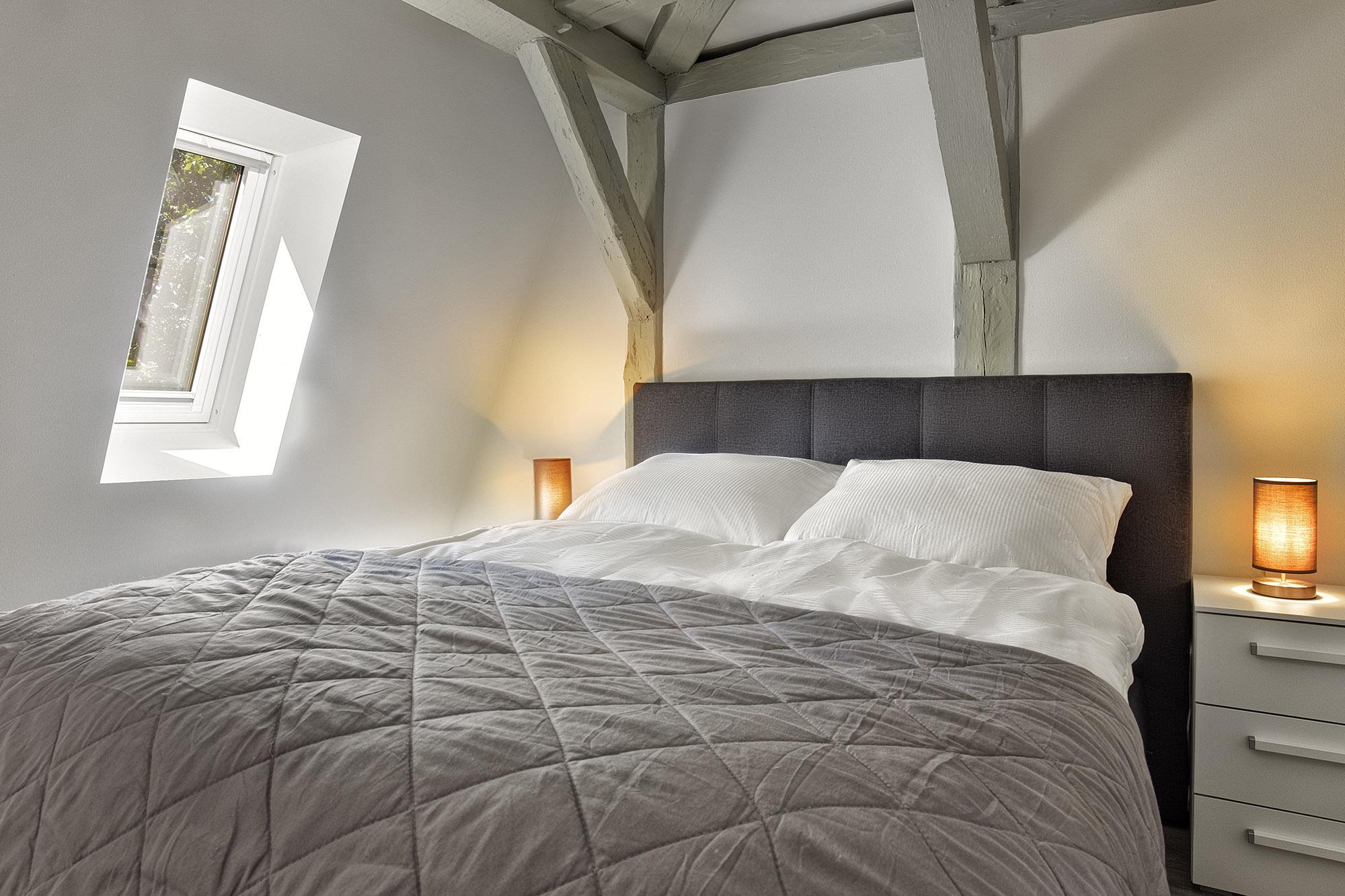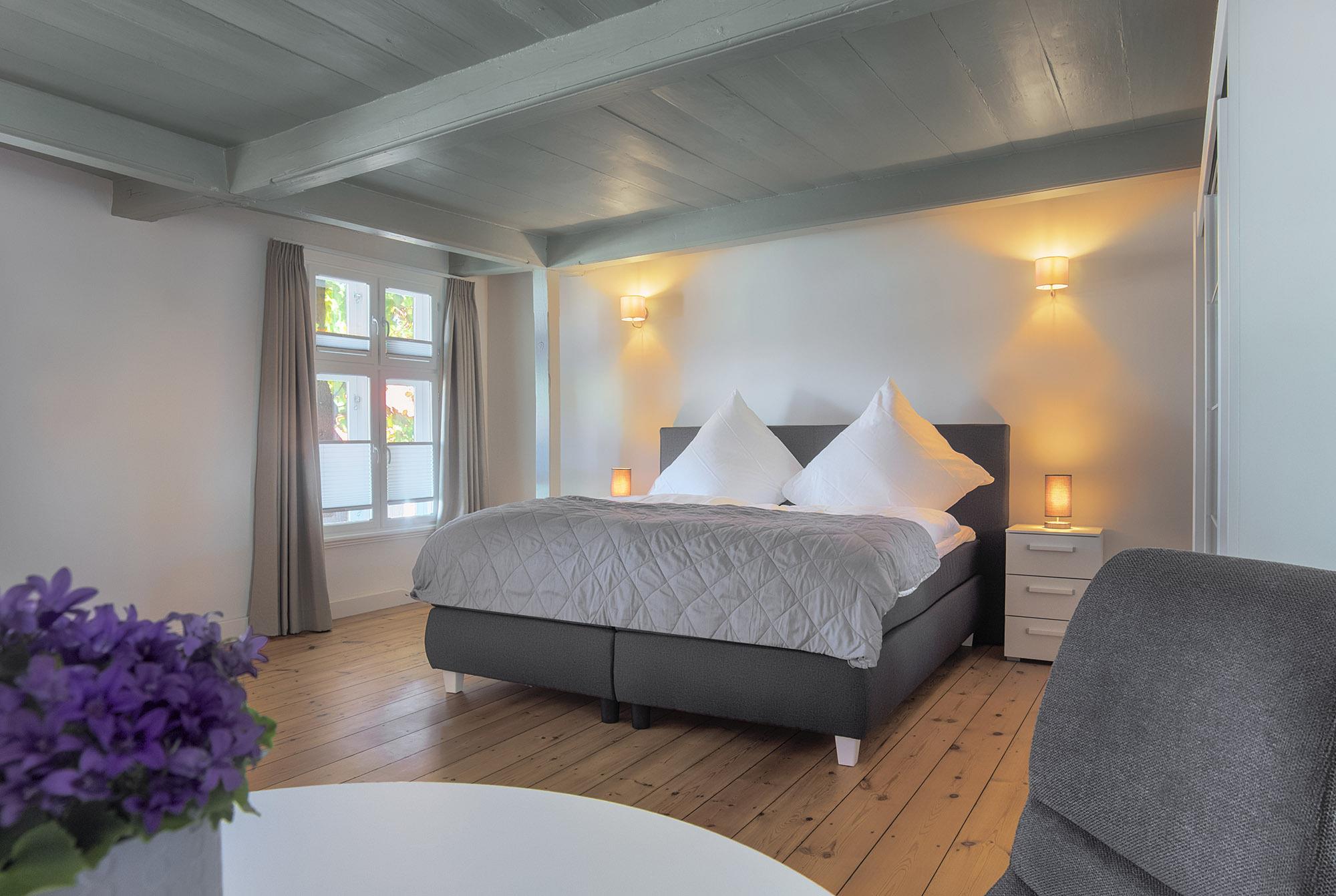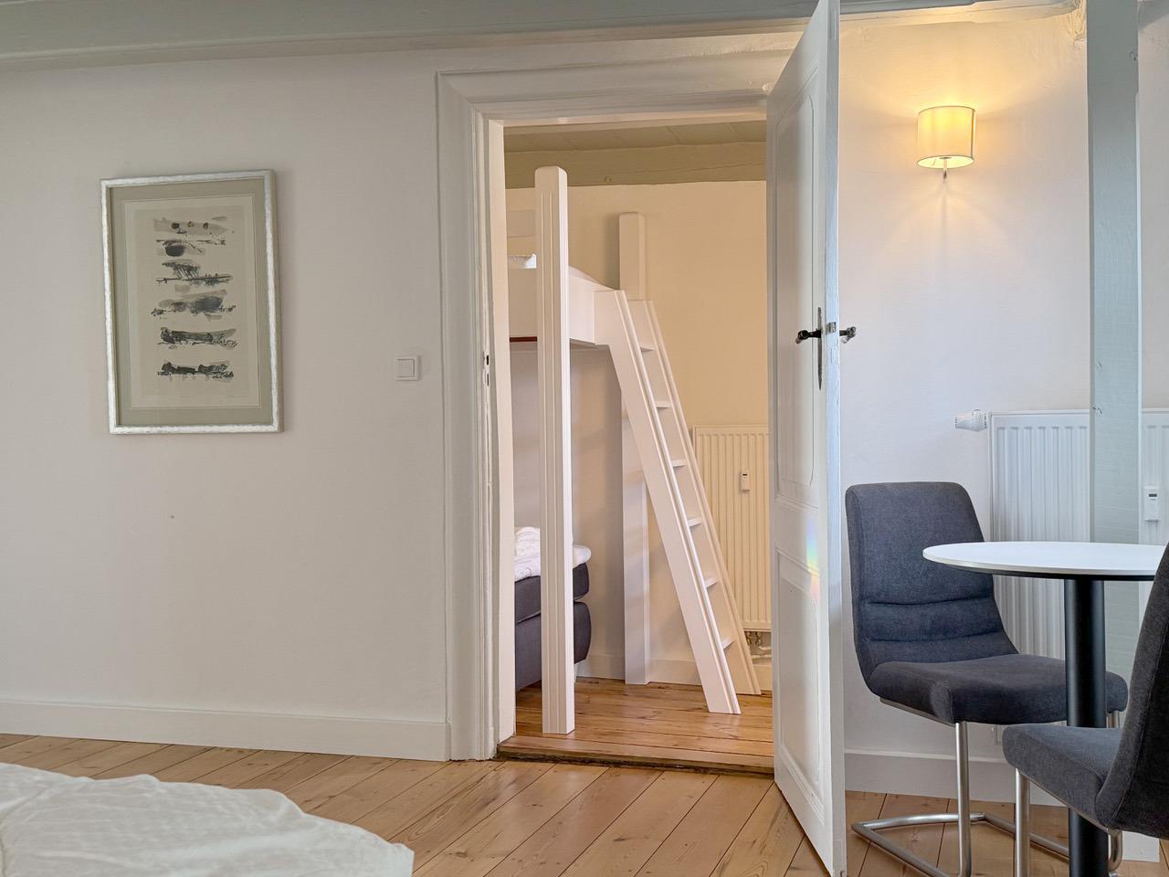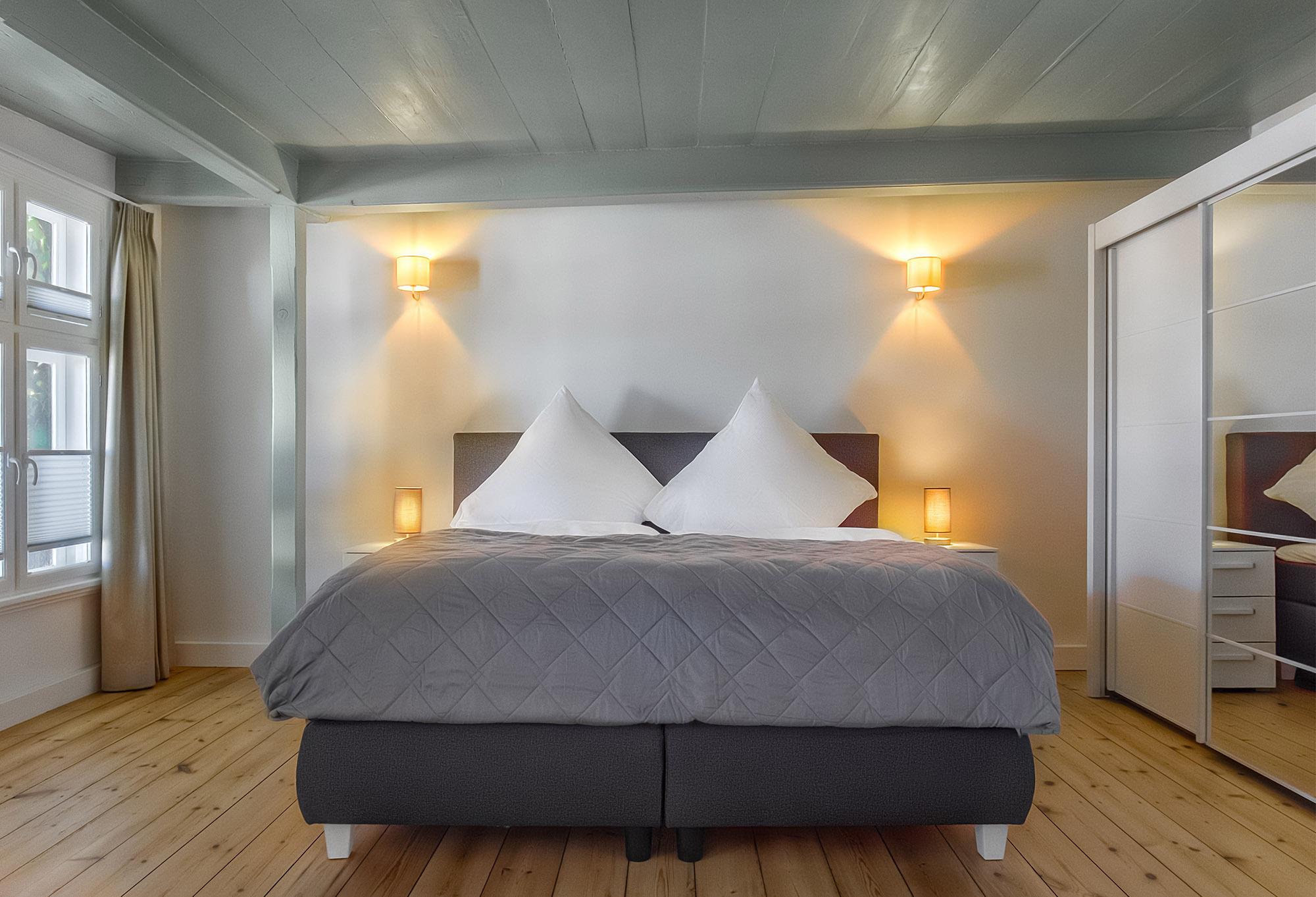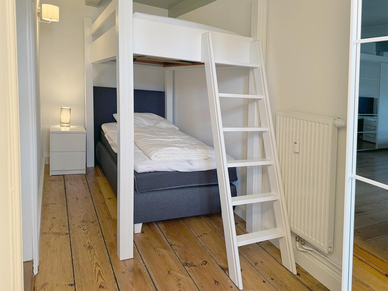 Die Ferienwohnung eignet sich besonders für Familien, da sie über drei Schlafzimmer verfügt. Das erste Schlafzimmer mit einem Doppelboxspringbett (180x200) dient als Durchgangszimmer zum zweiten Schlafzimmer mit einem Einzelboxspringbett (100x200) mit zusätzlichem Hochbett (100x200). Das dritte Schlafzimmer ist mit einem Doppelboxspringbett (160x200) ausgestattet. Allergiker-geeignete Bettwäsche, Handtuchsets, ein Babyreisebett (ohne Bettzeug) und ein Hochstuhl können bei Bedarf gegen Gebühr geliehen werden. Für Verdunklung und eine angenehme Nachtruhe sorgen blickdichte Plissees.