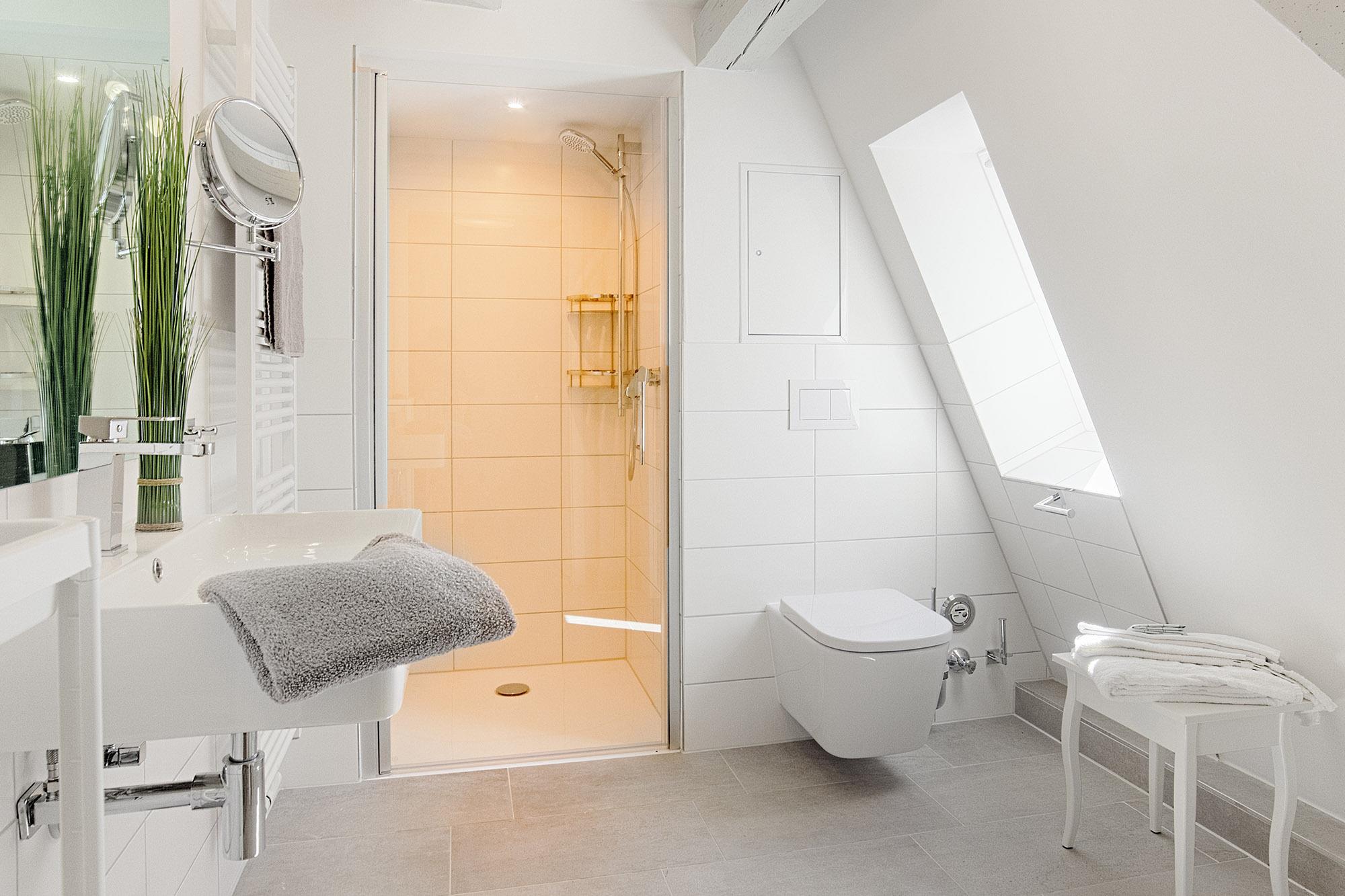 Das moderne Badezimmer mit ebenerdiger Dusche, Handtuchwärmer, Waschbecken und WC ist von den Schlafzimmern aus bequem erreichbar. Ein separater Raum im Erdgeschoss steht allen Gästen des Gutshauses zur Verfügung und bietet zusätzlichen Komfort mit Waschmaschine, Bügeleisen und -brett.
