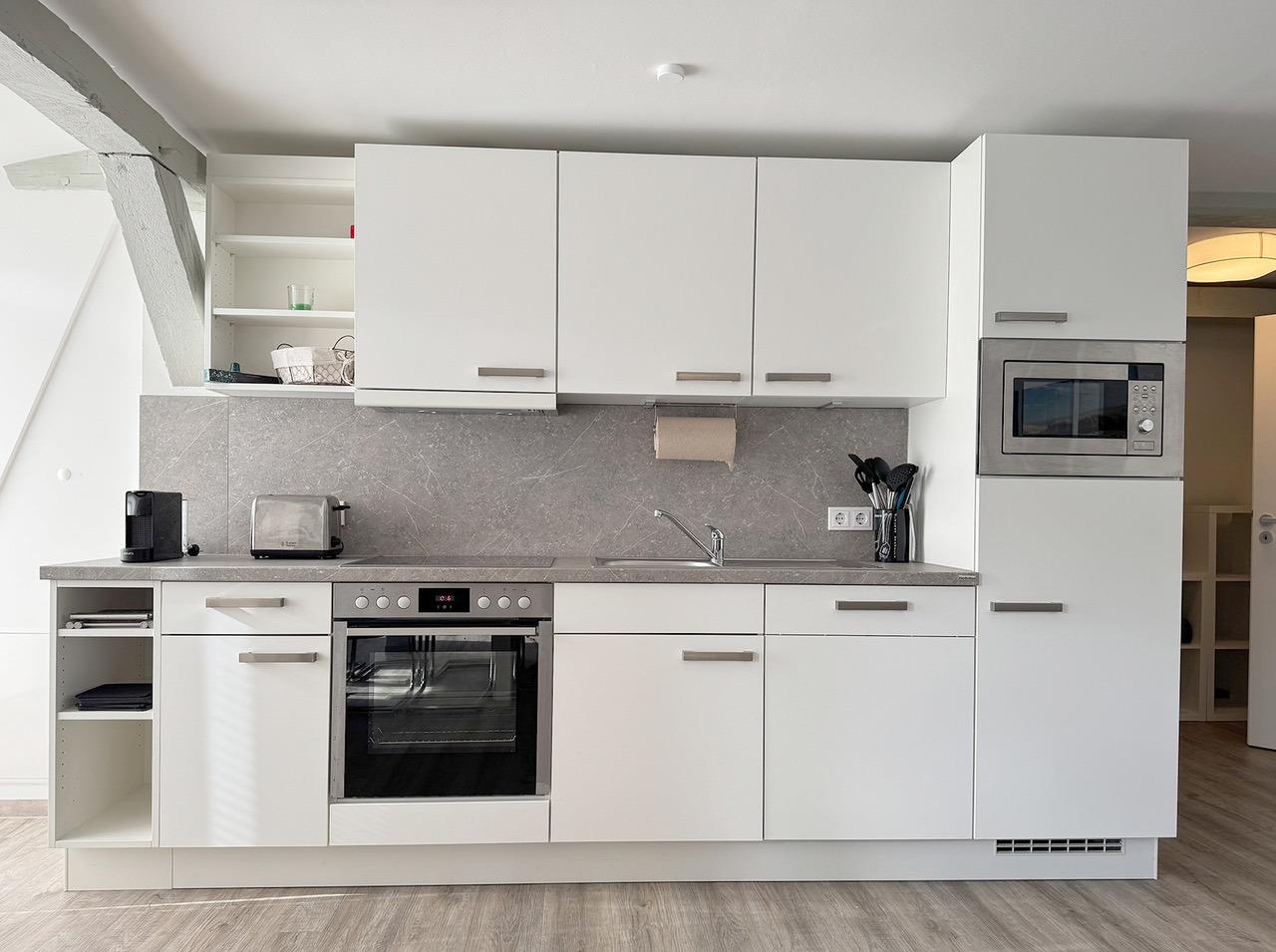 Die offene, voll ausgestattete Küche mit Geschirrspüler und zusätzlicher Espresso-Maschine grenzt direkt an den Wohnbereich. Der angrenzende Essbereich lädt zu gemeinsamen Mahlzeiten ein und sorgt für eine wohnliche Atmosphäre.