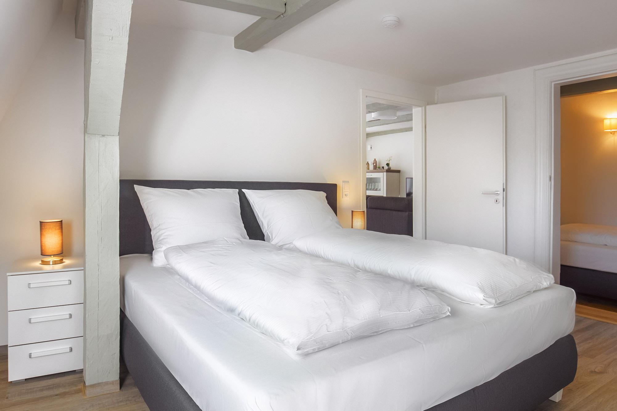 Die Ferienwohnung ist besonders für Familien oder Paare geeignet, da sie über zwei separate Schlafzimmer verfügt. Das Elternschlafzimmer ist mit einem Doppel-Boxspringbett und einem gemütlichen Ohrensessel eingerichtet, der zum Lesen einlädt. Das zweite Schlafzimmer verfügt über zwei Einzelbetten, die Rückzugsmöglichkeiten und Erholung bieten. Für Verdunkelung und nächtliche Ruhe sorgen blickdichte Plissees. Von den Schlafzimmern erreichen Sie bequem das großzügige Tageslicht-Bad mit ebenerdiger Dusche, Handtuchwärmer, Waschbecken und WC. Die offene und voll ausgestattete Küche mit direktem Zugang zum großen Balkon ist mit Spülmaschine, Mikrowelle und Backofen ausgestattet und garantiert während Ihres Aufenthaltes alle Annehmlichkeiten. Kaffeeliebhaber finden neben einer klassischen Filterkaffeemaschine auch eine Nespresso Maschine mit Milchaufschäumer.