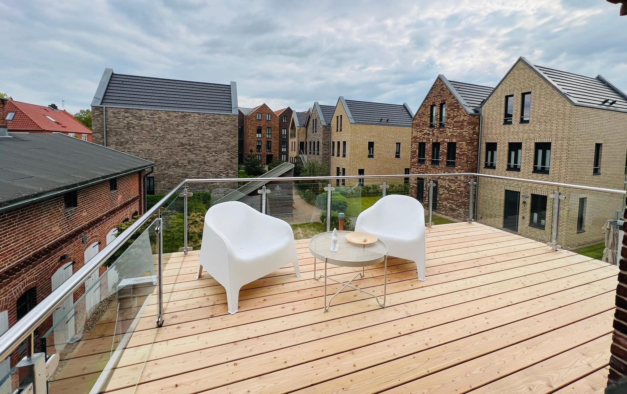 Der geschmackvolle Wohnbereich ist offen und mit gemütlicher Couch, Smart-TV und WLAN zur Unterhaltung ausgestattet. So kann man auch im Urlaub seine Lieblingsserien oder Filme per Stream schauen. Die Fenster in Südlage bringen viel natürliches Licht und bieten von der Couch einen direkten Blick in das Fischerdorf Heiligenhafen. Der im Mai 2024 neu errichtete Balkon in Süd-Ausrichtung mit herrlichem Blick bietet ganztägig einen sehr, sehr ruhigen Platz zum Entspannen.