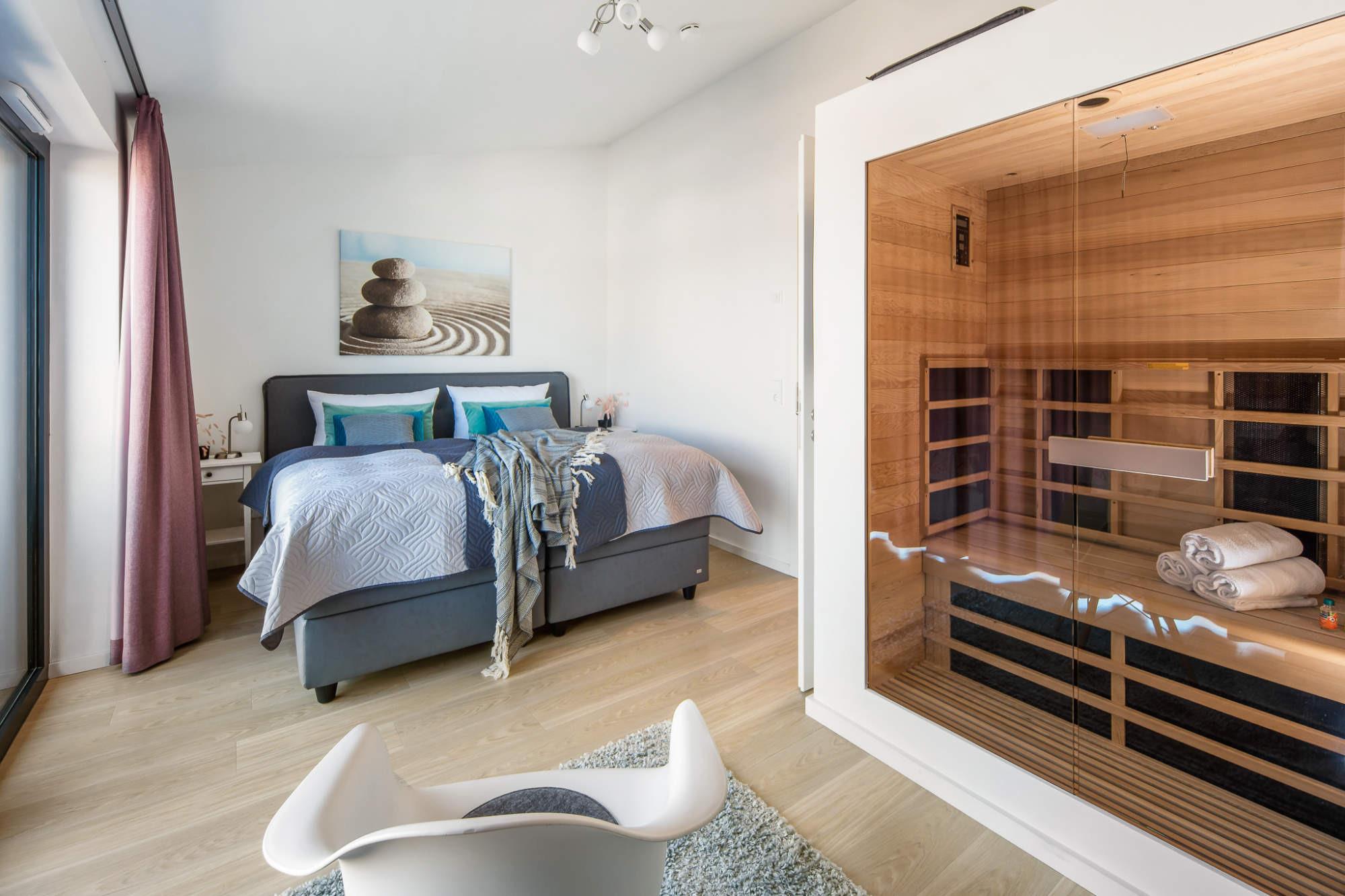 Ein besonderes Highlight ist die integrierte Infrarot-Sauna, die Ihnen wohltuende Entspannung nach einem Tag am Meer bietet. Und für pure Erholung unter freiem Himmel sorgen die zwei großzügigen, möblierten Dachterrassen. Genießen Sie auf der sonnigen Südterrasse die frische Ostseeluft und lassen Sie den Tag entspannt auf der Nordterrasse bei einem Glas Wein und einem traumhaften Sonnenuntergang ausklingen.