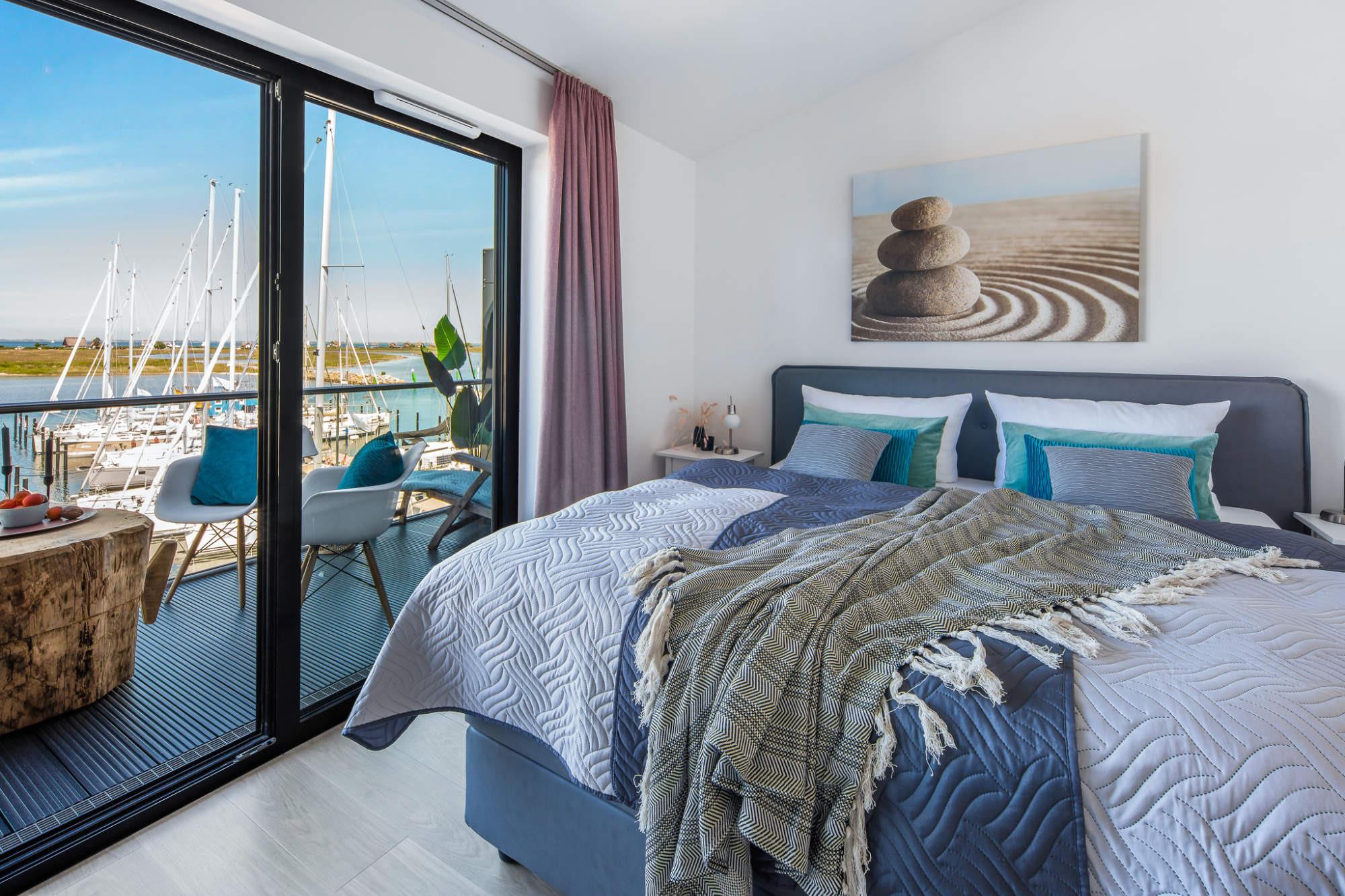 Auf rund 90 m² erstreckt sich diese stilvolle Unterkunft über zwei Ebenen, das 1. Obergeschoss und das Dachgeschoss, verbunden durch eine elegante Innentreppe. Der lichtdurchflutete Wohnbereich mit hochwertiger Einrichtung begeistert mit einem atemberaubenden Panoramablick auf den Jachthafen und die Ostsee. Näher am Wasser kann man kaum Urlaub machen.