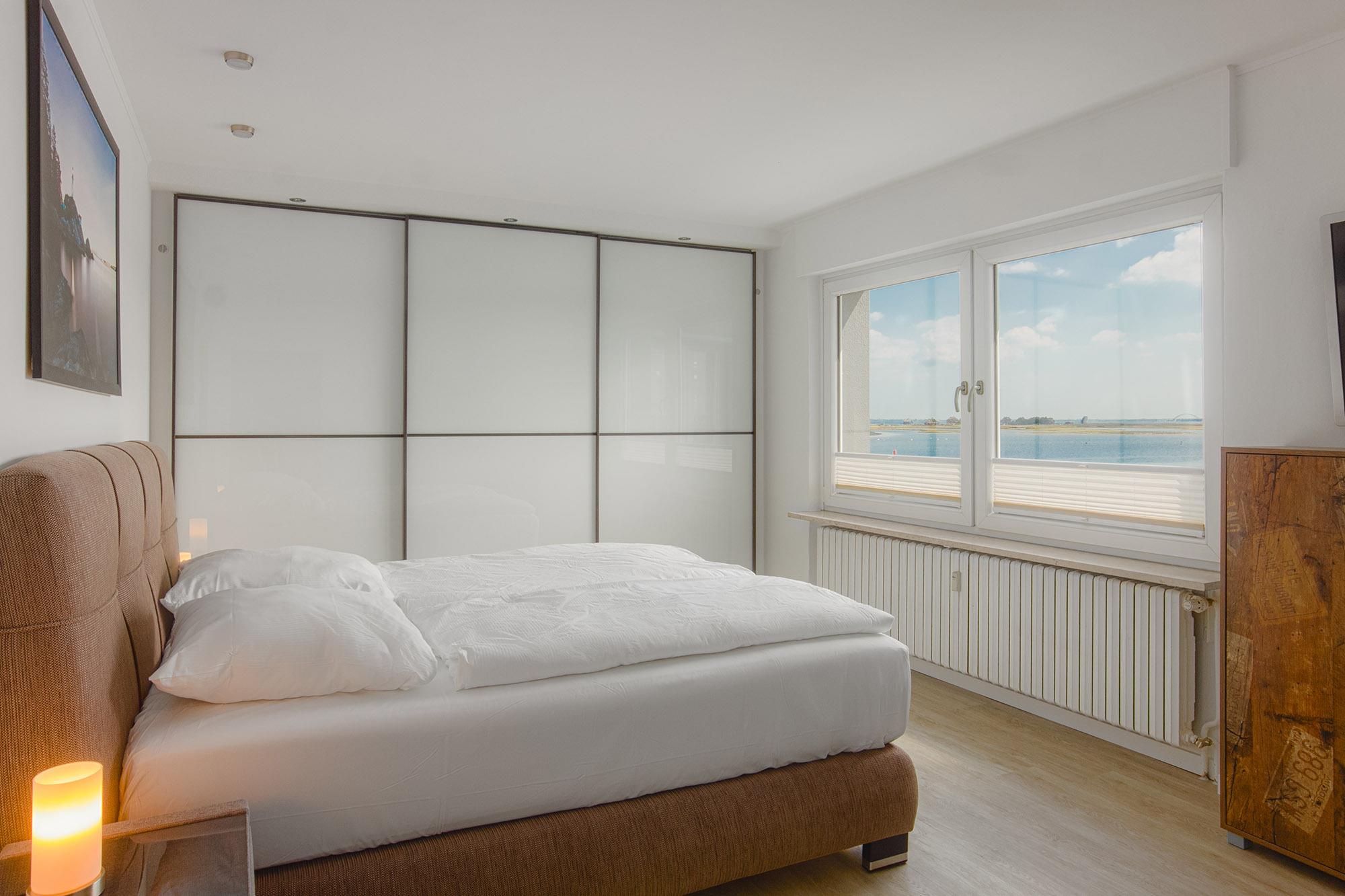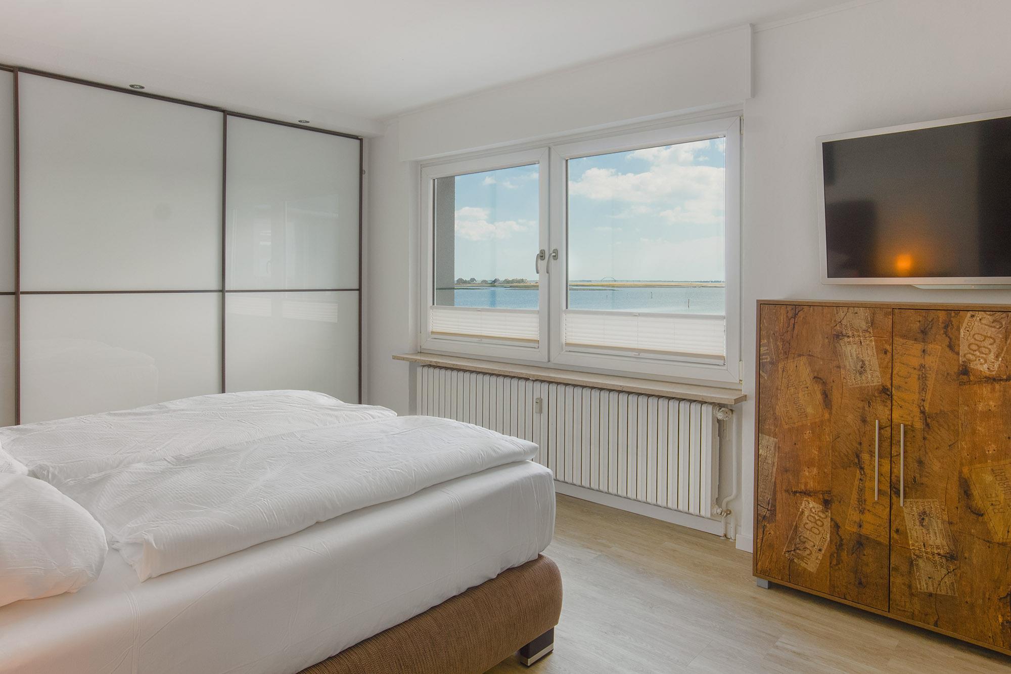 Ebenso komfortabel geht es in den zwei Schlafzimmern der Wohnung weiter. Hier warten einladende Doppelboxspringbetten (180x200 + 180x200), große Kleiderschränke und jeweils zusätzlich ein TV. Für Verdunklung sorgen elektrische Aussenjalousien. Bettwäsche und Handtuchsets sind inklusive.