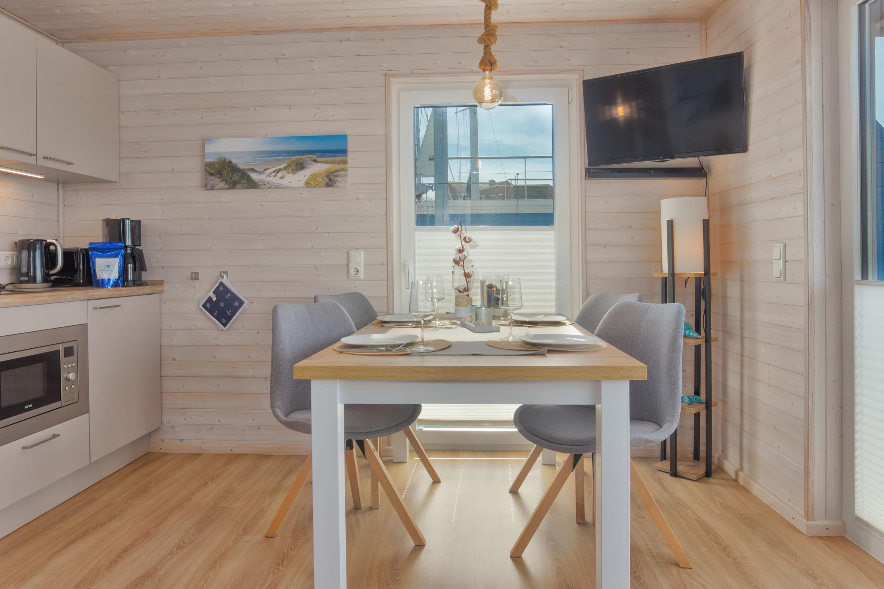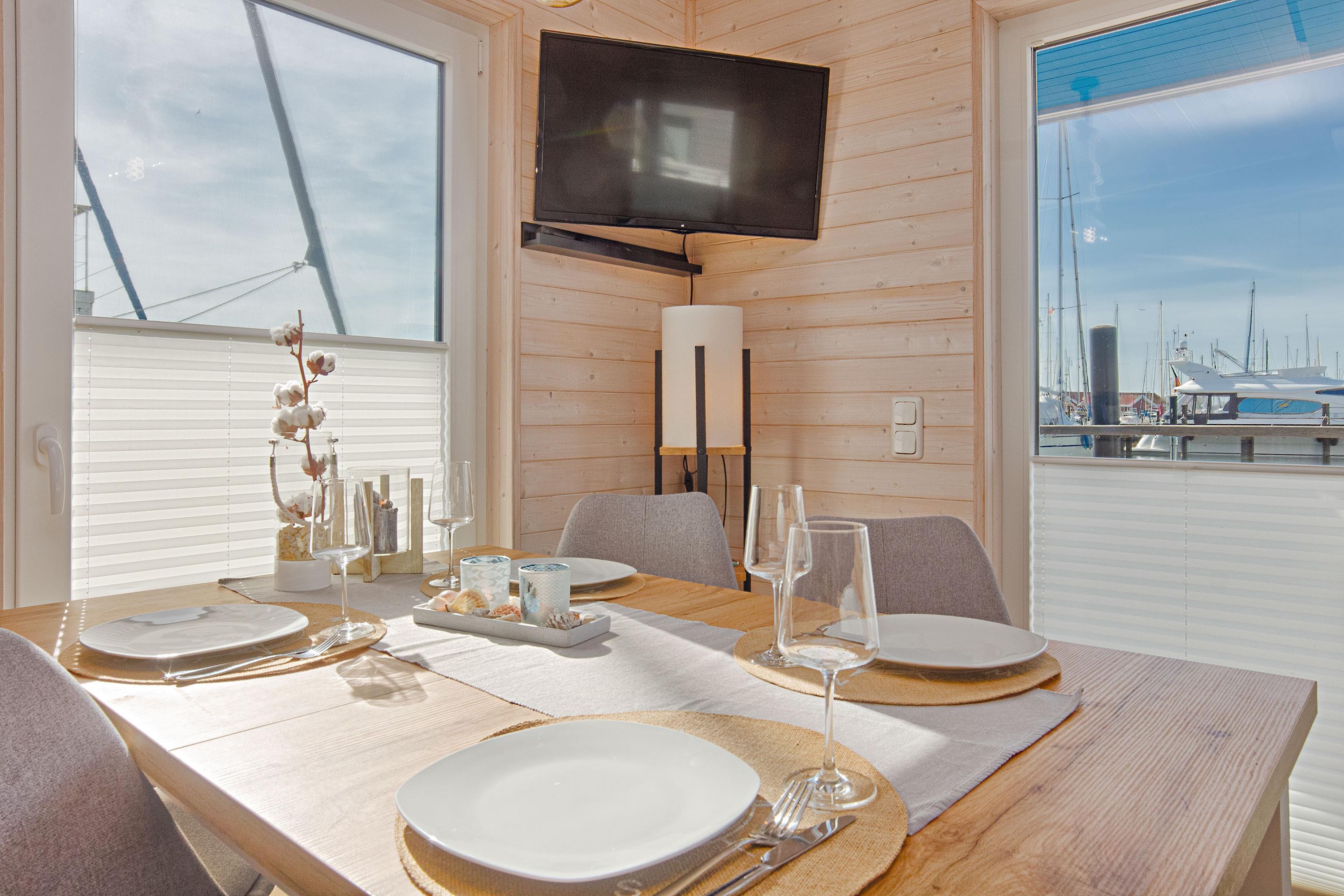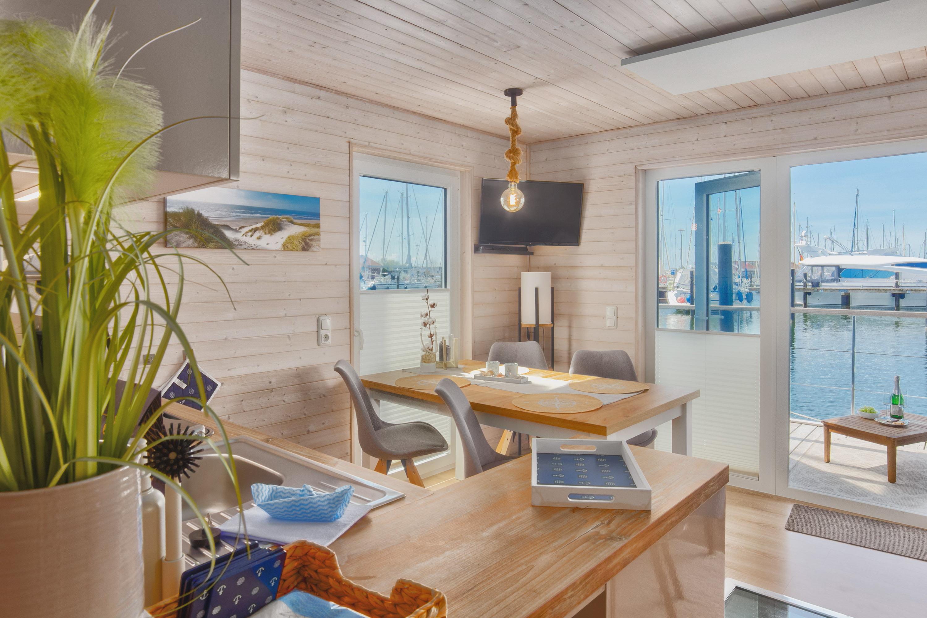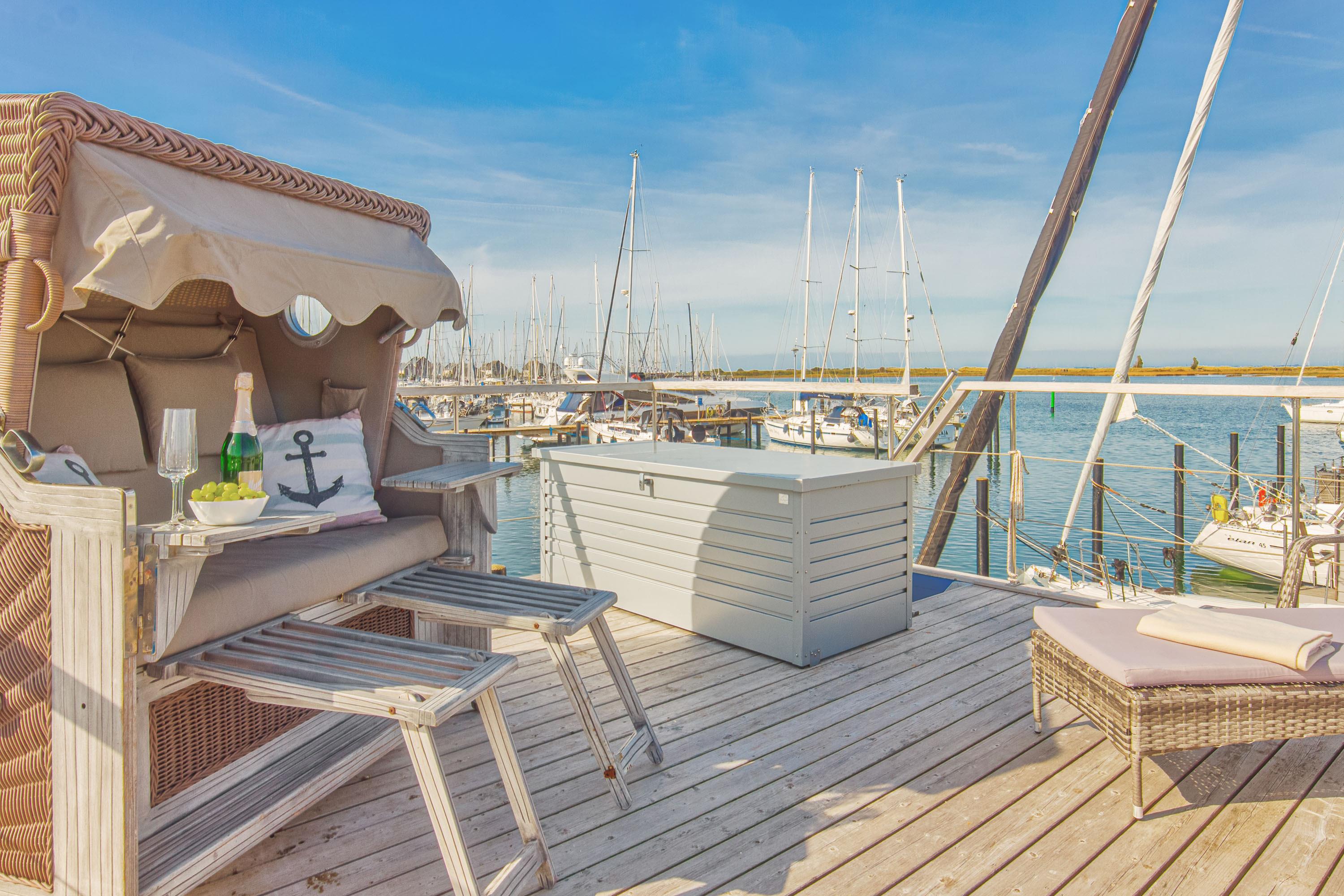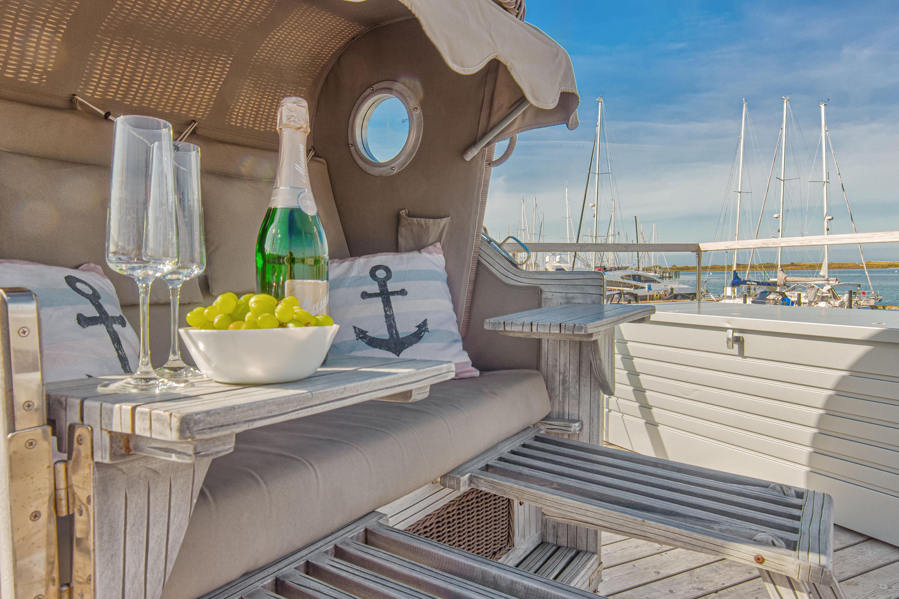 Der offene Wohn – und Essbereich lädt zu gemeinsamen Spieleabenden und gemütlichen Stunden ein, mit toller Aussicht auf den Hafen. Erleben Sie einzigartige Sonnenuntergänge in gemütlichen Loungemöbeln oder im Strandkorb vom großen Sonnendeck aus.