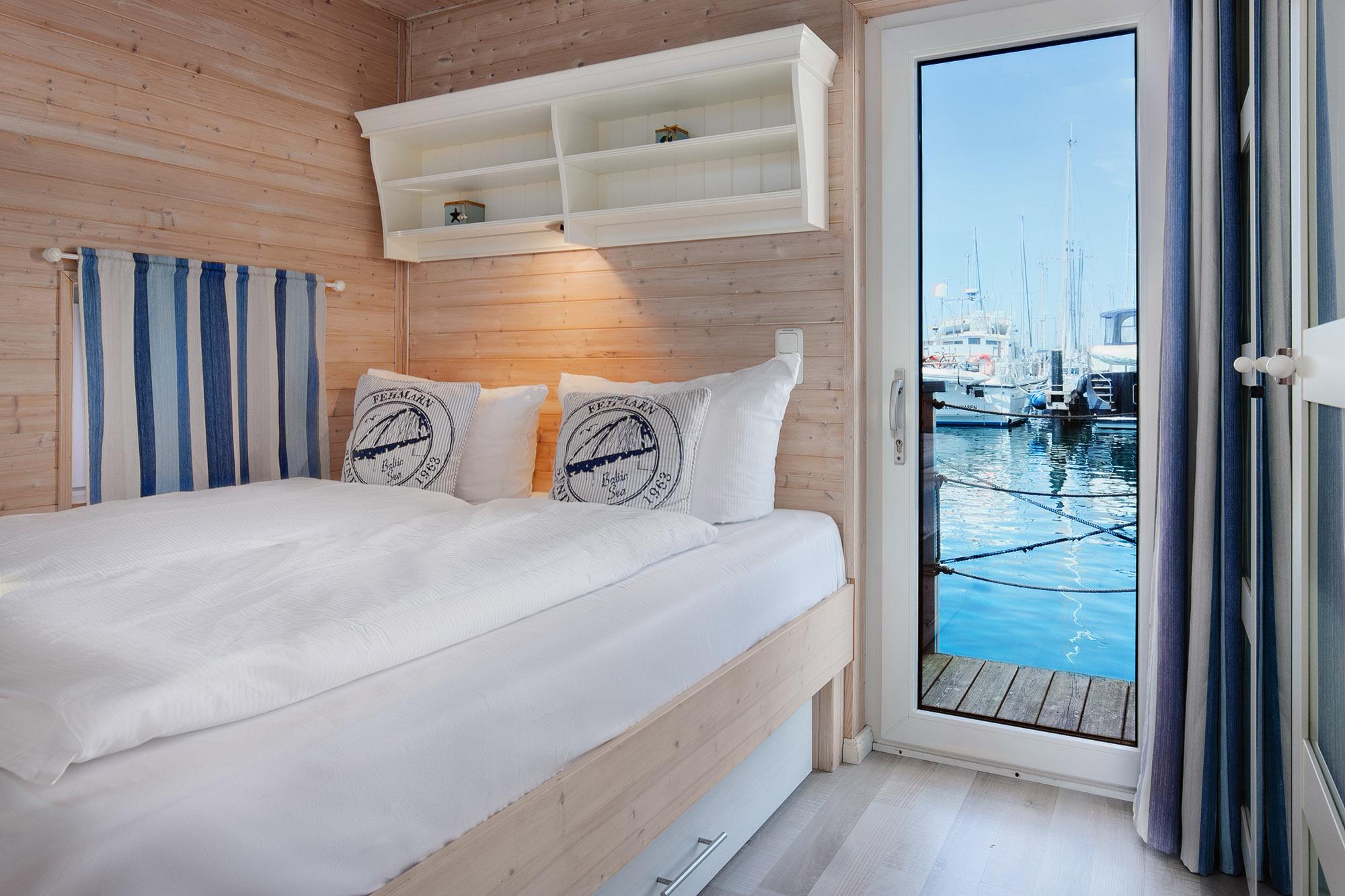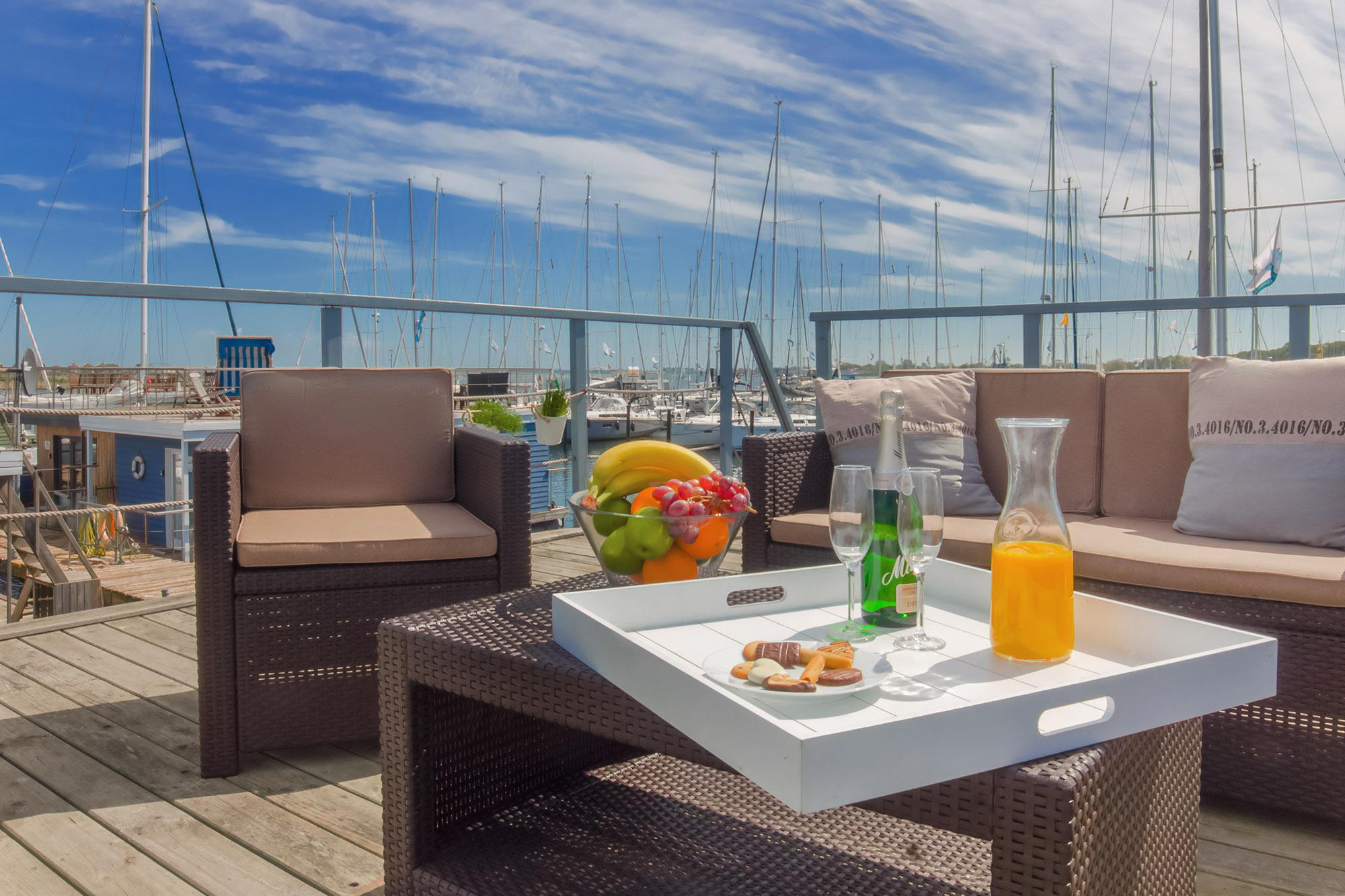 Auf zwei Ebenen erstreckt sich dieses exklusive Hausboot Stina auf ca. 25 m² Wohnfläche und zusätzlich die möblierte Dachterrasse als Sonnendeck, verbunden über eine außenliegende Treppe. Der moderne und konzipierte Wohnbereich bietet Ihnen einen fantastischen Panoramablick über den Jachthafen und vom Sonnendeck über die Ostsee. Näher am Wasser kann man nicht Urlaub machen!