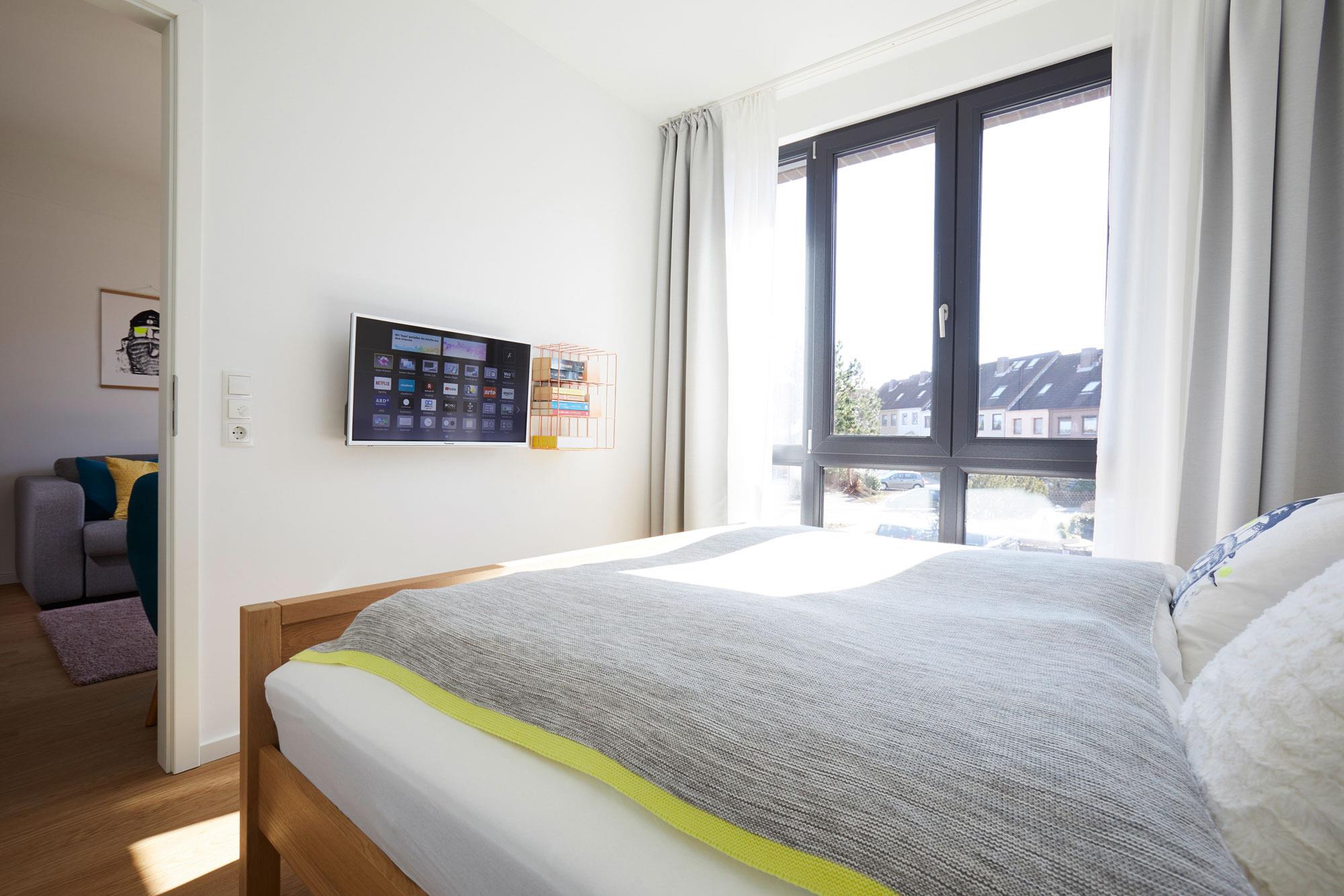 Die Heiligenhafenbude verfügt über ein separates Schlafzimmer mit Doppelbett und eigenem TV. Für zusätzlichen Schlafkomfort sorgt die Schlafcouch im Wohnbereich. Damit ist die Wohnung ideal für kleine Familien oder Paare. Für höchsten Komfort sind elektrische Außenrollos vorhanden, die für angenehme Dunkelheit und ungestörte Nächte sorgen. Allergikerfreundliche Bettwäsche, Handtücher sowie ein Babyreisebett können bei Bedarf gegen Gebühr geliehen werden. Ein Hochstuhl steht kostenlos zur Verfügung.