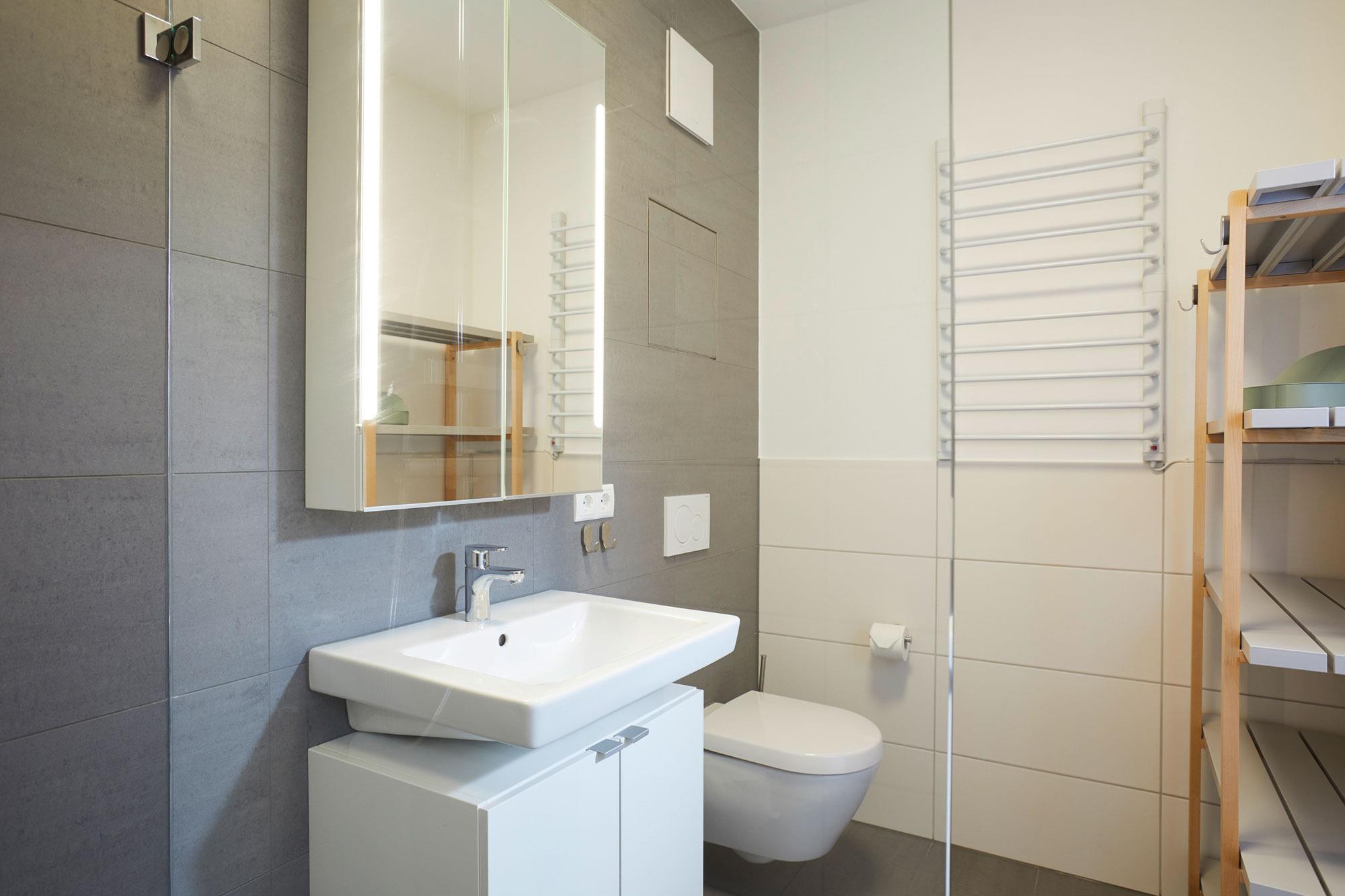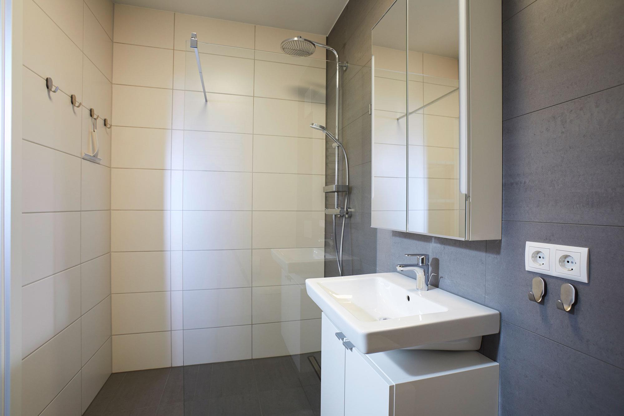 Vom Schlafzimmer aus gelangen Sie direkt in das großzügige Badezimmer, das mit einer ebenerdigen Rainshower-Dusche, Waschbecken und WC ausgestattet ist. Hier können Sie sich nach einem erlebnisreichen Tag erfrischen und entspannen.