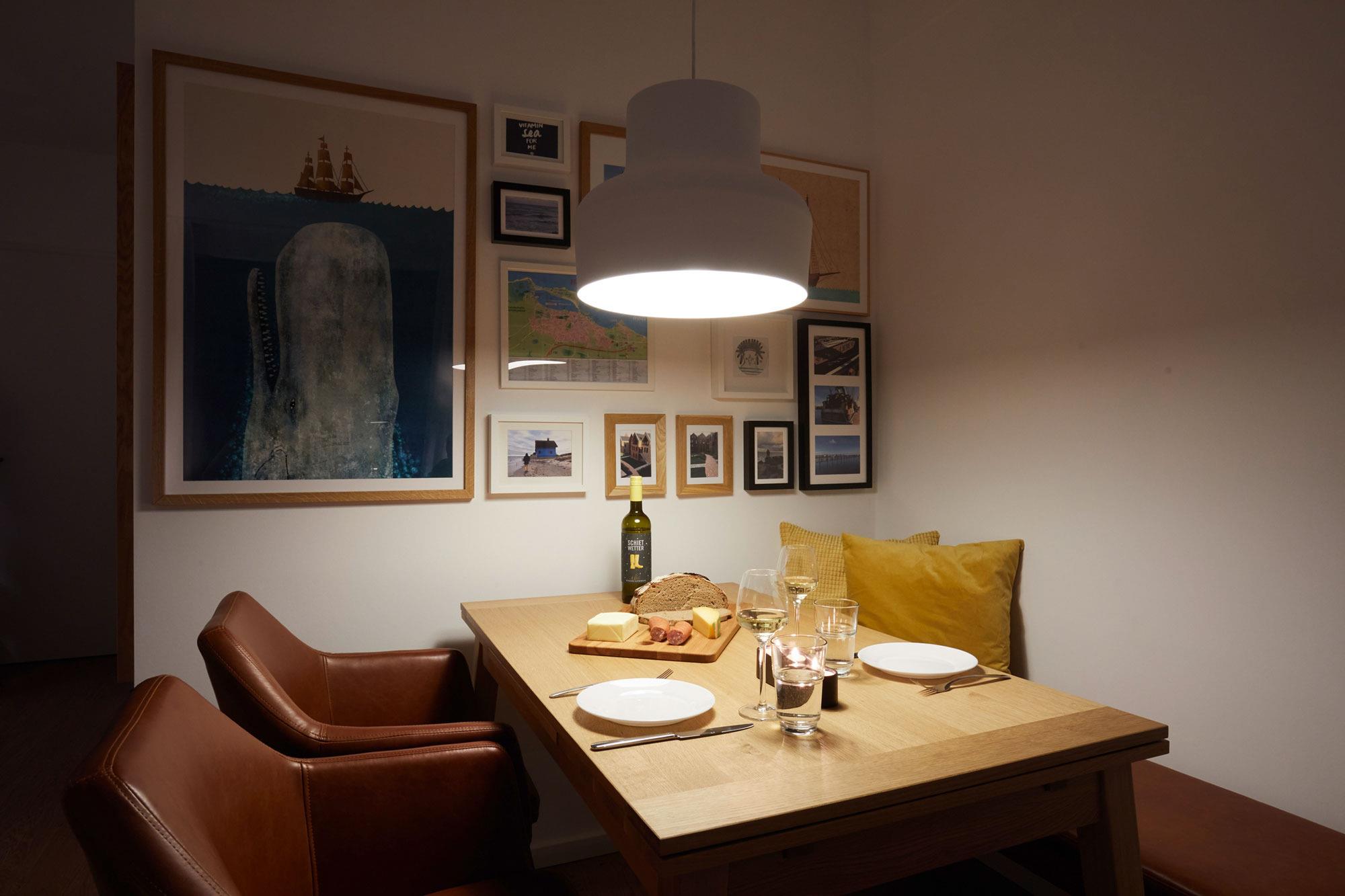 Der geschmackvolle Wohnbereich lädt mit einer bequemen Couch (Schlaffunktion für die 3. und 4. Person) und einem gemütlichen Sessel zum Entspannen ein. Ob nach einem langen Strandspaziergang oder einem Bummel durch Heiligenhafen – hier können Sie es sich einfach gemütlich machen. Zur Unterhaltung stehen Ihnen Smart-TV, Blue-Ray-Player, Musikanlage und kostenfreies WLAN zur Verfügung. Sie möchten Ihre Lieblingsserien oder Filme per Stream schauen? Kein Problem! Die Fußbodenheizung sorgt für wohlige Wärme und ein angenehmes Wohngefühl. Dank der bodentiefen Fenster strömt viel Tageslicht in die Wohnung. Von hier aus gelangen Sie auf den möblierten Südbalkon – ein wunderbarer Ort, um die Sonne zu genießen oder das Treiben in der Umgebung zu beobachten. Perfekt für entspannte Stunden mit einer Tasse Kaffee oder einem Glas Wein.
