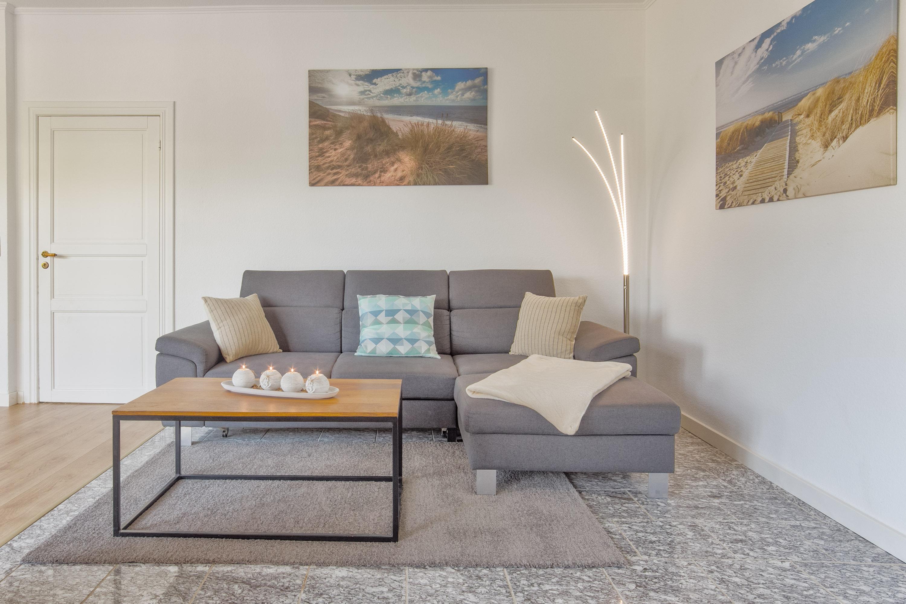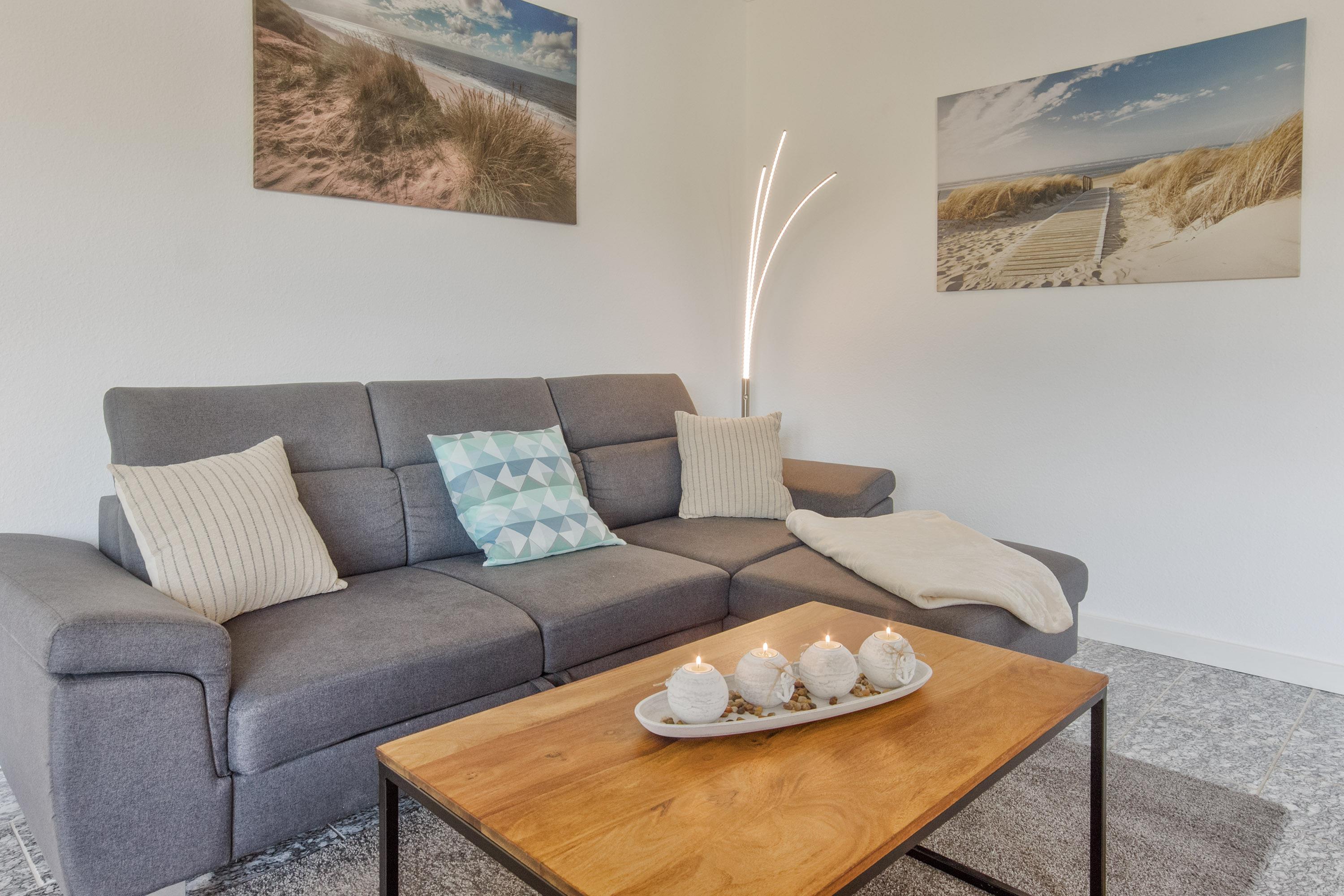 Herzstück ist der einladende Wohn- und Essbereich. Hier kann auf der gemütlichen Couch entspannt werden oder Sie genießen gesellige Stunden am großen Esstisch. Naturtöne und ausgewählte Dekorationen sorgen für ein wunderbar wohnliches Gefühl. Durch die großen Fenster haben Sie dabei einen großzügigen Blick in den Gartenbereich. Unterhaltung bietet Streaming-TV (WaipuTV) und mit dem WLAN / WiFi können Sie auch im Urlaub bequem online bleiben.