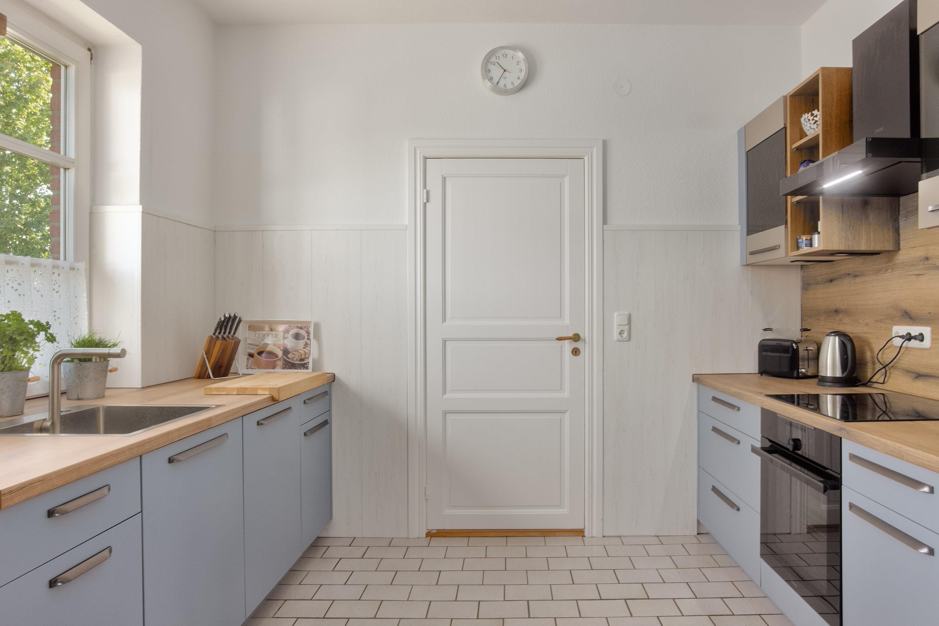 Die neue Komfortküche ist modern und durchdacht gestaltet und bietet Ihnen alle Annehmlichkeiten für eine sorgenfreie Selbstversorgung. Im kleinen Abstellraum nebenan ist zudem eine Waschmaschine und ein Trockner verfügbar.