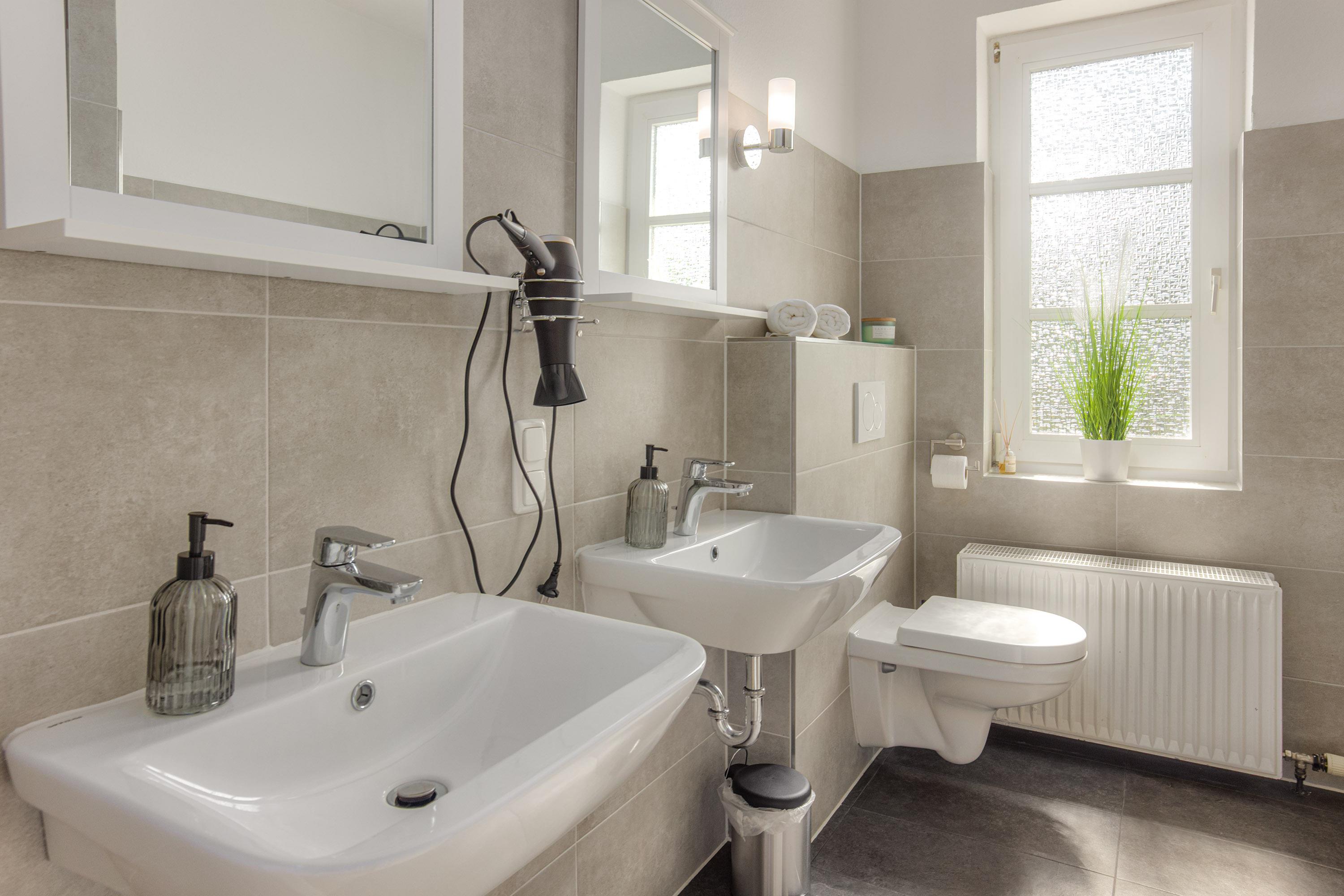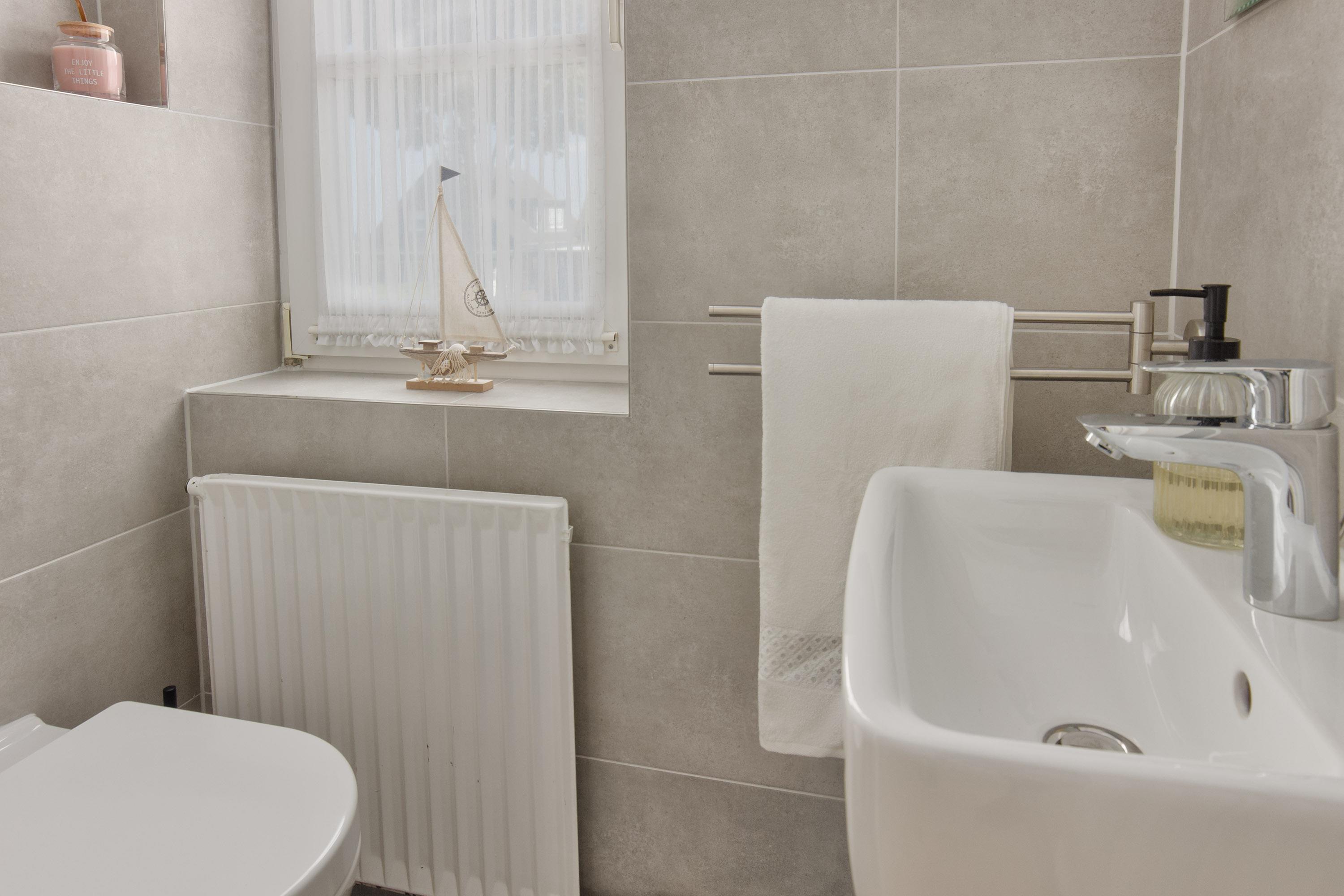 Das gut geschnittene, moderne Duschbad direkt neben den Schlafzimmern sorgt für weitere Bequemlichkeit. Die ebenerdige Dusche, Wanne, WC, Waschbecken und Spiegel runden den Raum ab. Ein separates Gäste-WC ist ebenfalls vorhanden.