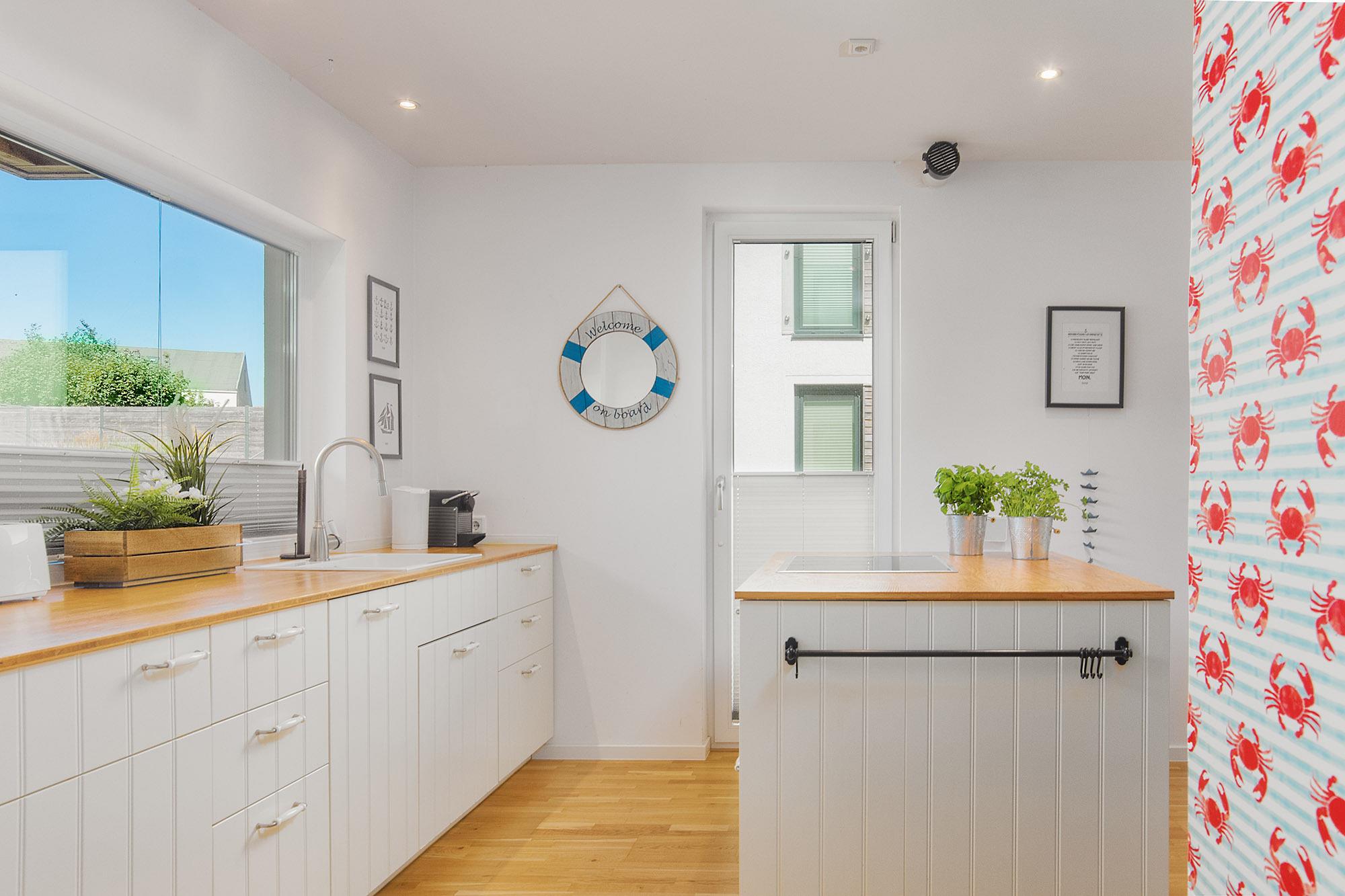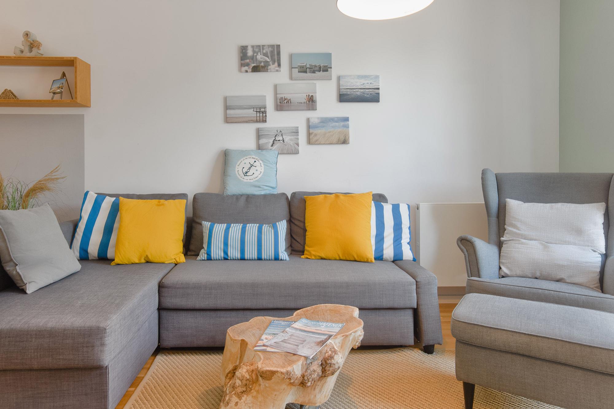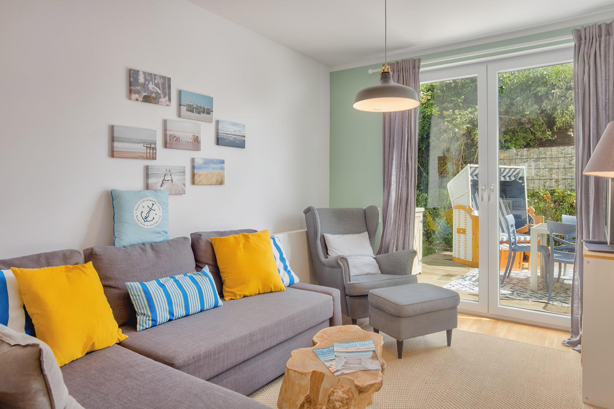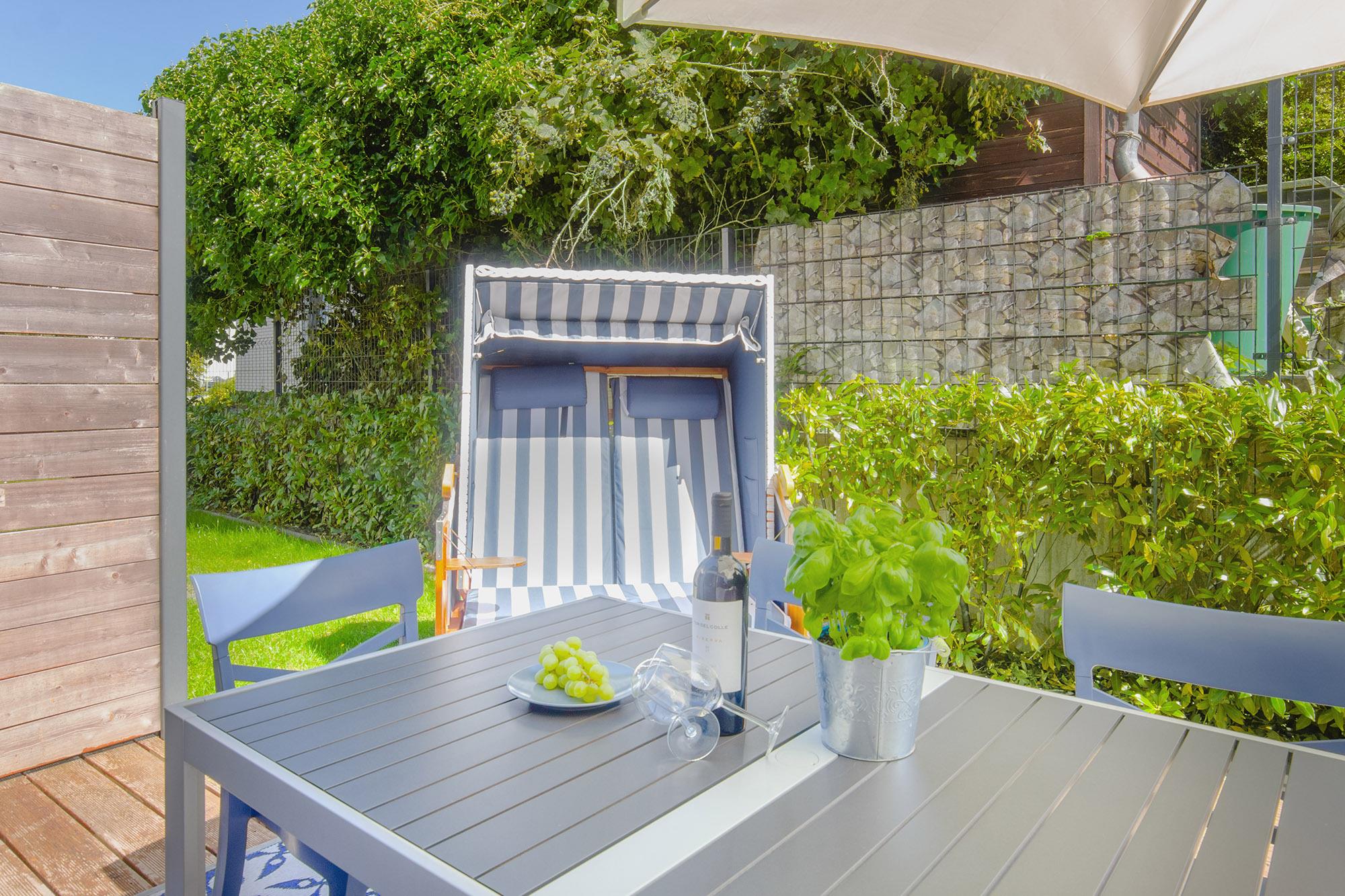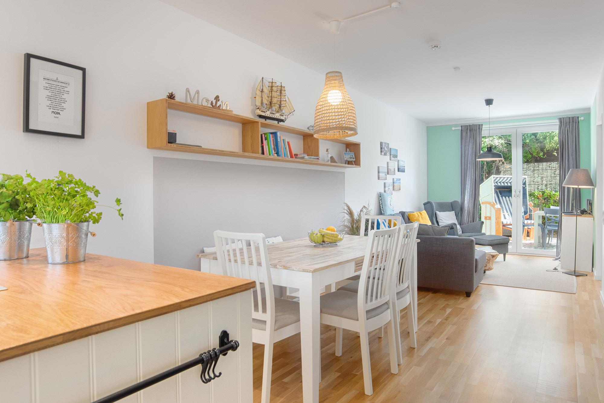 Die helle, modern eingerichtete Ferienwohnung ist ideal für Gäste, die Erholung und Entspannung suchen. Auf rund 60 Quadratmetern im barrierearmen Erdgeschoss finden bis zu zwei Erwachsene und zwei Kinder ausreichend Platz. Das maritime Flair und die geschmackvolle Einrichtung sorgen für eine einladende Atmosphäre. Der offene Wohnbereich mit Laminatboden bietet direkten Zugang zur möblierten Terrasse mit Strandkorb und großzügigem Sitzbereich. Dank bodentiefer Fenster gelangt viel Tageslicht in die Wohnung, während die Ostausrichtung der Terrasse bis zum frühen Nachmittag Sonne garantiert.