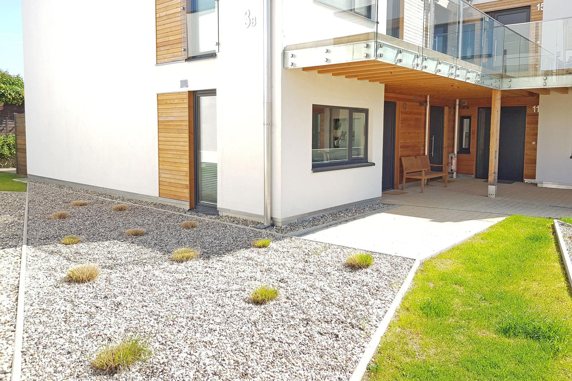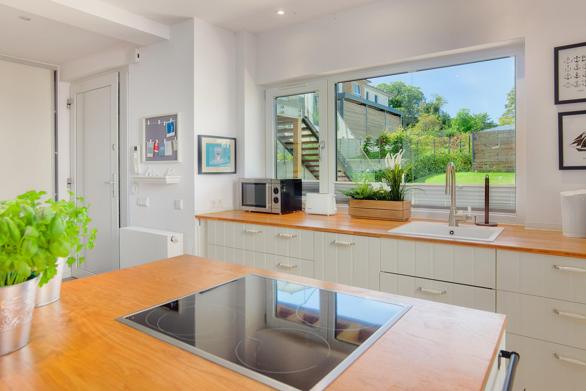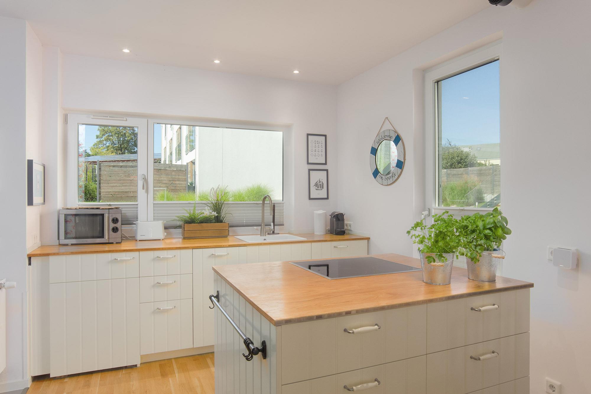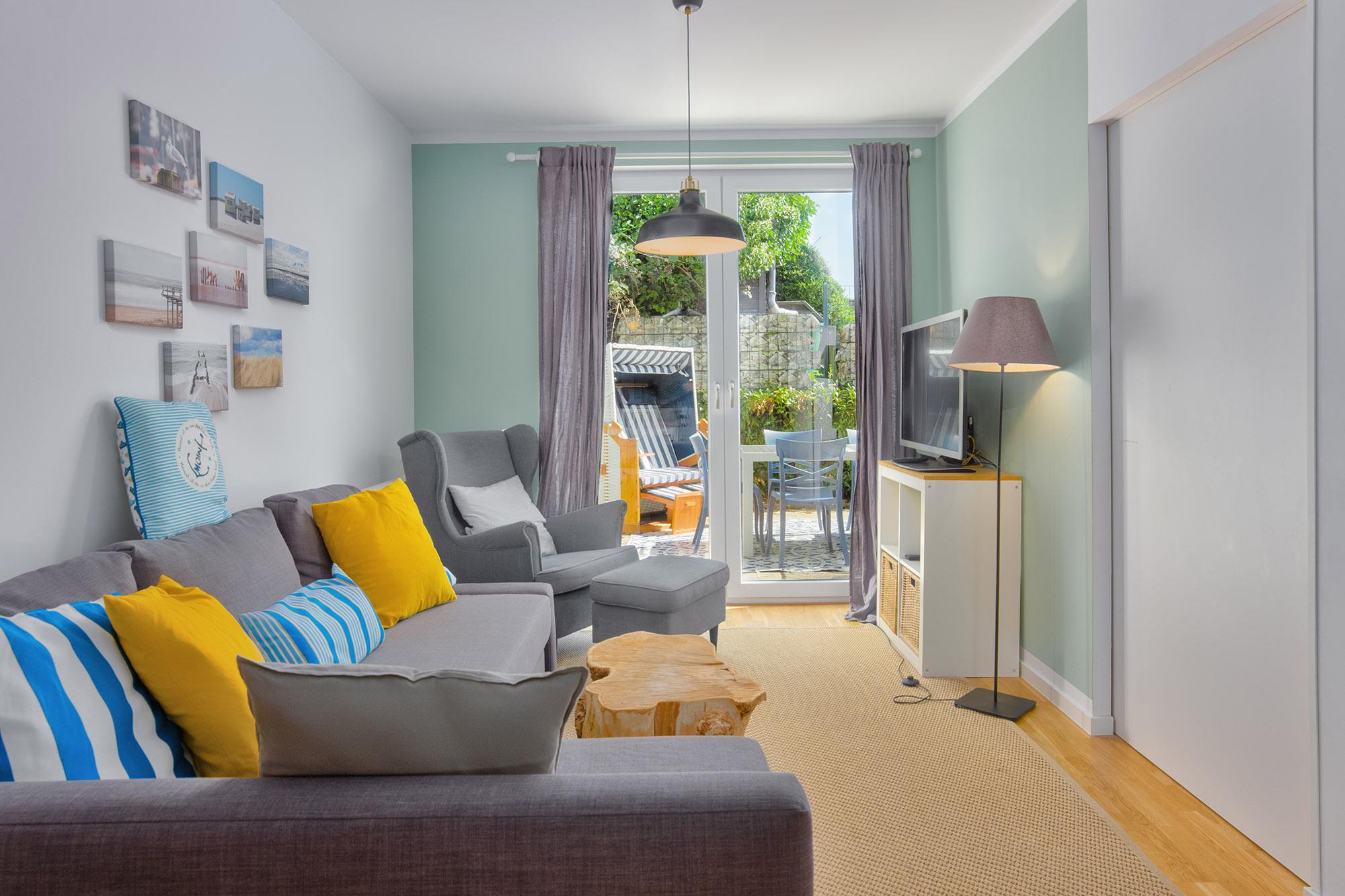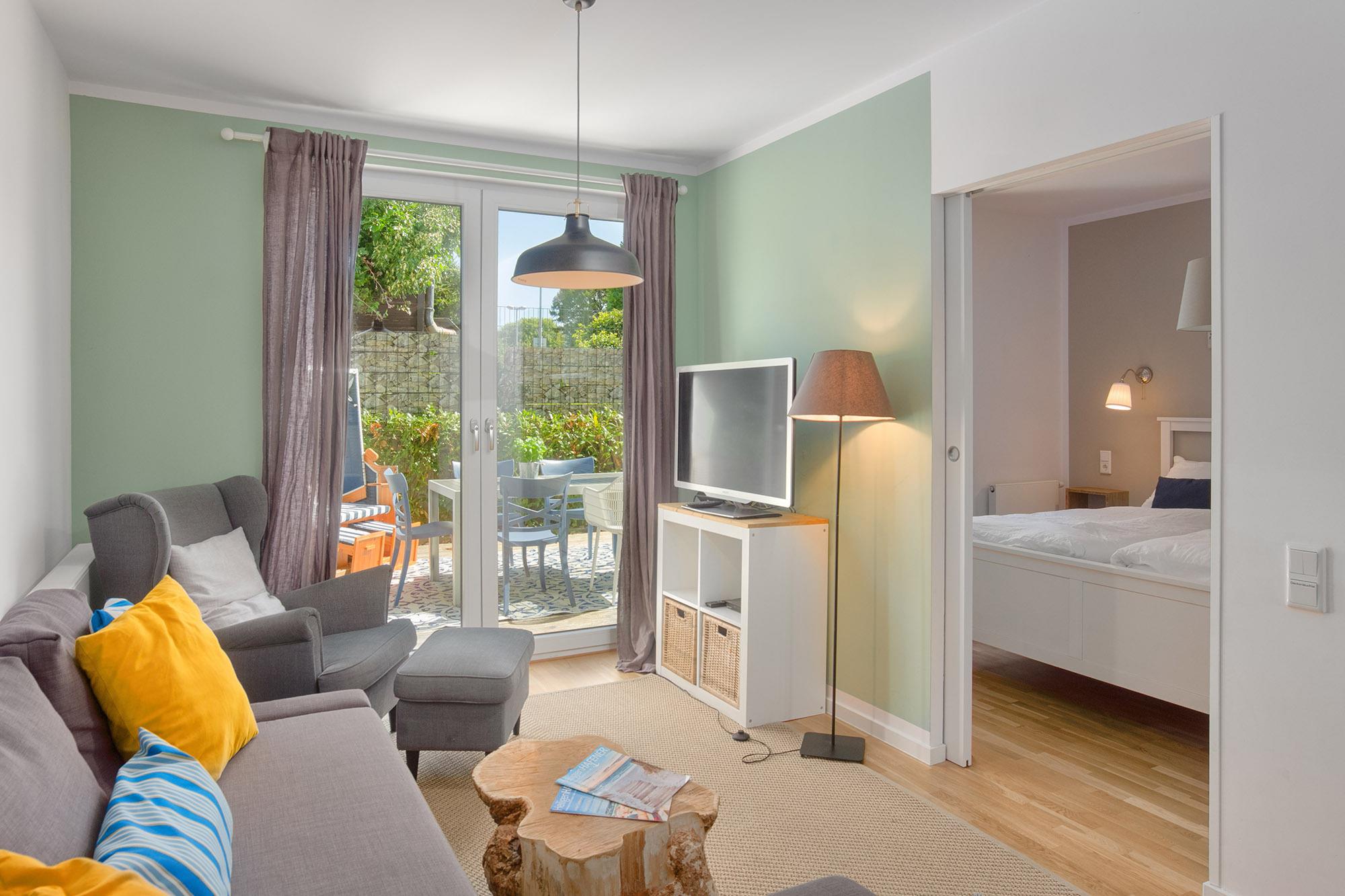 Die helle, modern eingerichtete Ferienwohnung ist ideal für Gäste, die Erholung und Entspannung suchen. Auf rund 60 Quadratmetern im barrierearmen Erdgeschoss finden bis zu zwei Erwachsene und zwei Kinder ausreichend Platz. Das maritime Flair und die geschmackvolle Einrichtung sorgen für eine einladende Atmosphäre. Der offene Wohnbereich mit Laminatboden bietet direkten Zugang zur möblierten Terrasse mit Strandkorb und großzügigem Sitzbereich. Dank bodentiefer Fenster gelangt viel Tageslicht in die Wohnung, während die Ostausrichtung der Terrasse bis zum frühen Nachmittag Sonne garantiert.