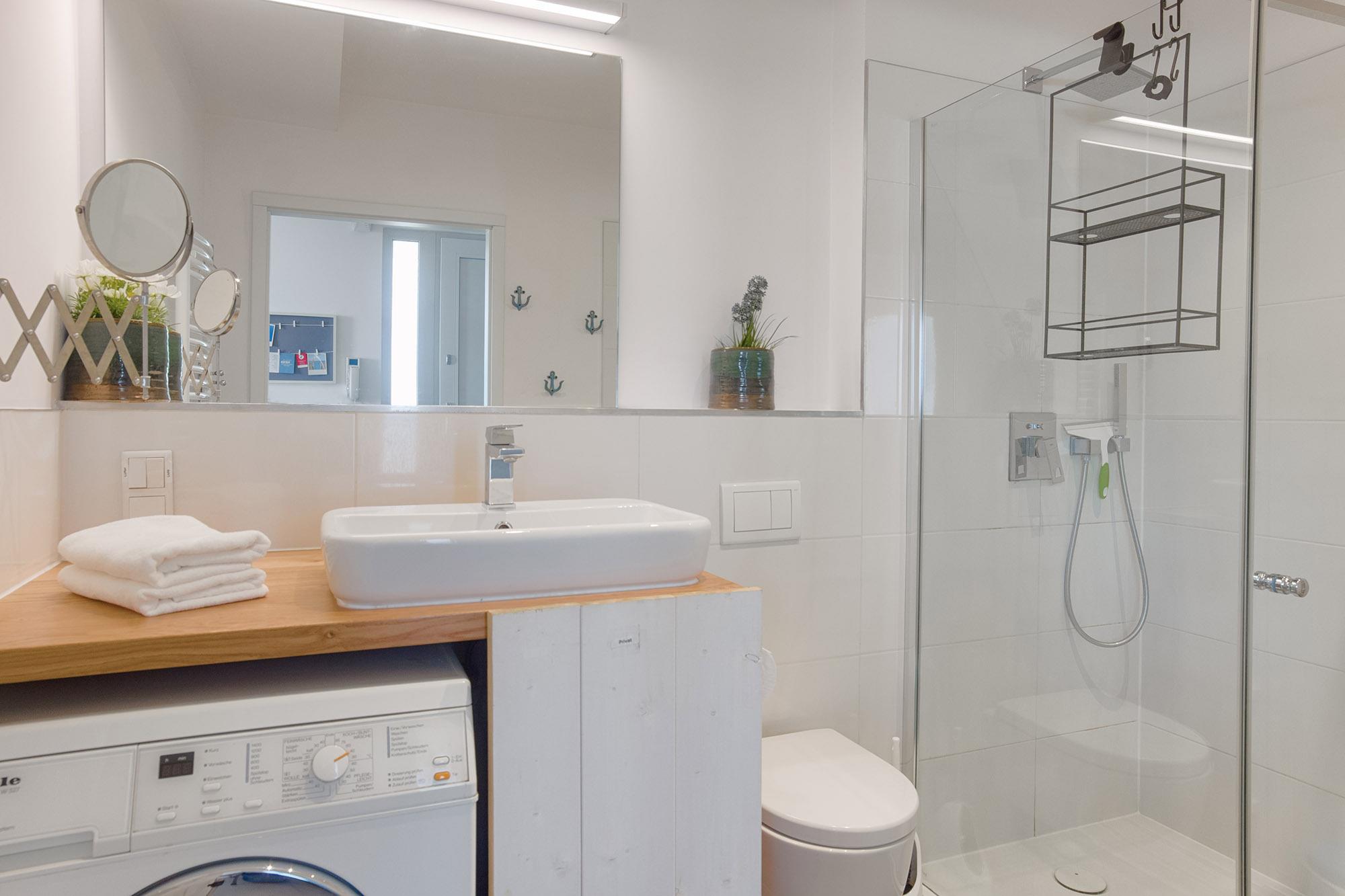 Das moderne Badezimmer ist mit einer ebenerdigen Dusche inklusive Rain-Shower-Funktion, WC, Föhn, Handtuchwärmer und Waschmaschine ausgestattet. Die offene Küche mit Induktionsherd und Spülmaschine lässt keine Wünsche offen, der angrenzende Essbereich lädt zu geselligen Mahlzeiten ein. Im Flur gibt es zusätzlichen Stauraum, und Koffer können platzsparend unter dem Alkoven verstaut werden.