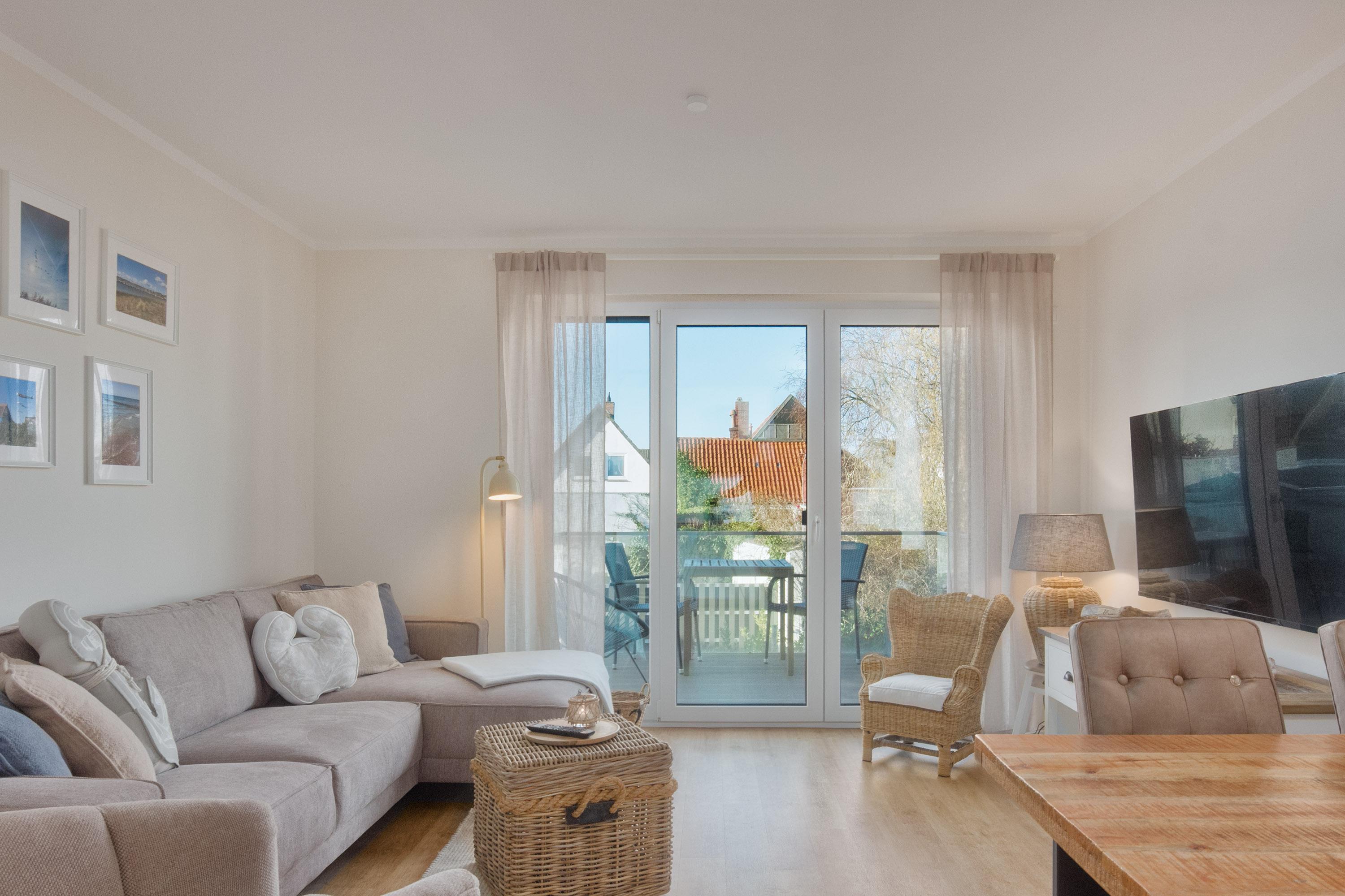 Zu den weiteren Ausstattungsmerkmalen gehören ein möblierte Balkon und ein gemeinschaftlich nutzbarer, offener Gartenbereich. Der Balkon der Wohnung schließt direkt an den Wohnbereich an. Dieser lädt dazu ein, den Tag mit einer Tasse Kaffee an der frischen Seeluft zu beginnen oder laue Sommerabende entspannt ausklingen zu lassen.