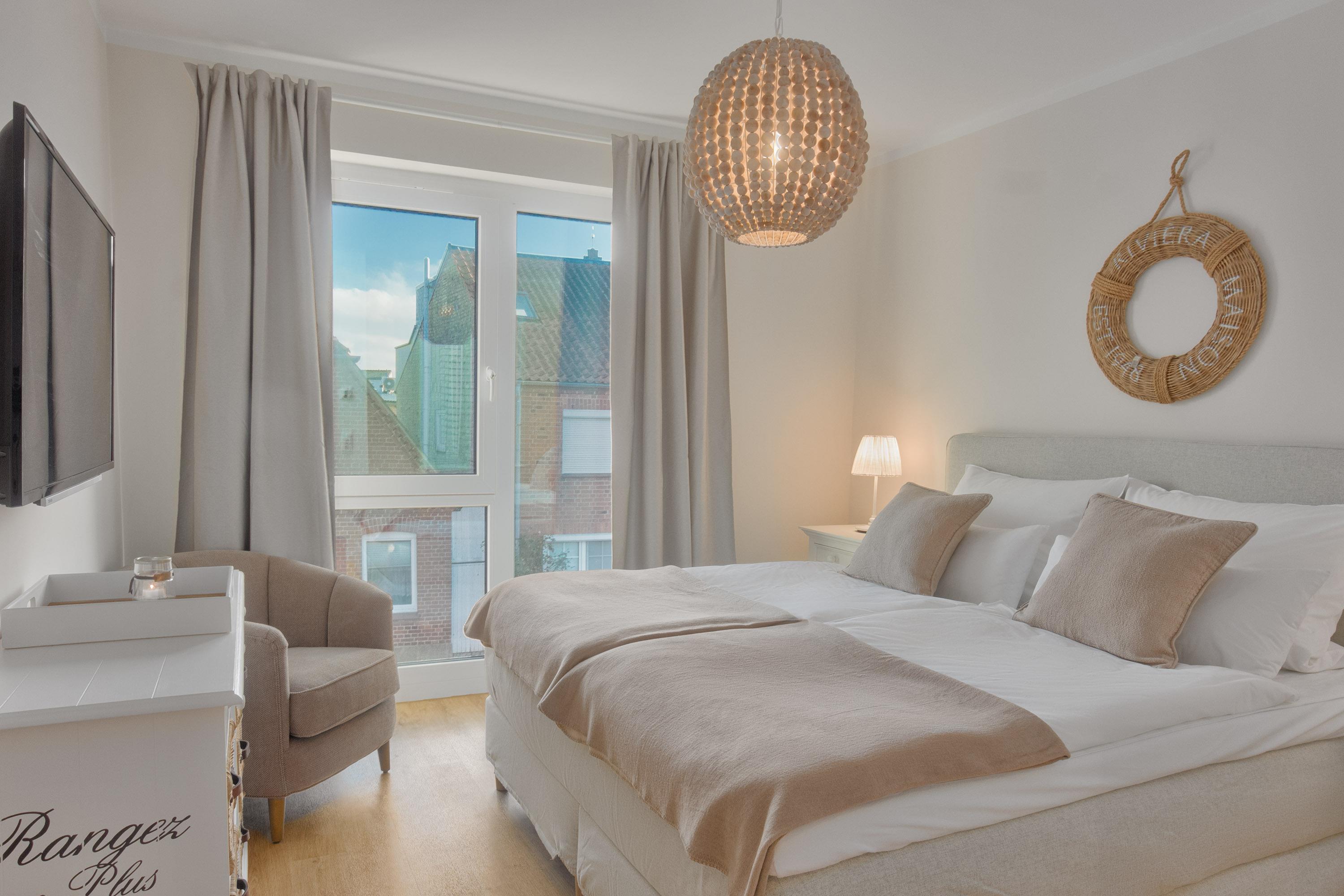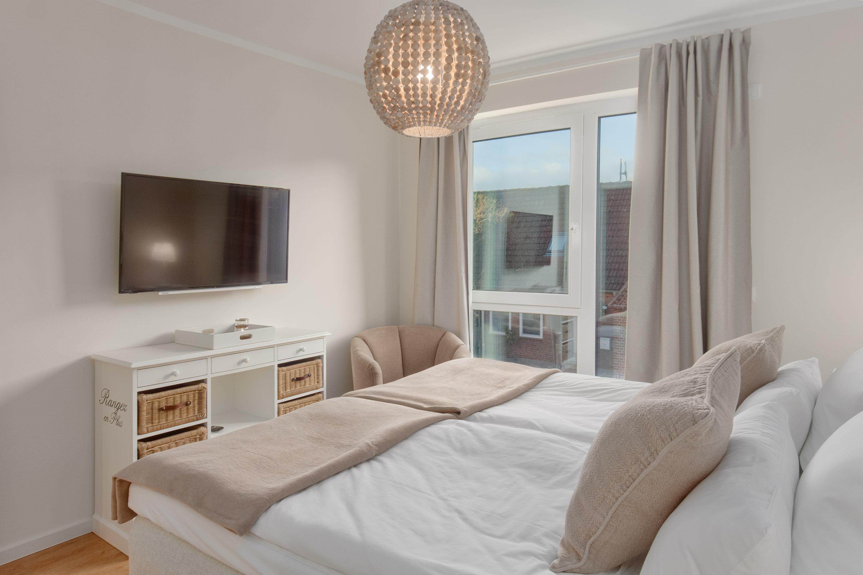 Ebenso komfortabel geht es im ersten Schlafzimmer der Wohnung weiter. Hier wartet ein einladendes Doppelboxspringbett (180x200) und TV. Das zweite Schlafzimmer hat ein Etagenbett (90x200, maximal 120kg je Liegefläche, optimal für Kinder).