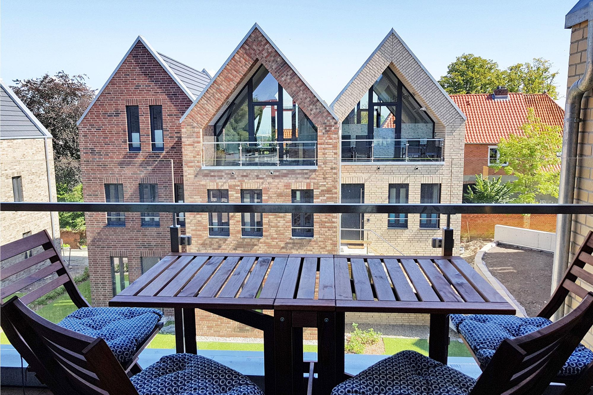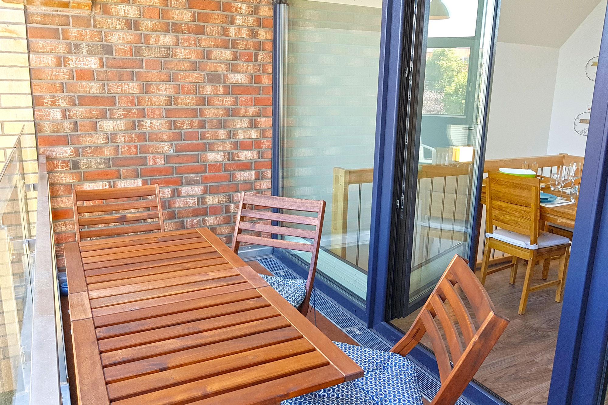 Die bodentiefen Fenster lassen viel Tageslicht herein und bieten vom Wohnbereich aus einen herrlichen Blick auf den möblierten Balkon. Hier können Sie mit einer Tasse Kaffee den Tag beginnen oder abends bei einem Glas Wein den Sonnenuntergang genießen. Die frische Meeresbrise und das sanfte Rauschen der Wellen machen jeden Moment auf dem Balkon zu einem kleinen Urlaub für die Seele.