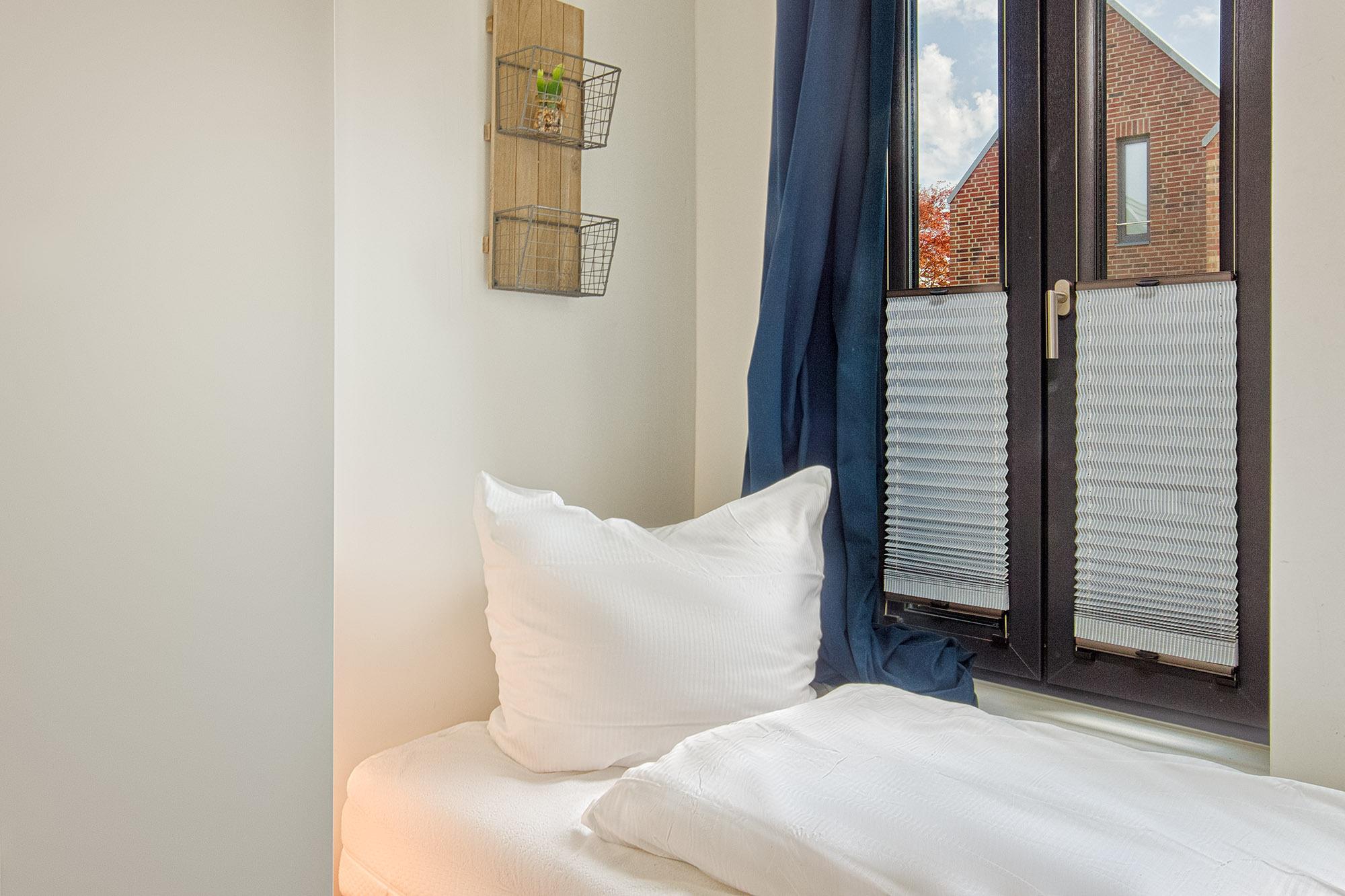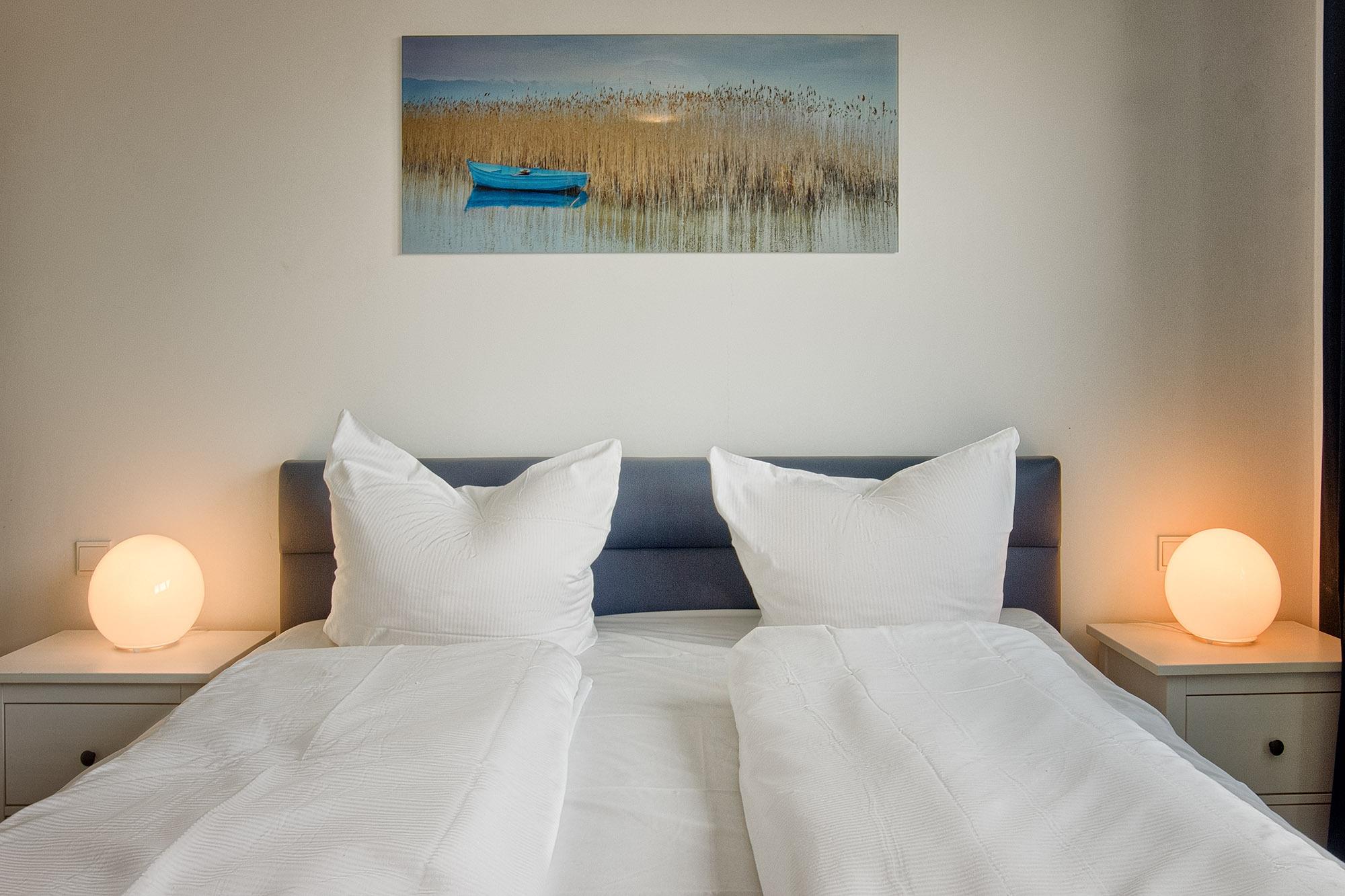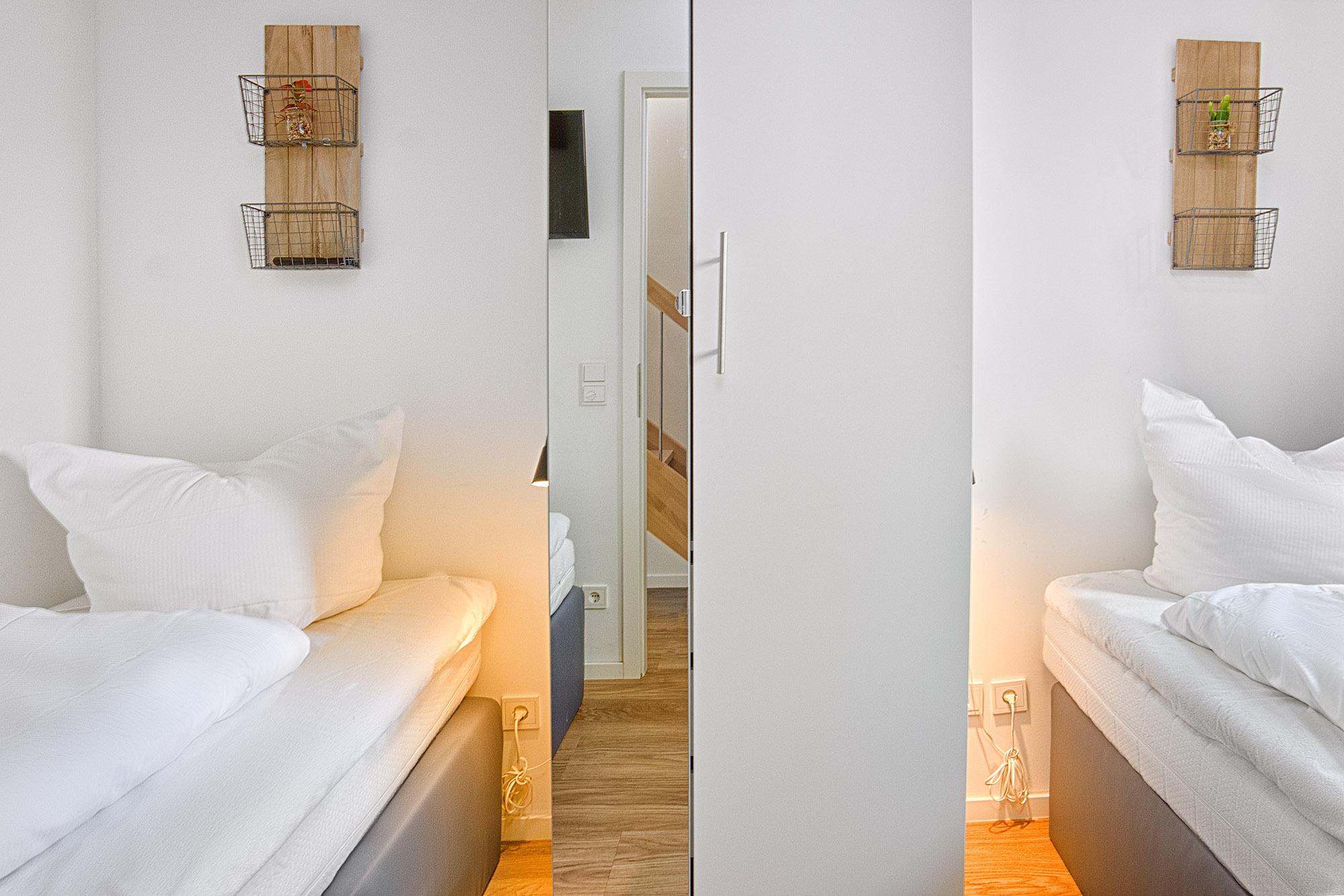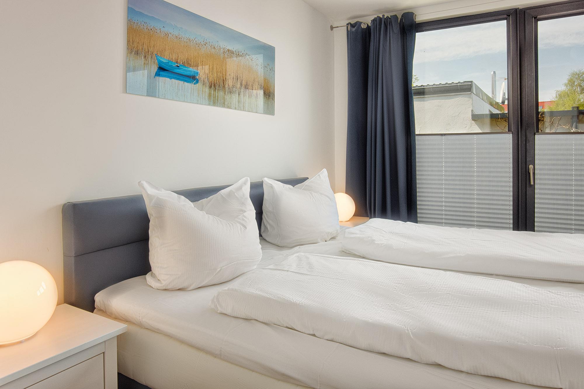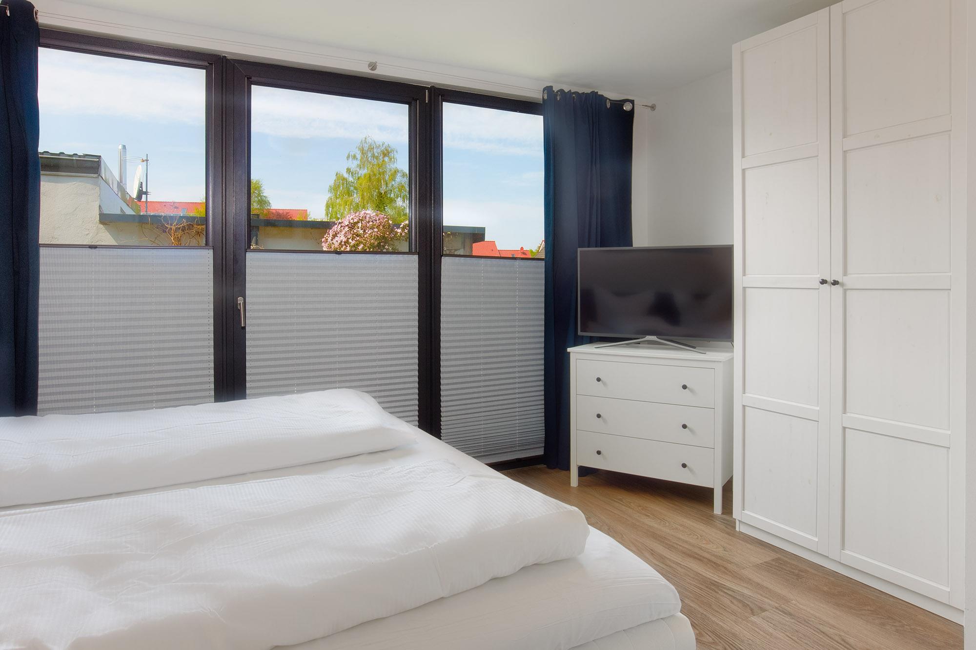 Die Jakobskoje verfügt über zwei Schlafzimmer, die sich im unteren Bereich der Wohnung befinden. Das Hauptschlafzimmer ist mit einem komfortablen Doppel-Boxspringbett ausgestattet, während das zweite Schlafzimmer über zwei gemütliche Einzel-Boxspringbetten verfügt. Die großen Fensterfronten sorgen für eine helle und freundliche Atmosphäre, während blickdichte Vorhänge und Plissees für Verdunklung und erholsamen Schlaf sorgen.