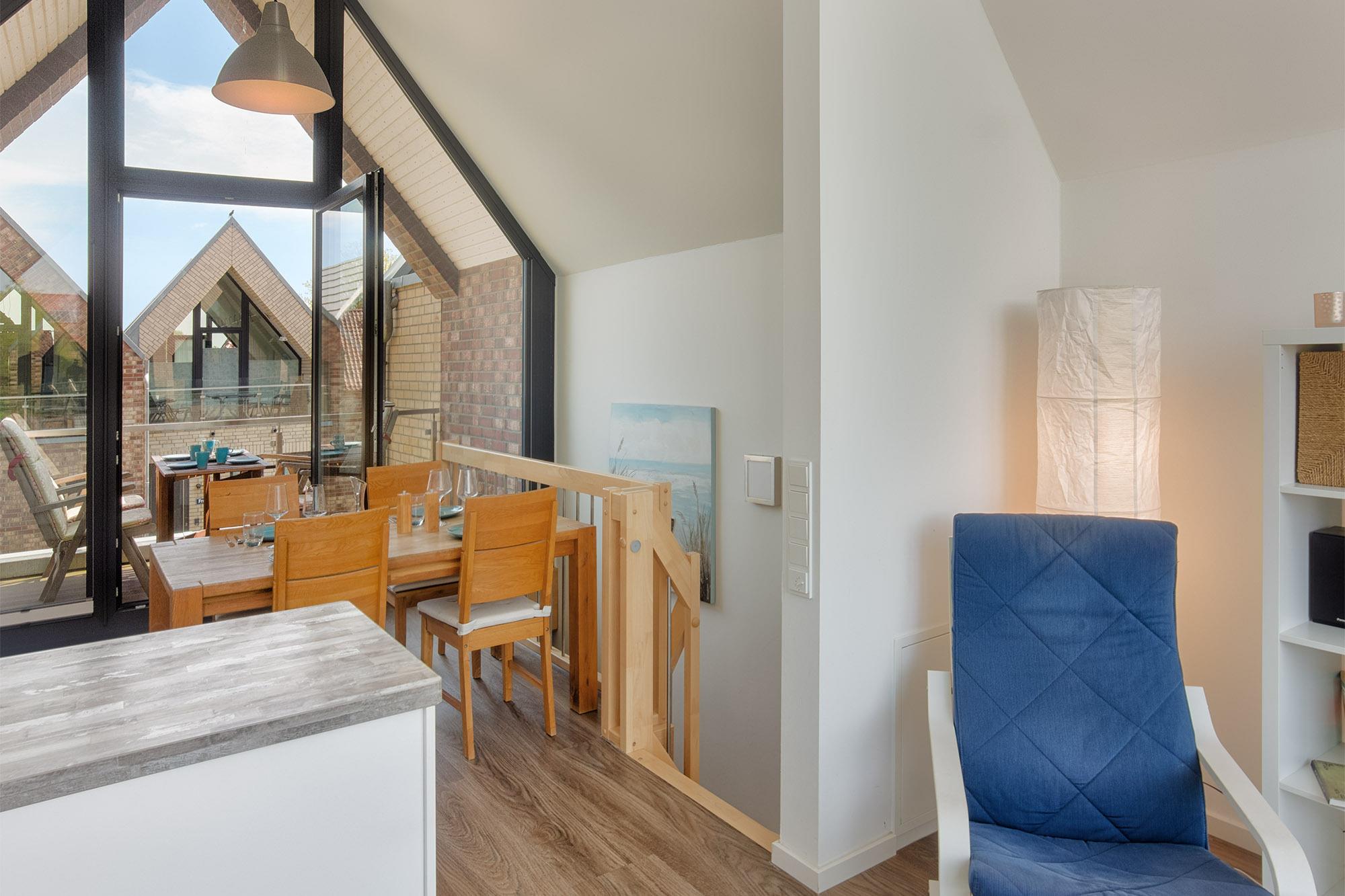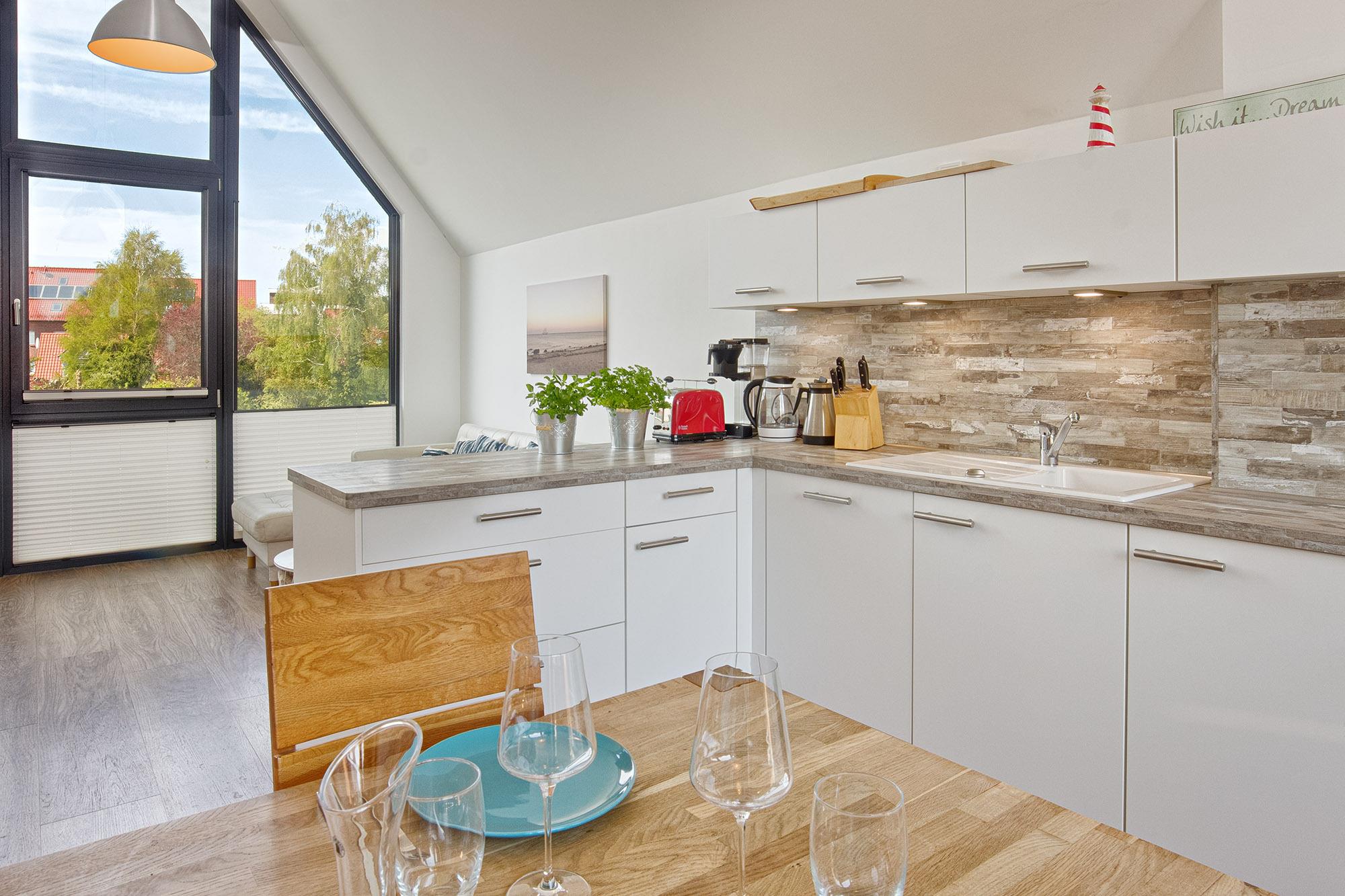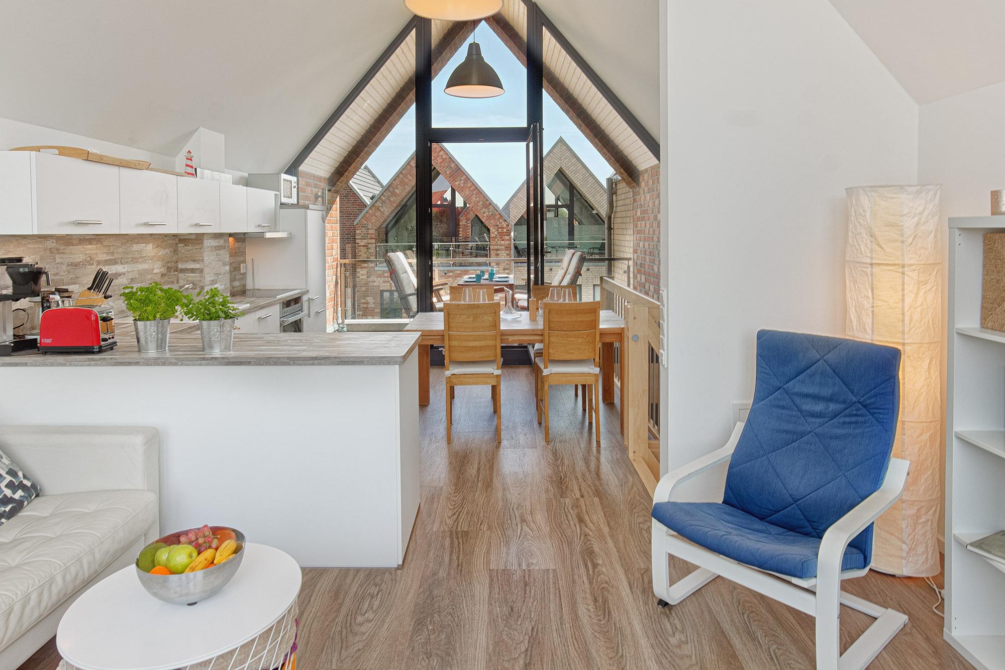 Über eine innenliegende Treppe gelangen Sie ins Dachgeschoss, wo sich der großzügige Wohnbereich mit angrenzender offener Küche befindet. Die voll ausgestattete Küche verfügt über einen Geschirrspüler, einen modernen Ceranherd und zahlreiche weitere Annehmlichkeiten, sodass Sie sich auch im Urlaub bequem selbst versorgen können. Direkt angeschlossen ist der gemütliche Essbereich, der mit seinem maritimen Stil perfekt in das Gesamtkonzept der Wohnung passt.