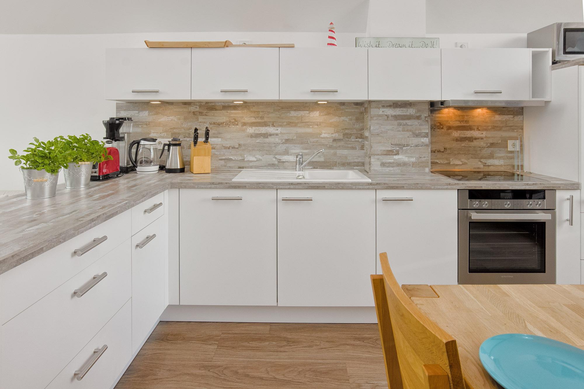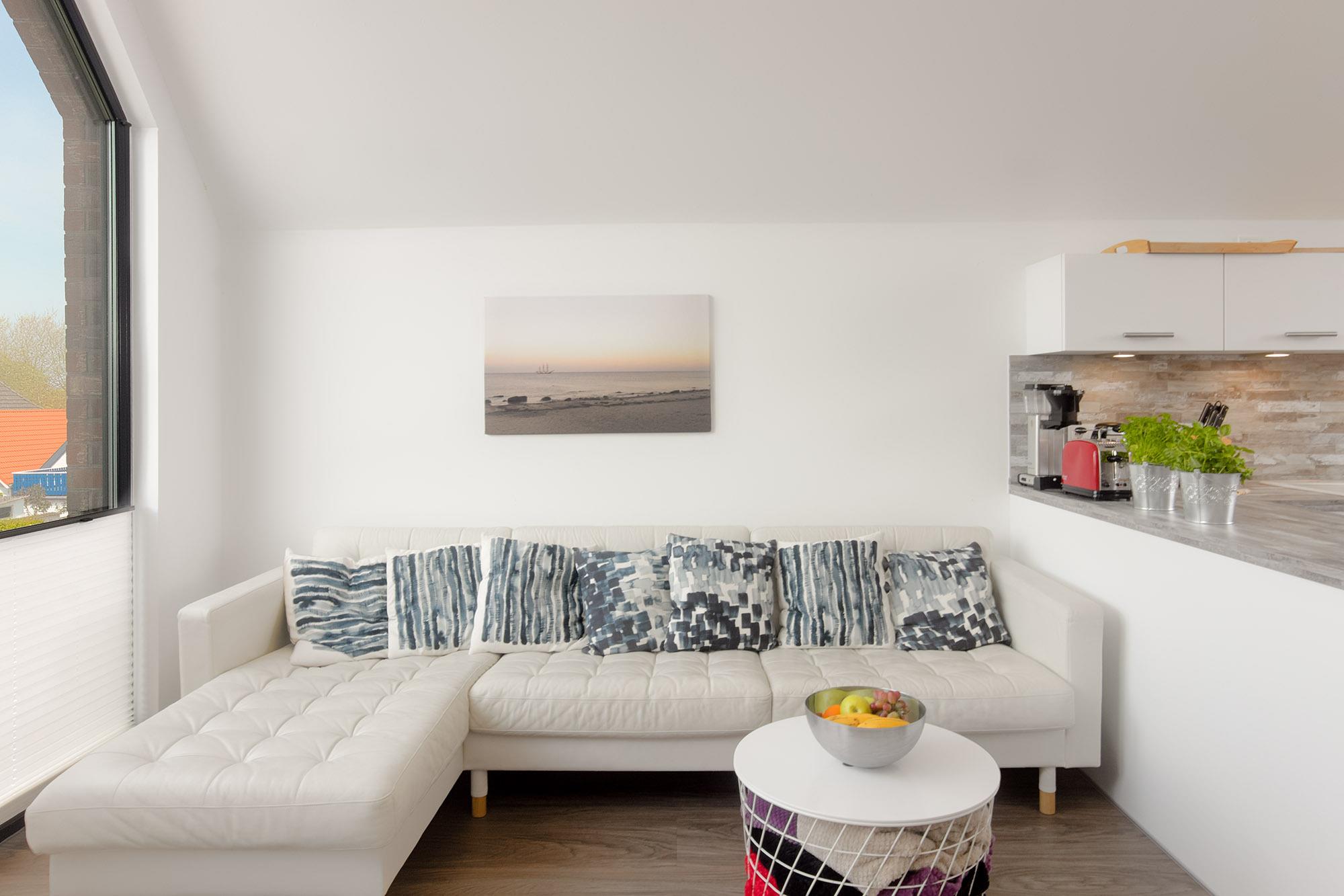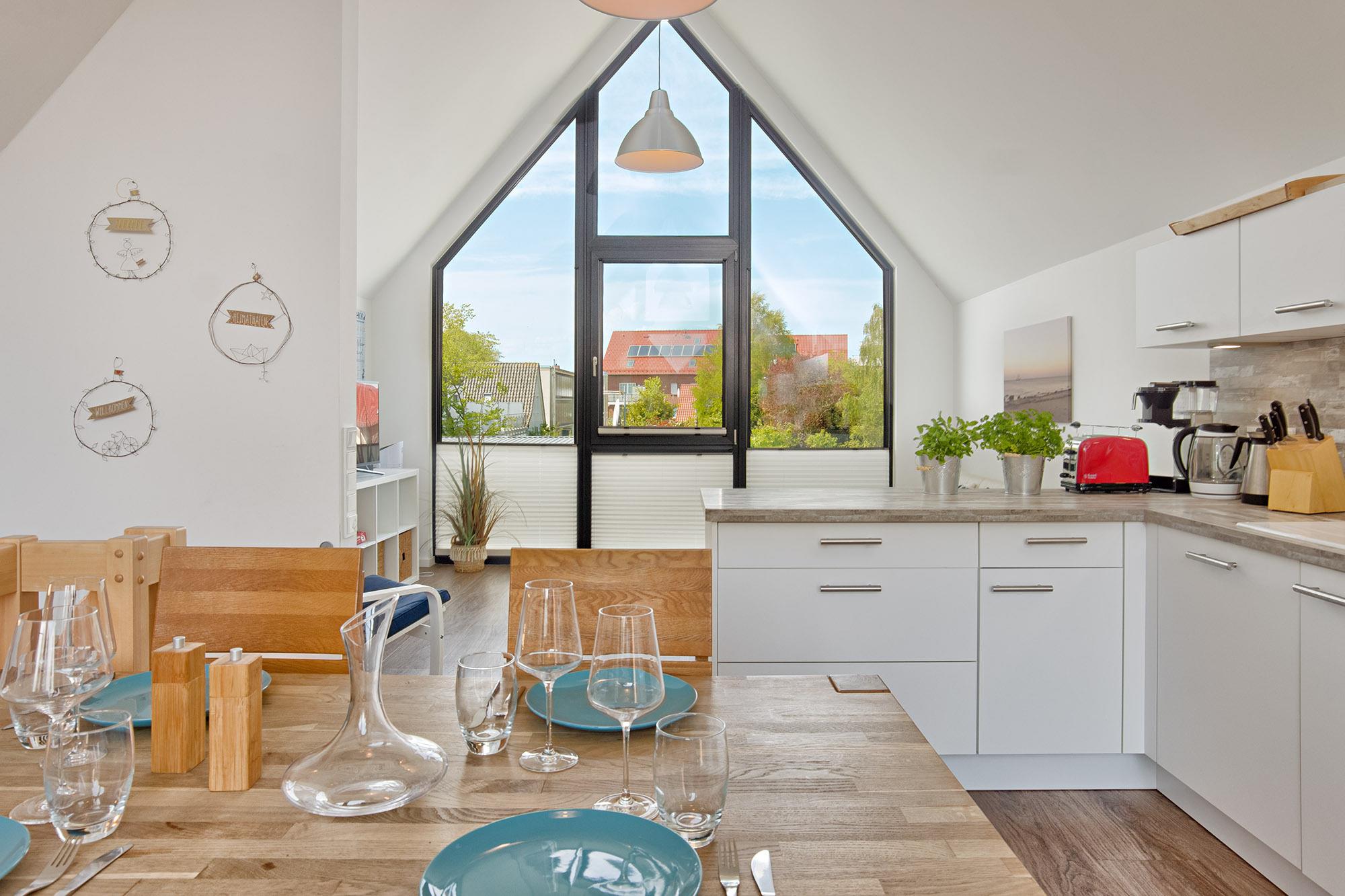 Über eine innenliegende Treppe gelangen Sie ins Dachgeschoss, wo sich der großzügige Wohnbereich mit angrenzender offener Küche befindet. Die voll ausgestattete Küche verfügt über einen Geschirrspüler, einen modernen Ceranherd und zahlreiche weitere Annehmlichkeiten, sodass Sie sich auch im Urlaub bequem selbst versorgen können. Direkt angeschlossen ist der gemütliche Essbereich, der mit seinem maritimen Stil perfekt in das Gesamtkonzept der Wohnung passt.