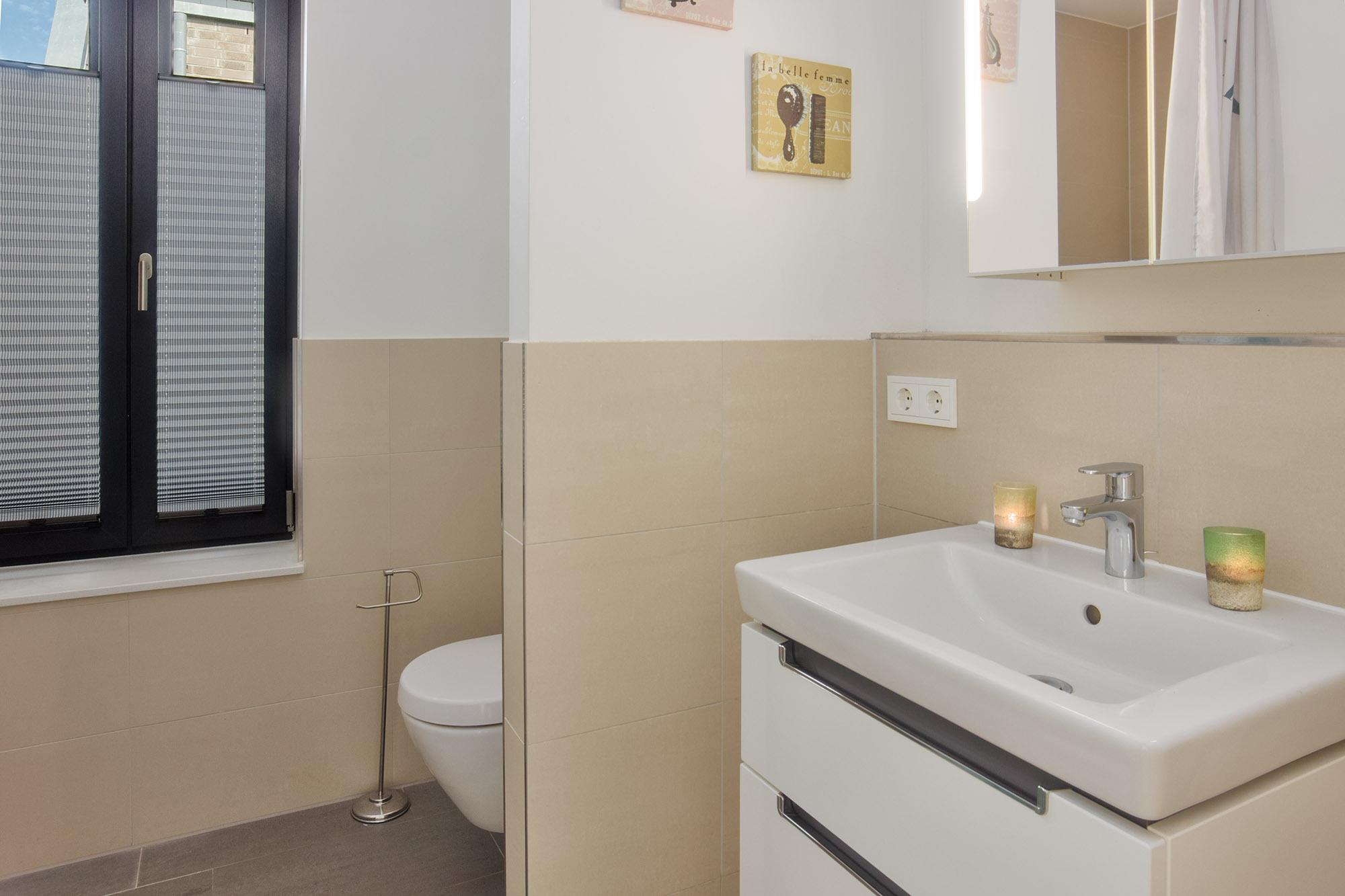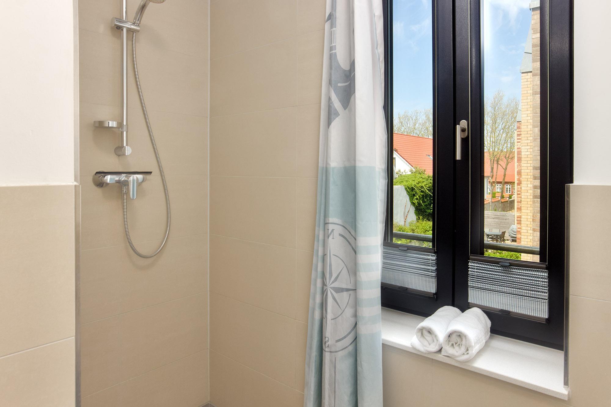 Ein modernes Badezimmer mit ebenerdiger Dusche, Waschbecken und WC steht Ihnen ebenfalls zur Verfügung – ideal für eine erfrischende Dusche nach einem Tag am Strand. Im Flur gibt es unter der Treppe zudem einen kleinen Abstellraum, der zusätzlichen Stauraum für Ihre persönlichen Dinge bietet.