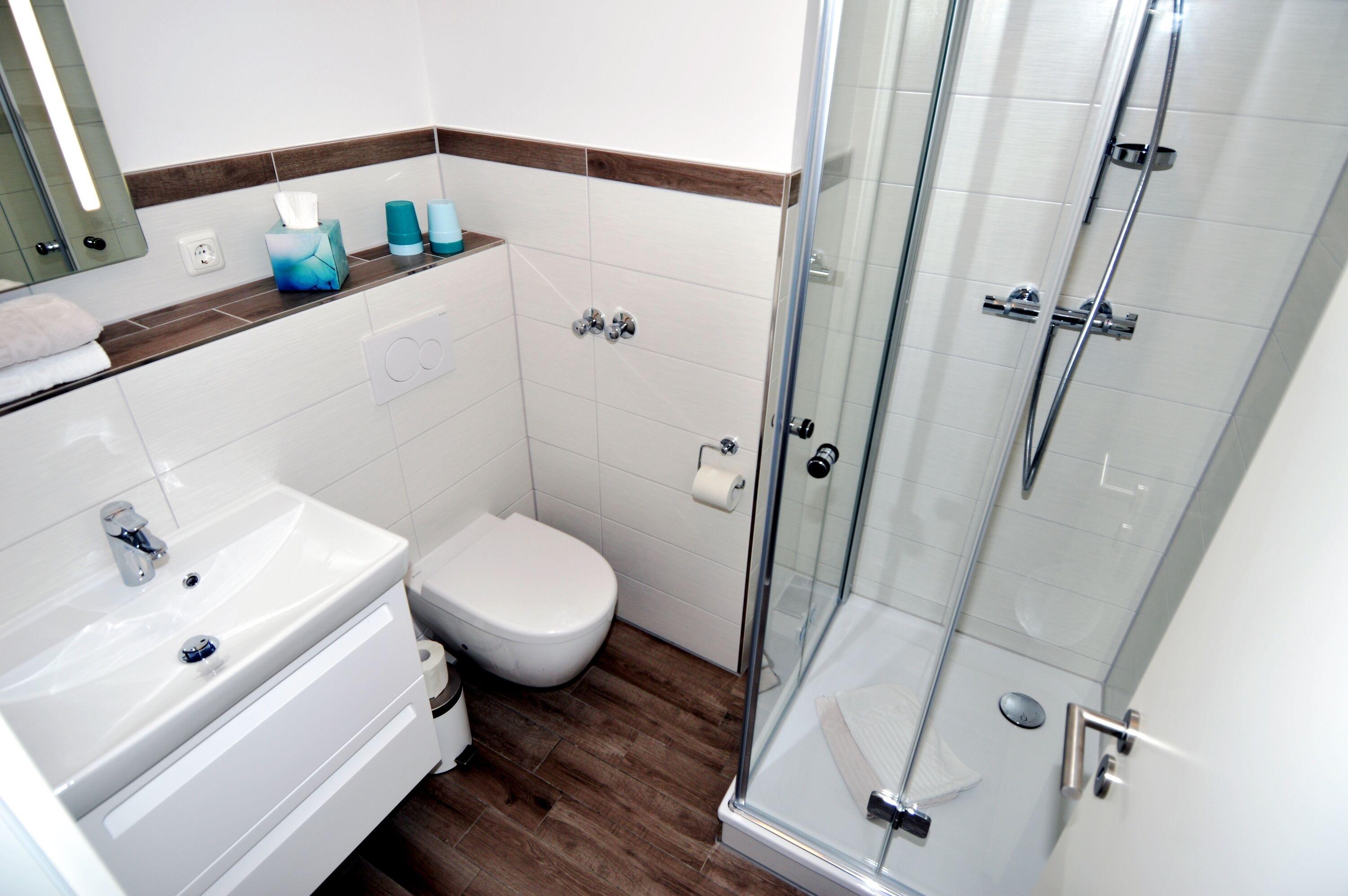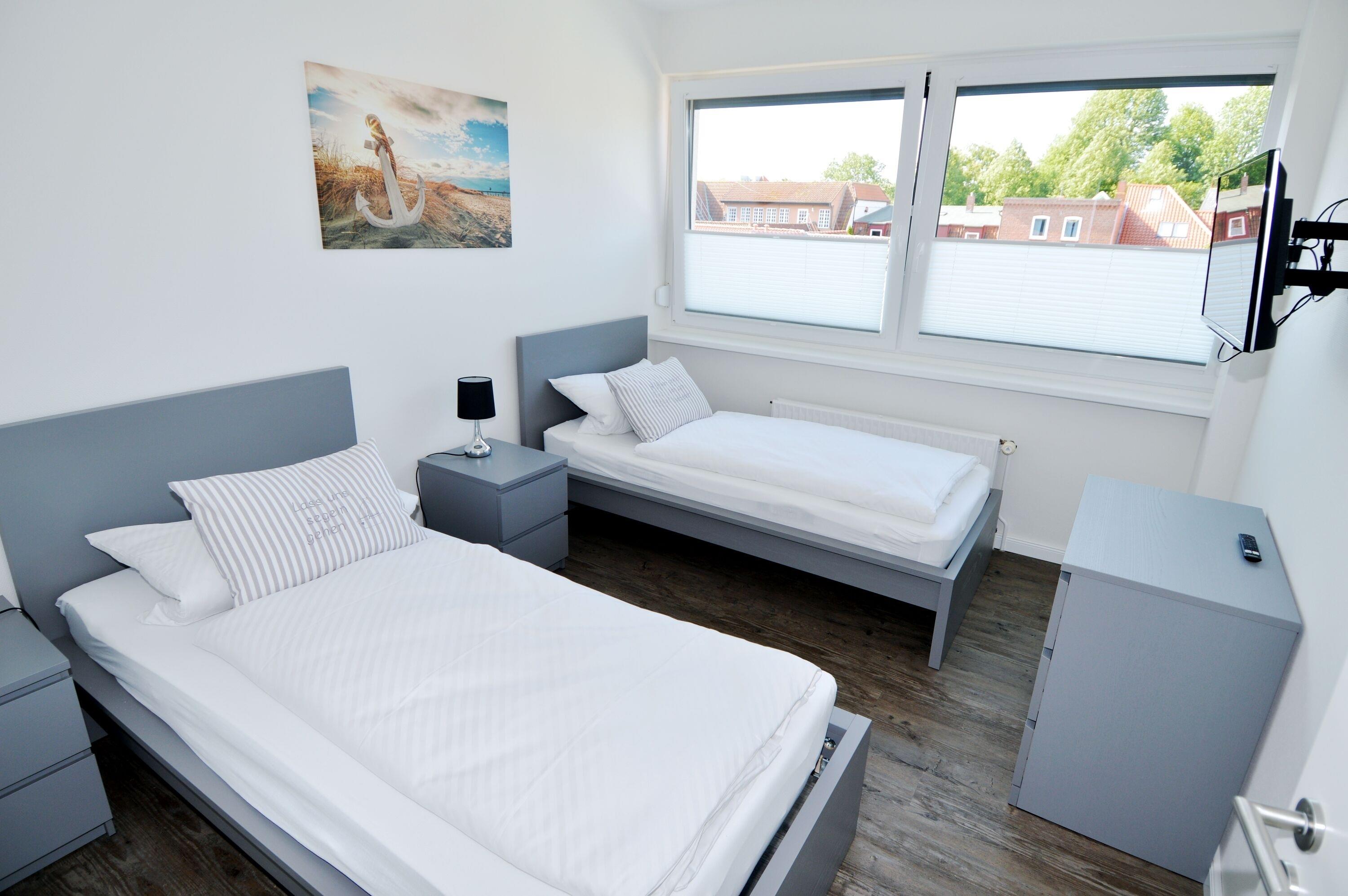 2 separate Schlafzimmer, einen großzügiges Wohn- und Esszimmer und ein Bad mit Dusche. Von den Schlafzimmern blicken sie in Richtung Kirche, vom Wohnzimmer über den Hafenvorplatz zum Yachthafen.