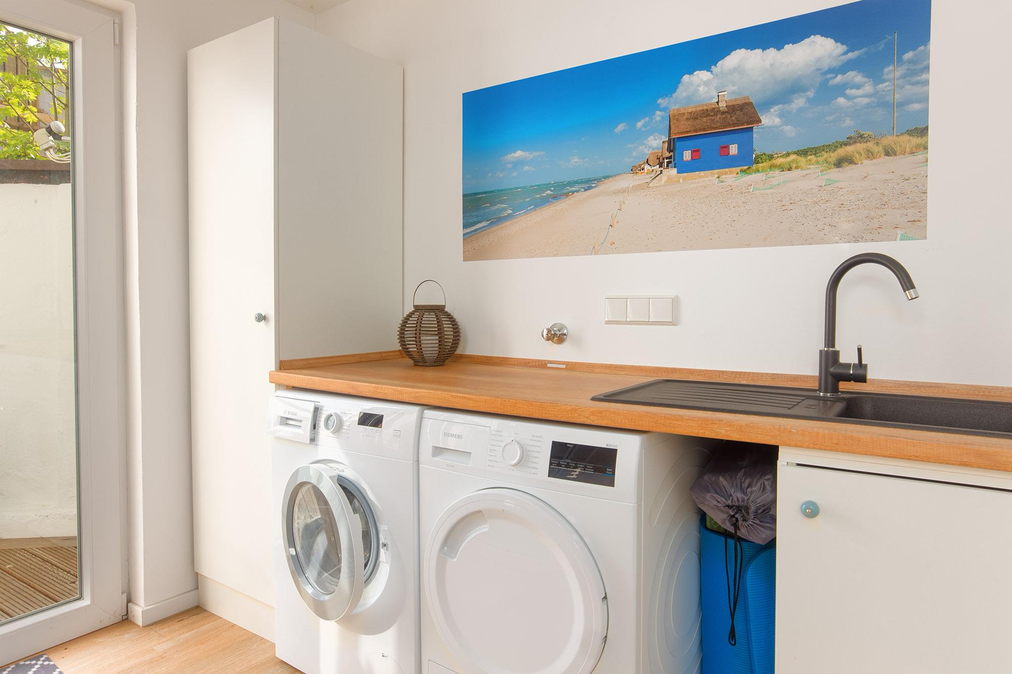 Im separaten Anbau der Terrasse befinden sich eine Waschmaschine und ein Trockner, sowie als Besonderheit für Wellness-Komfort eine Infrarot-Vollspektrum-Sauna zur Nutzung (gegen Gebühr).