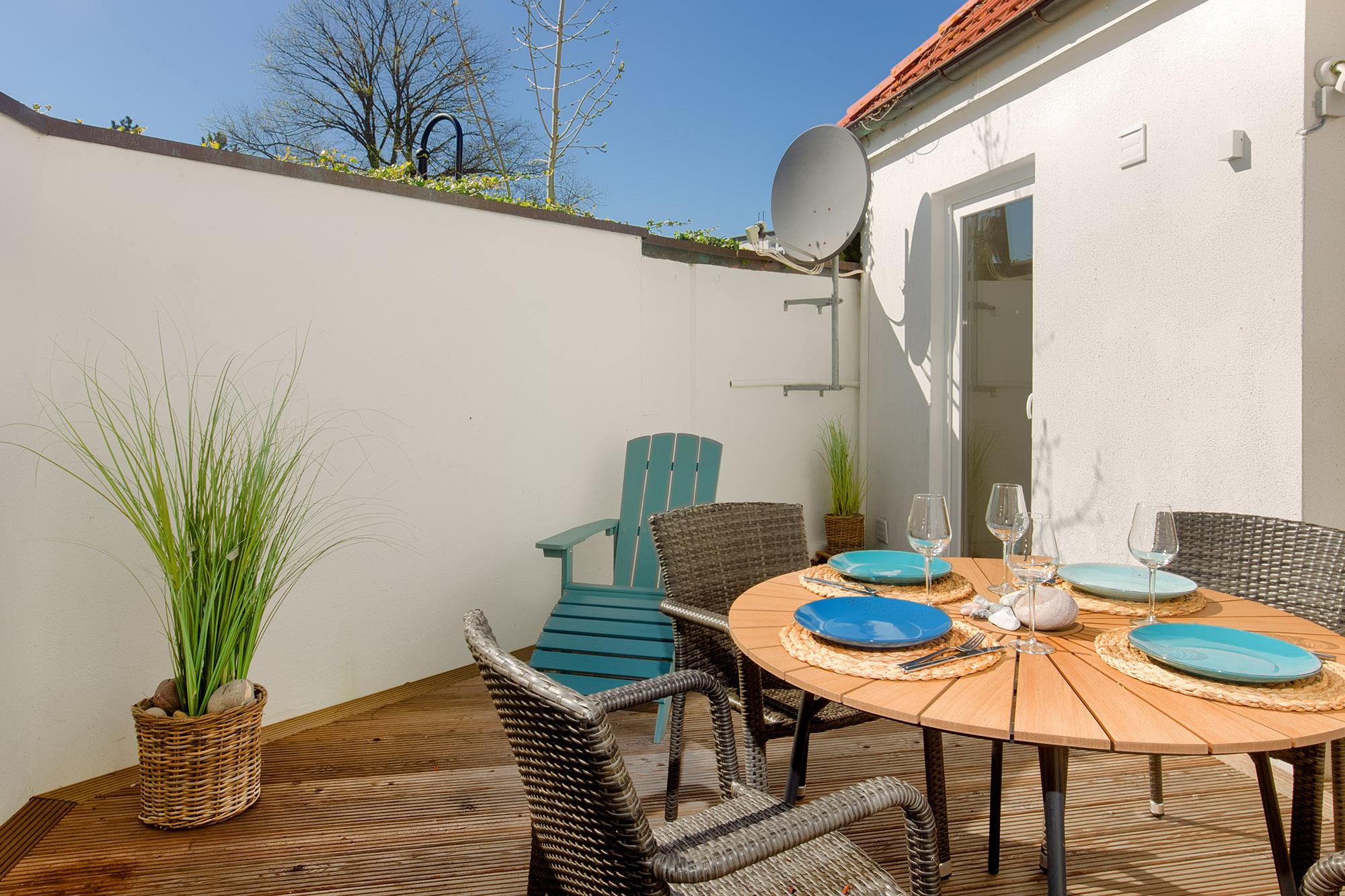 Vom Wohnzimmer aus geht es auf die schöne, möblierte Terrasse in Südwest-Lage, umgeben mit einer weißen Sichtschutzmauer. Somit bietet sich auch im Stadtzentrum eine weitere Oase der Ruhe.