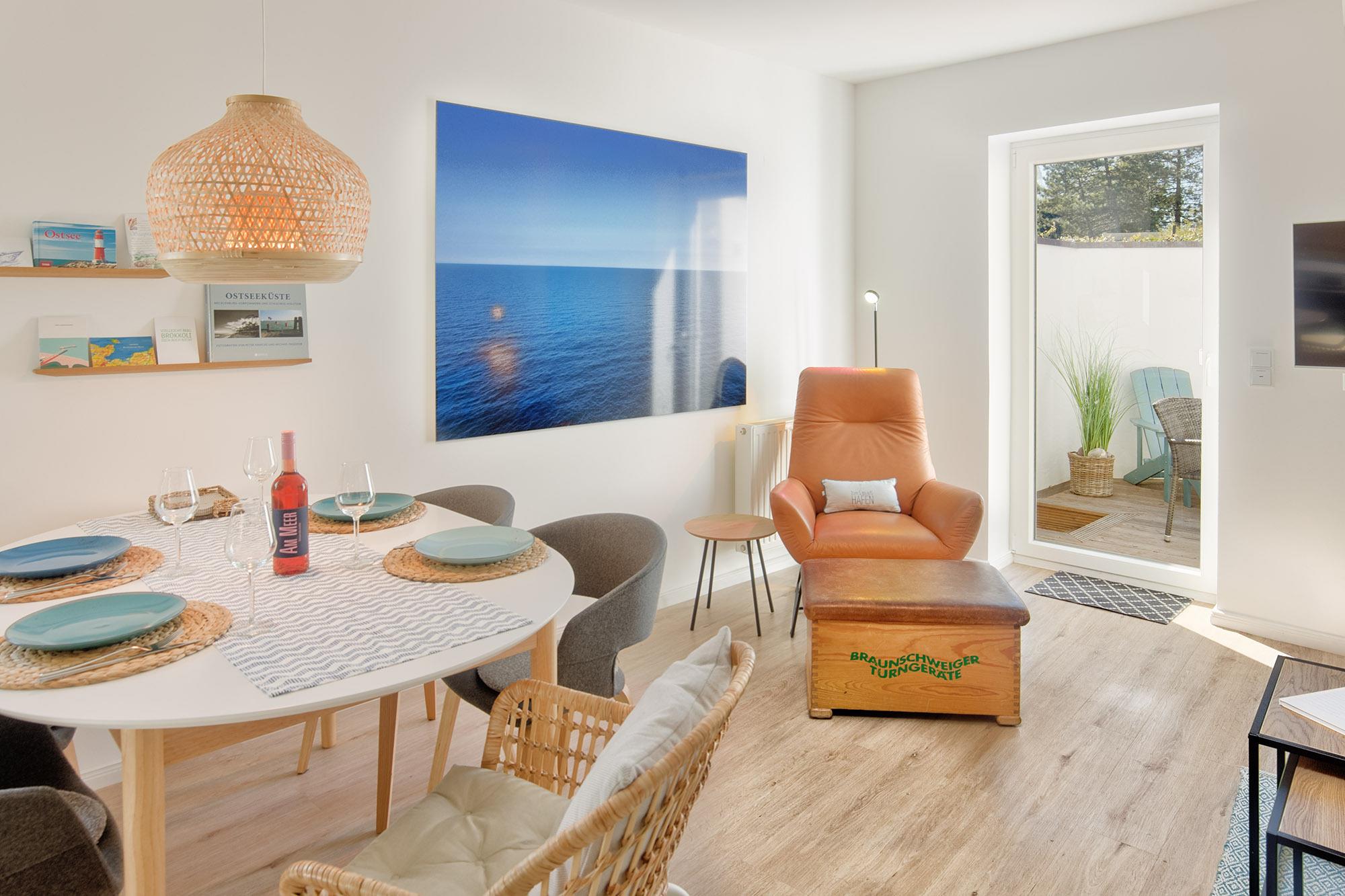 Komfort für Gäste steht hierbei im Vordergrund. Auf ca. 68 qm Wohnfläche ist für den bequemen Aufenthalt genug Raum für einen entspannten Urlaub. LilleHavn ist liebevoll und wertig eingerichtet. Der Wohn- und Essbereich ist großzügig offen gehalten und bietet mit dem gemütlichen Sofa und einem Ledersessel Platz zum Relaxen. Selbstverständlich ist die Wohnung mit Fernsehern, WLAN und Radio/Bluetooth ausgestattet.