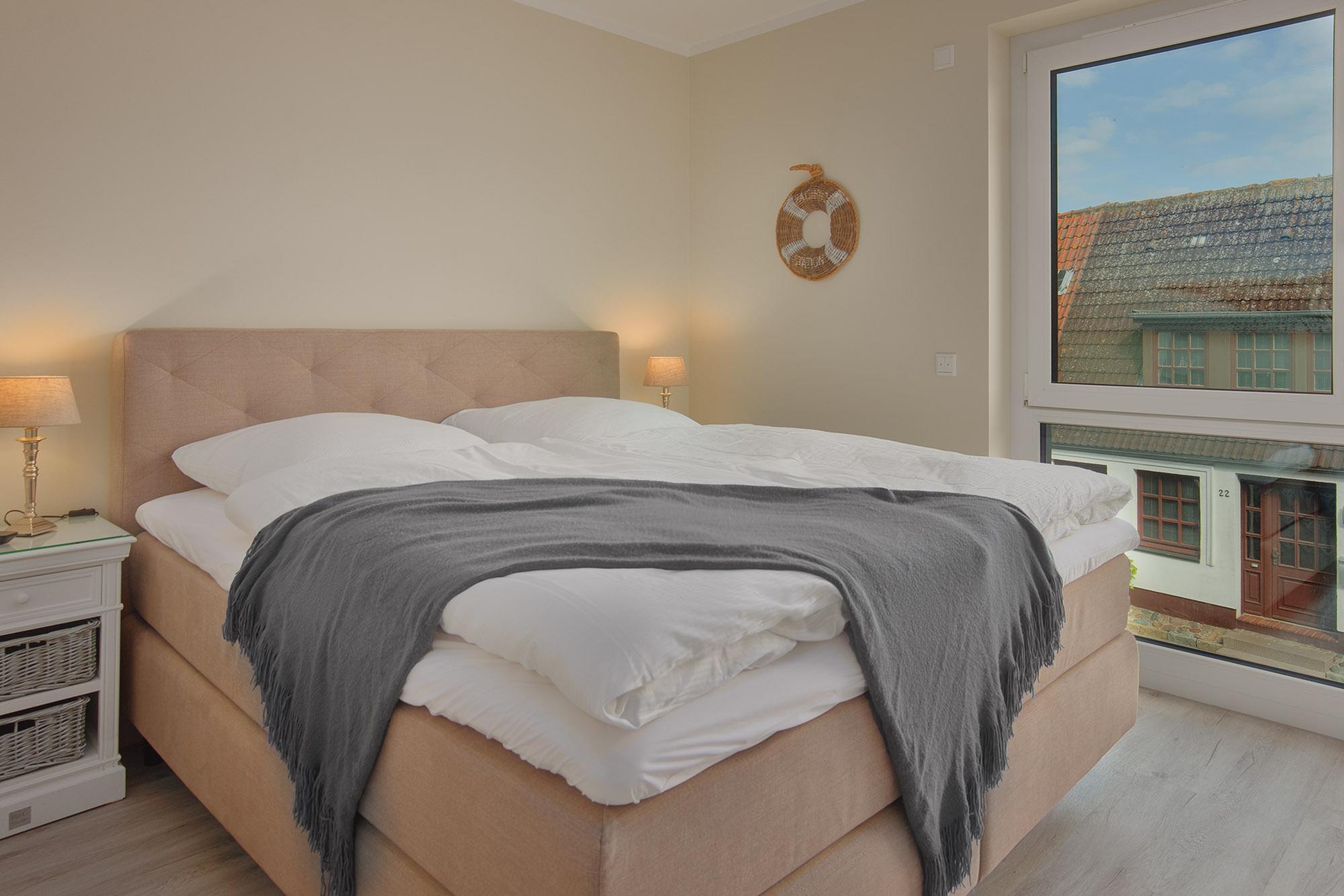 Ebenso komfortabel geht es in den zwei Schlafzimmern der Wohnung weiter. Hier erwarten Sie Doppelboxspringbetten (180x200) und ein kleinere Variante (140x200).