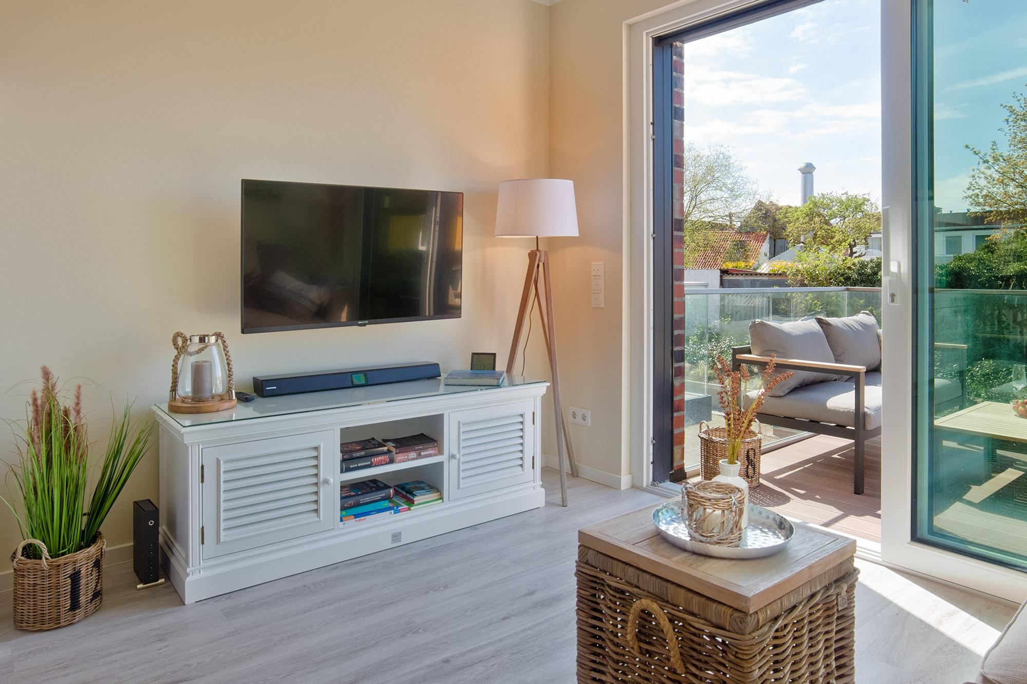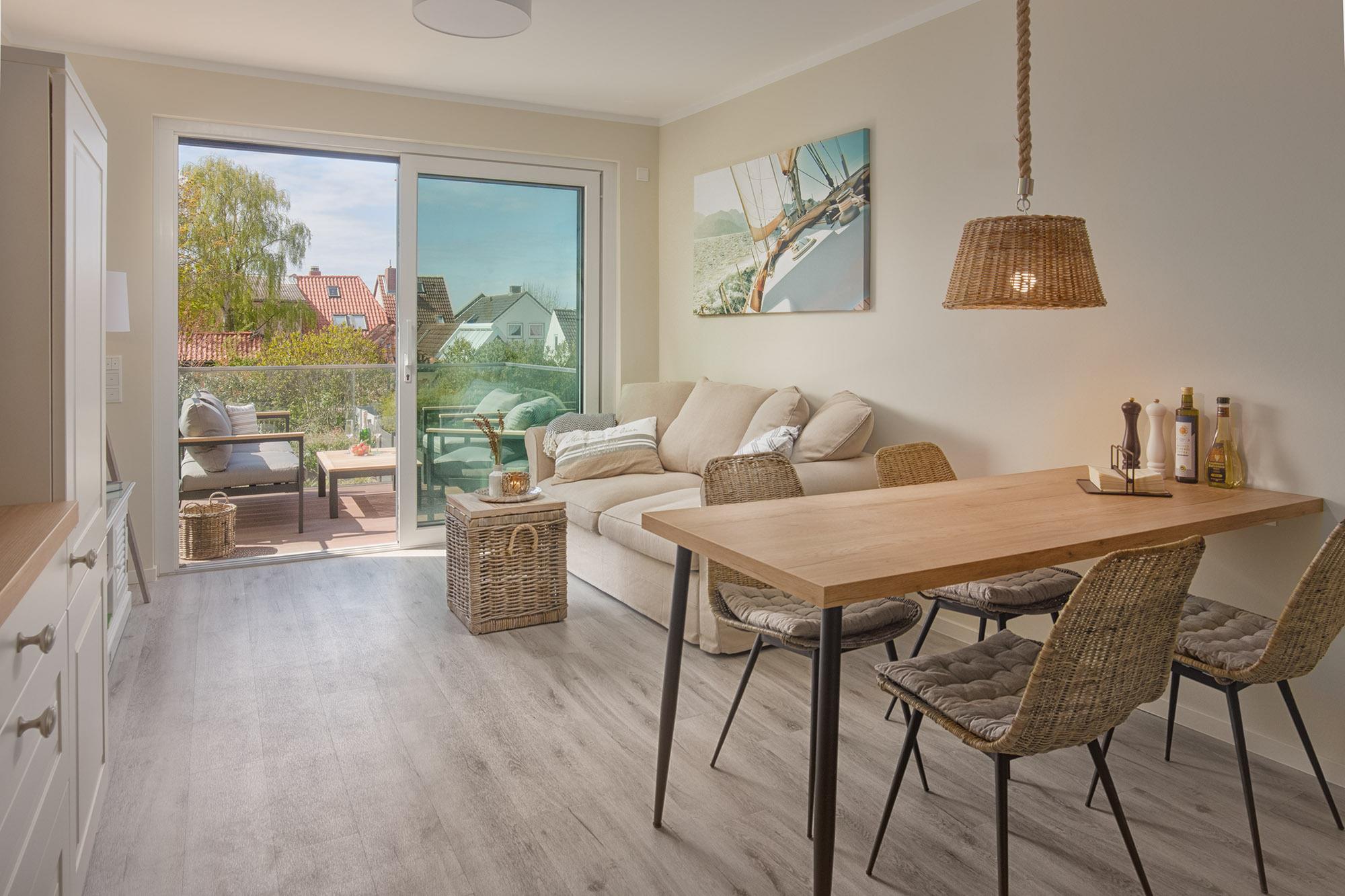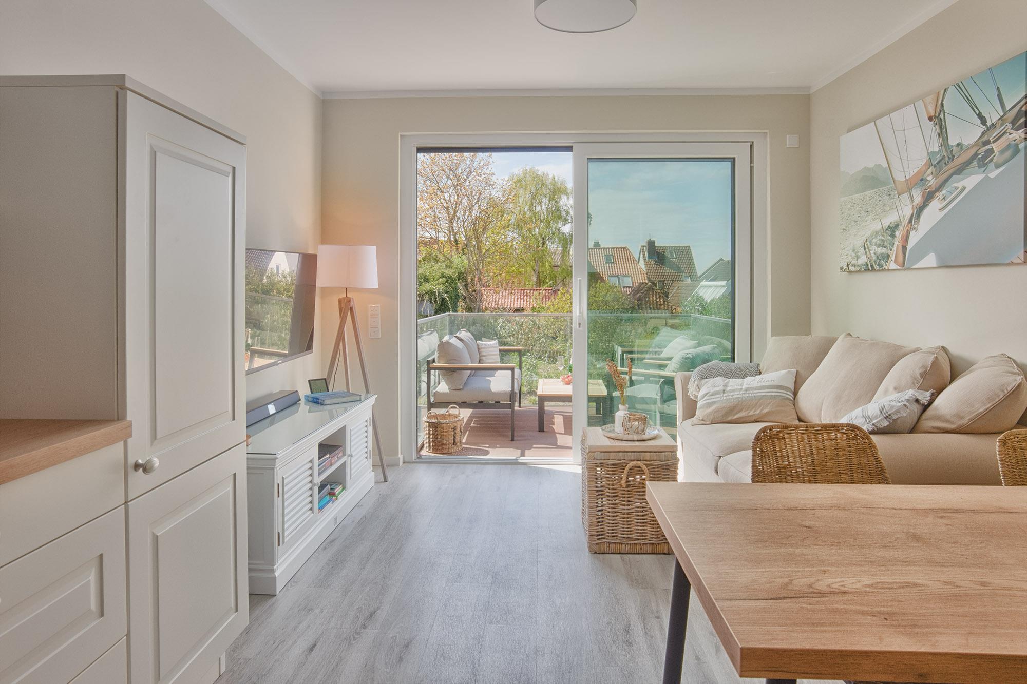 Zu den weiteren Ausstattungsmerkmalen gehören ein möblierte Balkon und ein gemeinschaftlich nutzbarer, offener Gartenbereich. Der Balkon der Wohnung schließt direkt an den Wohnbereich an. Hier lädt der gemütliche Freisitz dazu ein, den Tag mit einer Tasse Kaffee an der frischen Seeluft zu beginnen oder laue Sommerabende entspannt ausklingen zu lassen.