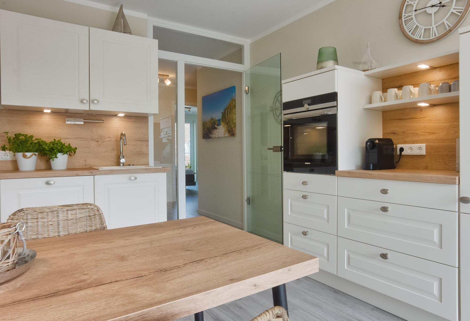 Auch die Küchenzeile wurde in den Wohnbereich integriert. Modern und durchdacht gestaltet, bietet Ihnen die Einbauküche alle Annehmlichkeiten für eine sorgenfreie Selbstversorgung.