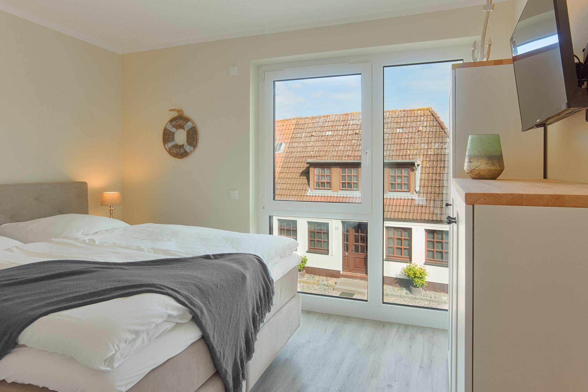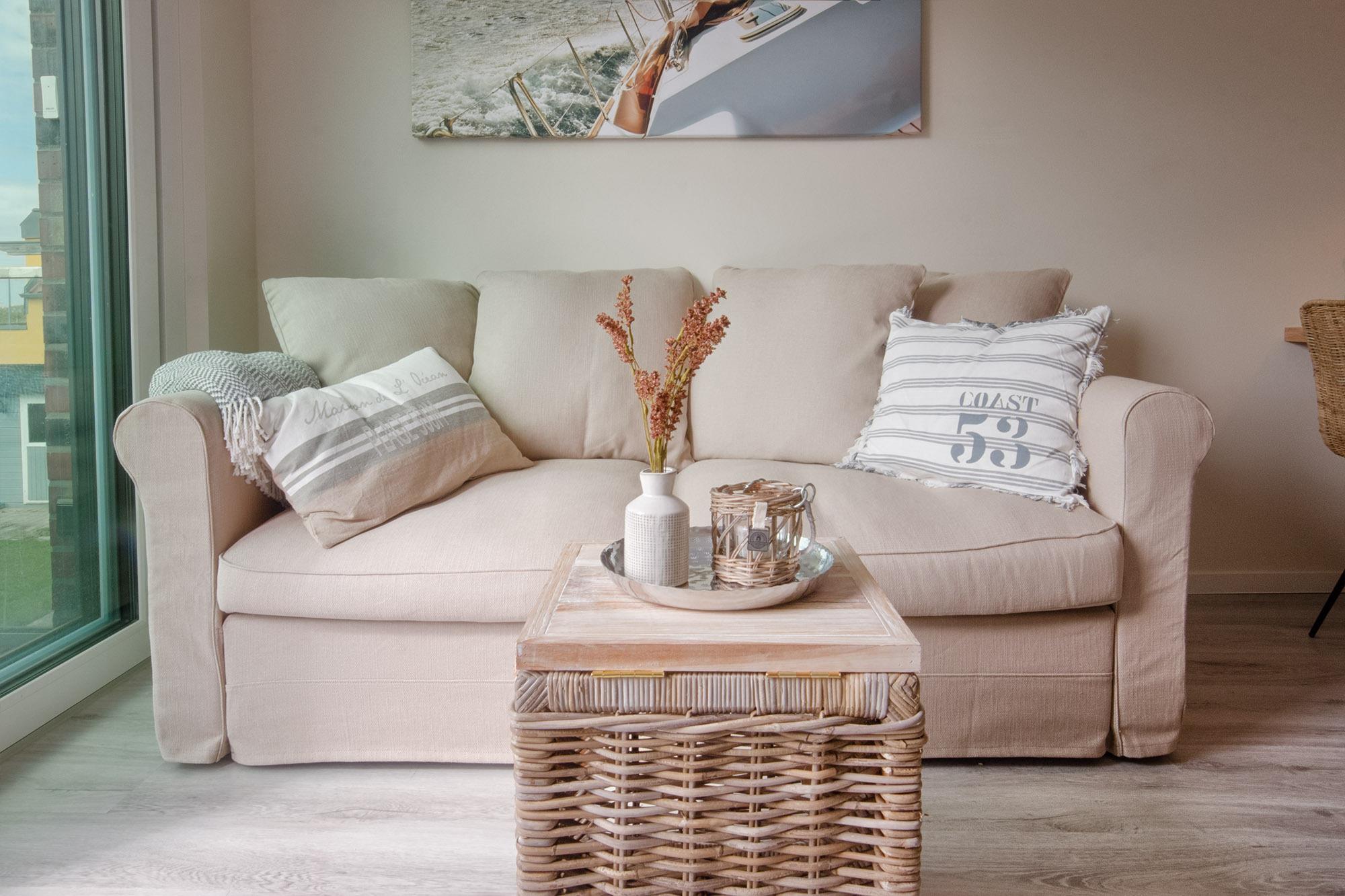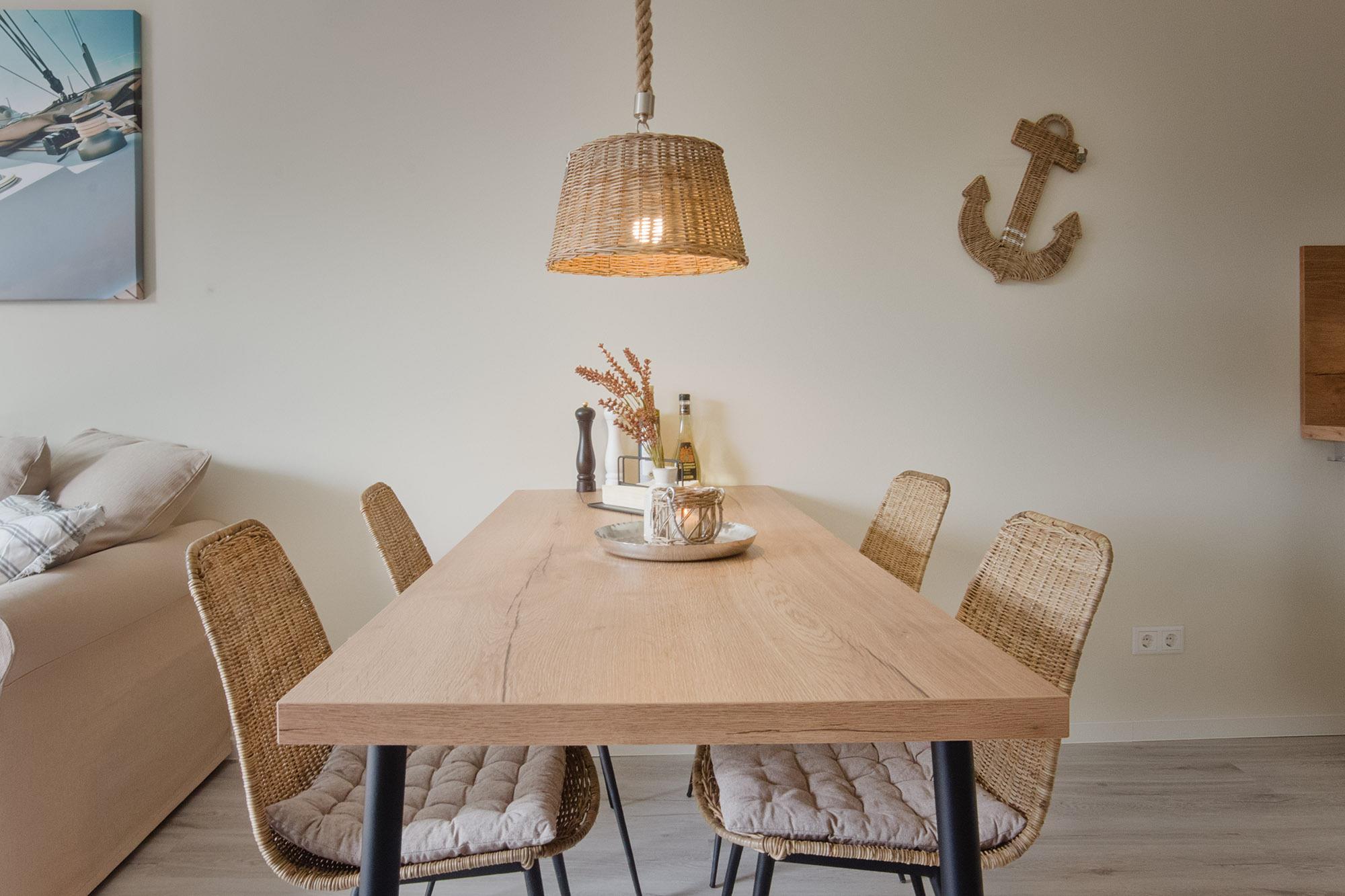 Herzstück ist der einladende Wohn- und Essbereich. Hier kann auf der gemütlichen Couch entspannt werden oder Sie genießen gesellige Stunden am großen Esstisch. Naturtöne und mit viel Geschick ausgewählte Dekorationen sorgen für ein wunderbar wohnliches Gefühl. TV und WLAN sind selbstverständlich. Durch die großen, charmanten Fenster haben Sie einen Blick in die Außenanlage vom Harbour Side Heiligenhafen.