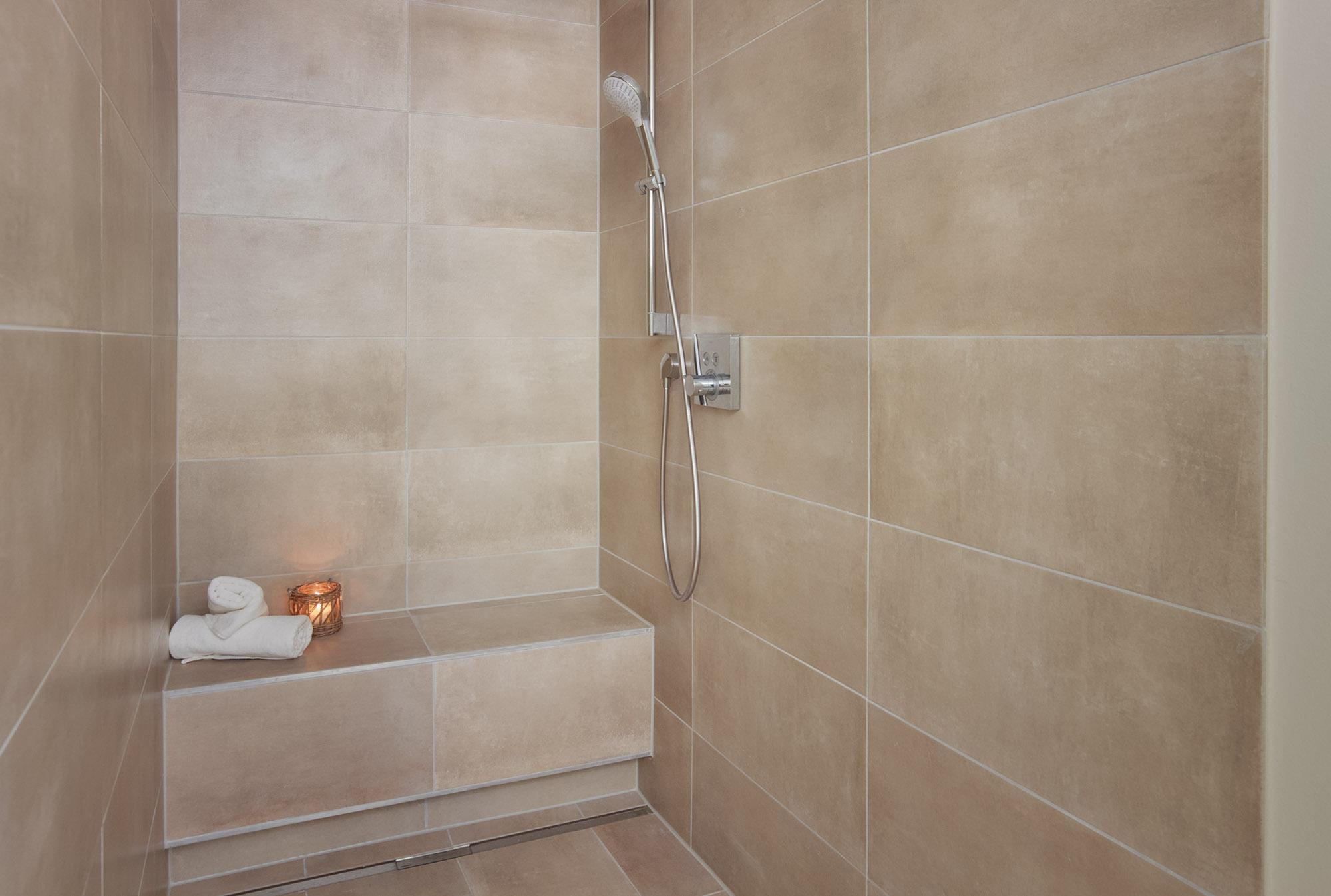 Das gut geschnittene, moderne Duschbad direkt neben dem Schlafzimmer sorgt für weitere Bequemlichkeit. Die ebenerdige Dusche, Handtuchwärmer, WC, Waschbecken und Spiegel runden den Raum ab.