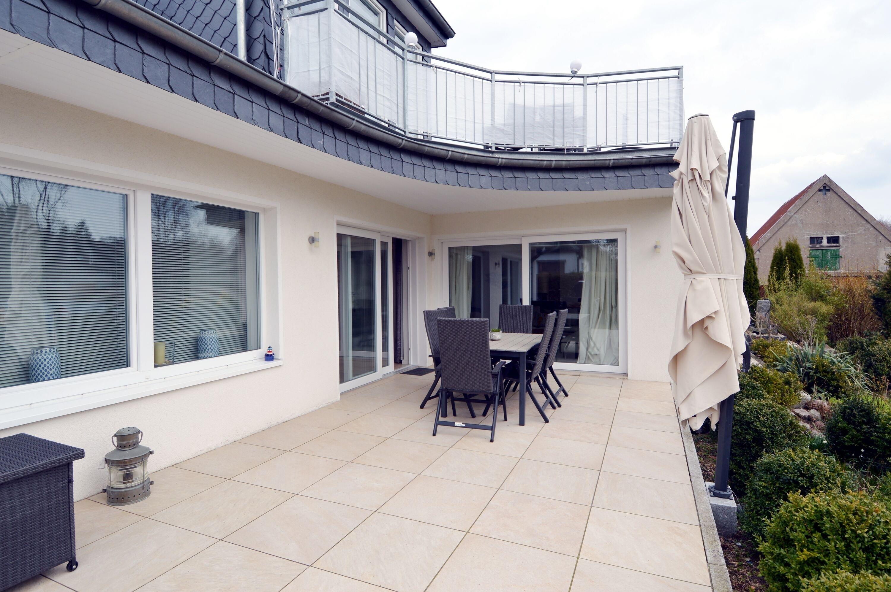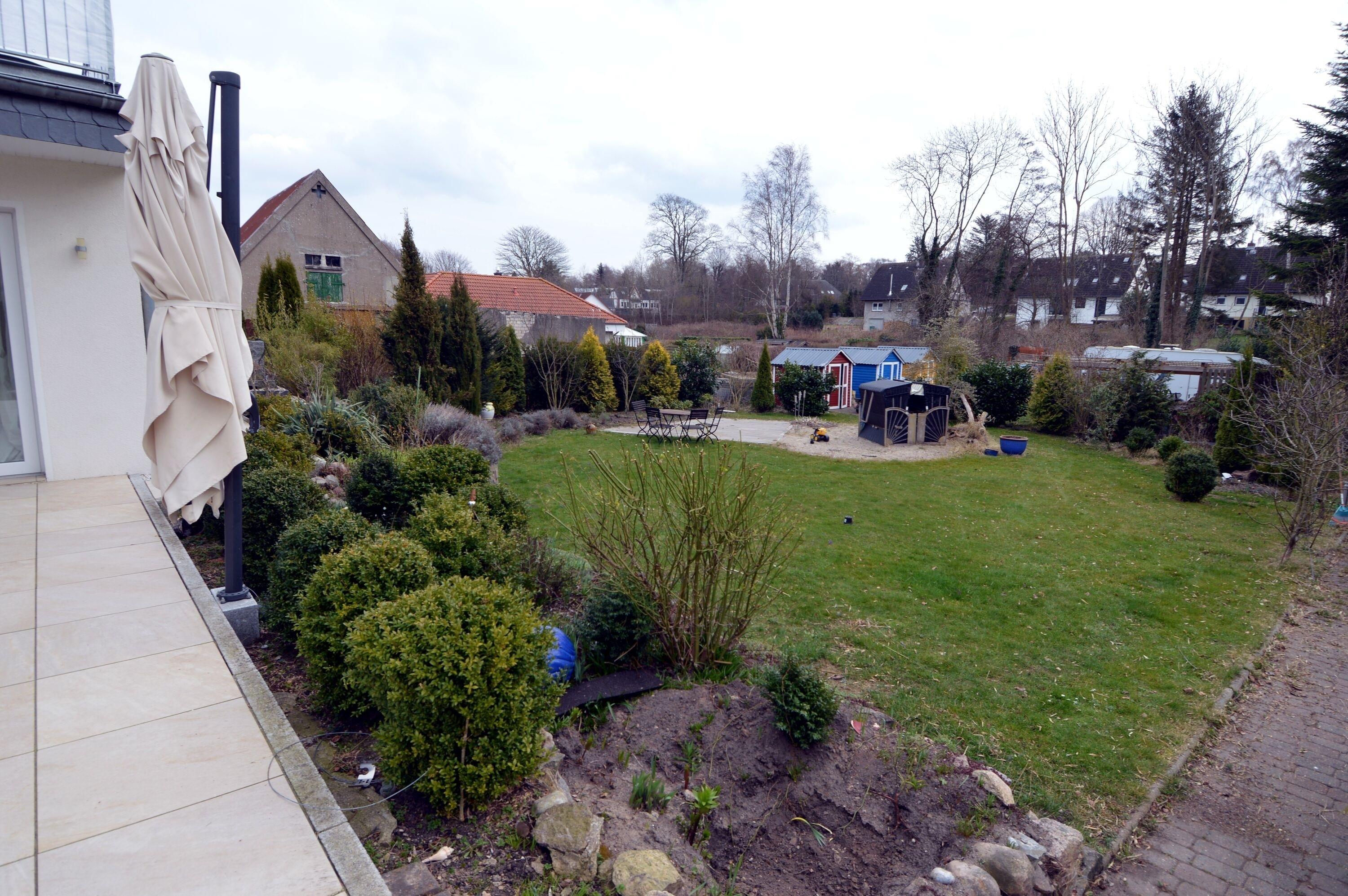 Die Terrasse geht nach Süden und kann vom Wohnzimmer und vom Esszimmer aus betreten werden. Der großzügige Gartenbereich kann ebenfalls genutzt werden.