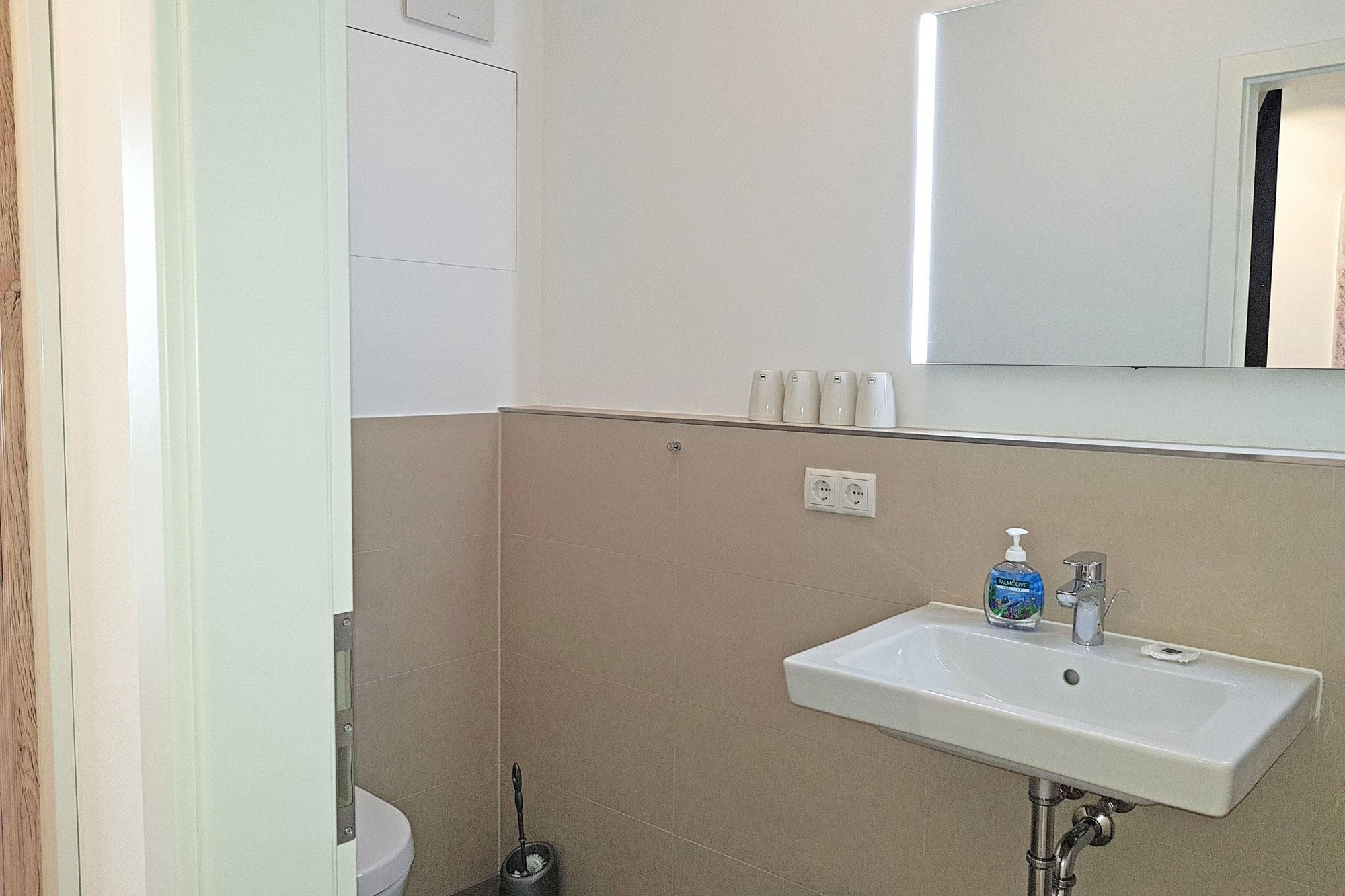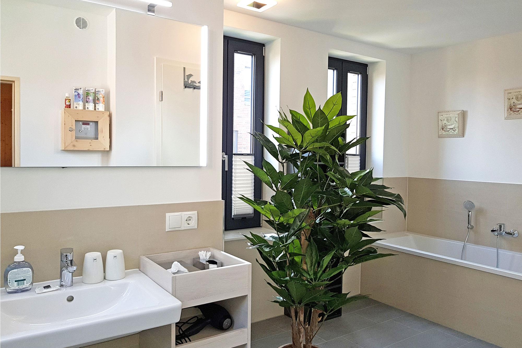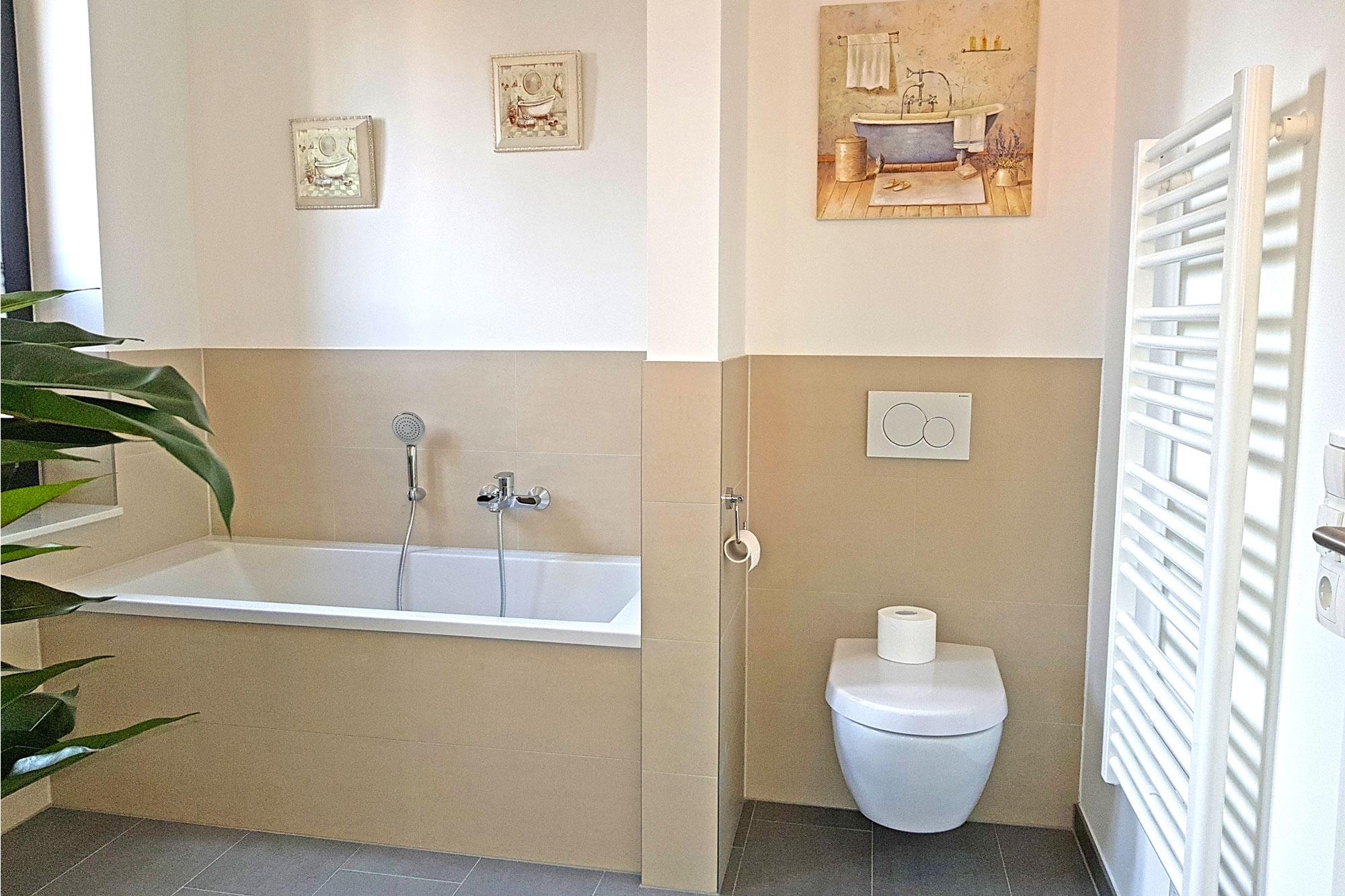 Die beiden Badezimmer in den oberen Etagen bieten viel Komfort – eines ist mit einer Badewanne ausgestattet, das andere verfügt über eine bodengleiche Dusche. Nach einem erlebnisreichen Tag an der Ostsee können Sie sich in der integrierten Sauna (gegen Gebühr) entspannen. Handtuchwärmer und WC sind ebenfalls vorhanden. Ein zusätzliches Gäste-WC im Erdgeschoss rundet die Ausstattung ab.