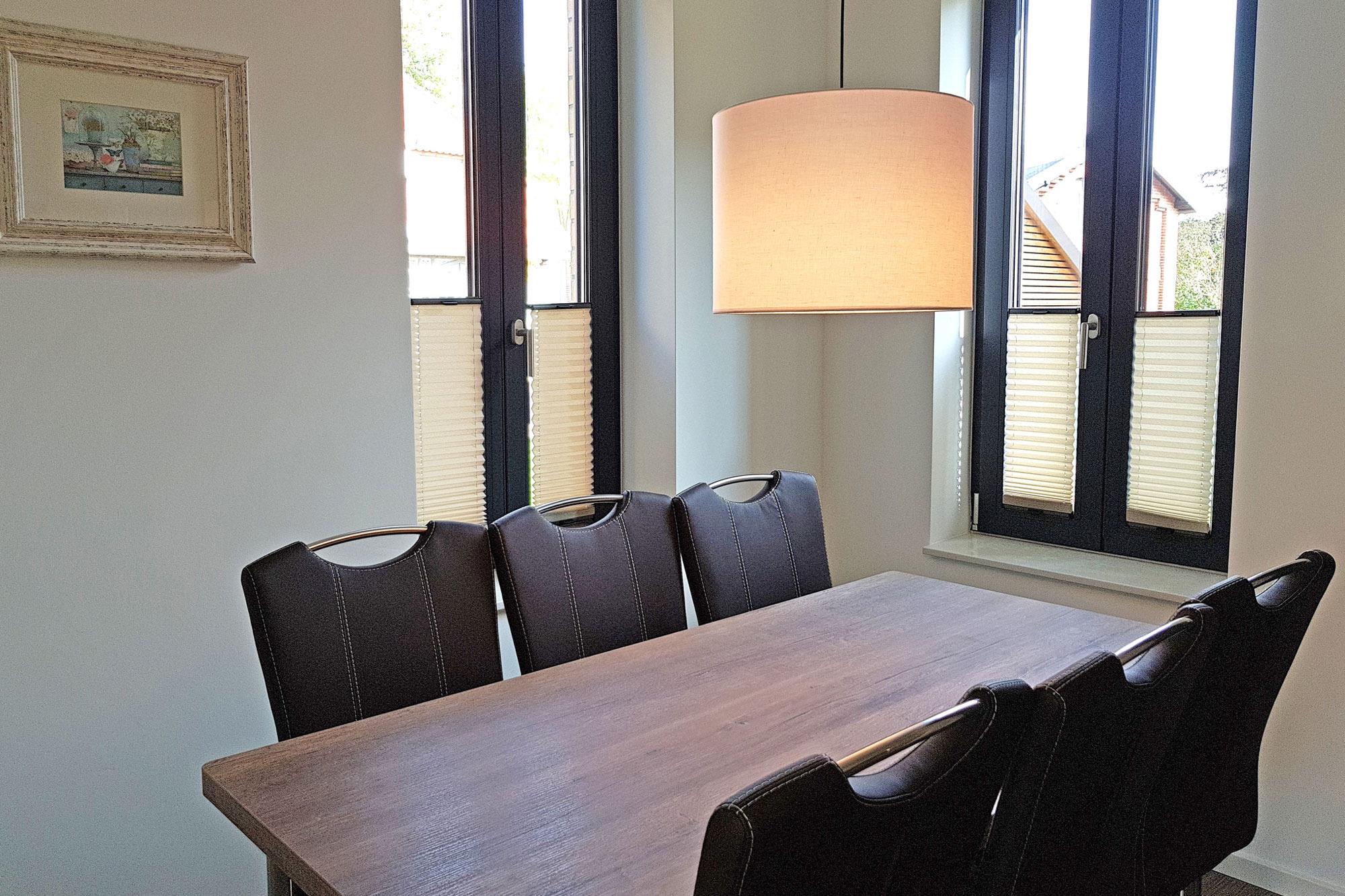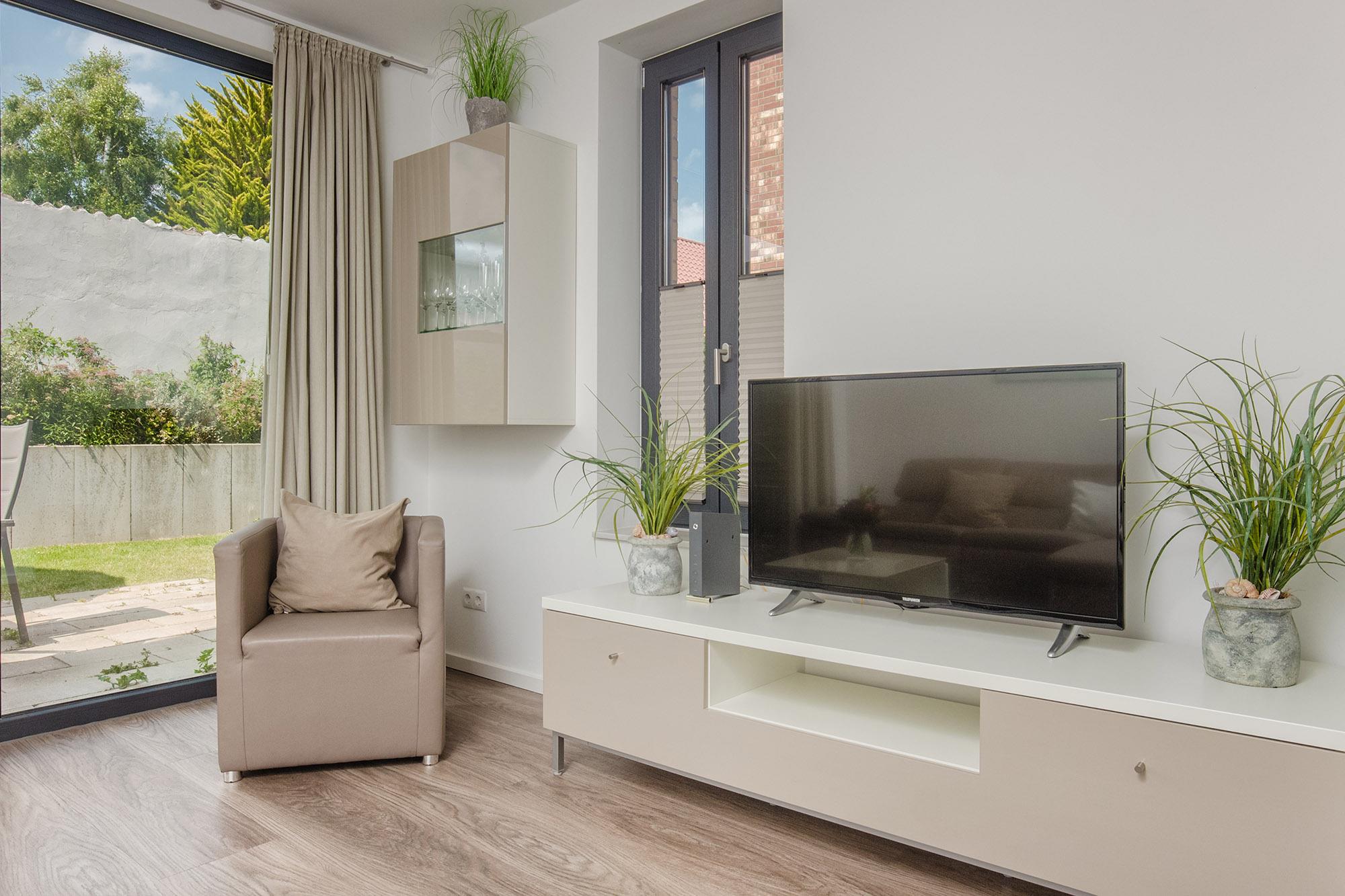 Das Haus ist modern eingerichtet und versprüht dabei ein einladendes Urlaubsflair. Der großzügige Wohnbereich überzeugt mit geschmackvoller Ausstattung und wird schnell zum zentralen Treffpunkt für entspannte Stunden. TV und WLAN sind selbstverständlich vorhanden. Bodentiefe Fensterfronten lassen viel Tageslicht herein und bieten direkt von der Couch aus einen schönen Blick auf die möblierte Terrasse sowie den nutzbaren Gartenbereich mit Grill – ideal für gesellige Abende unter freiem Himmel.