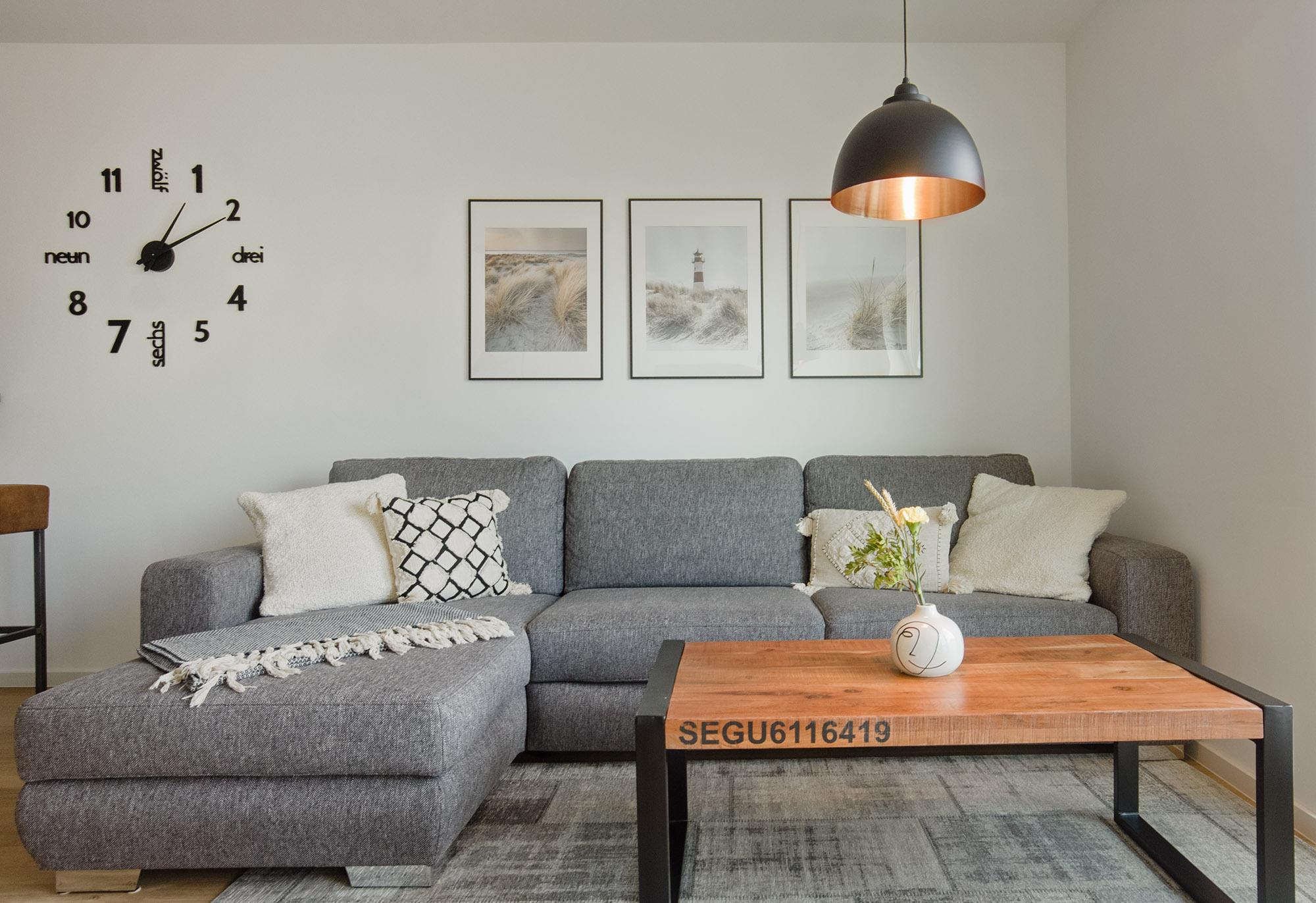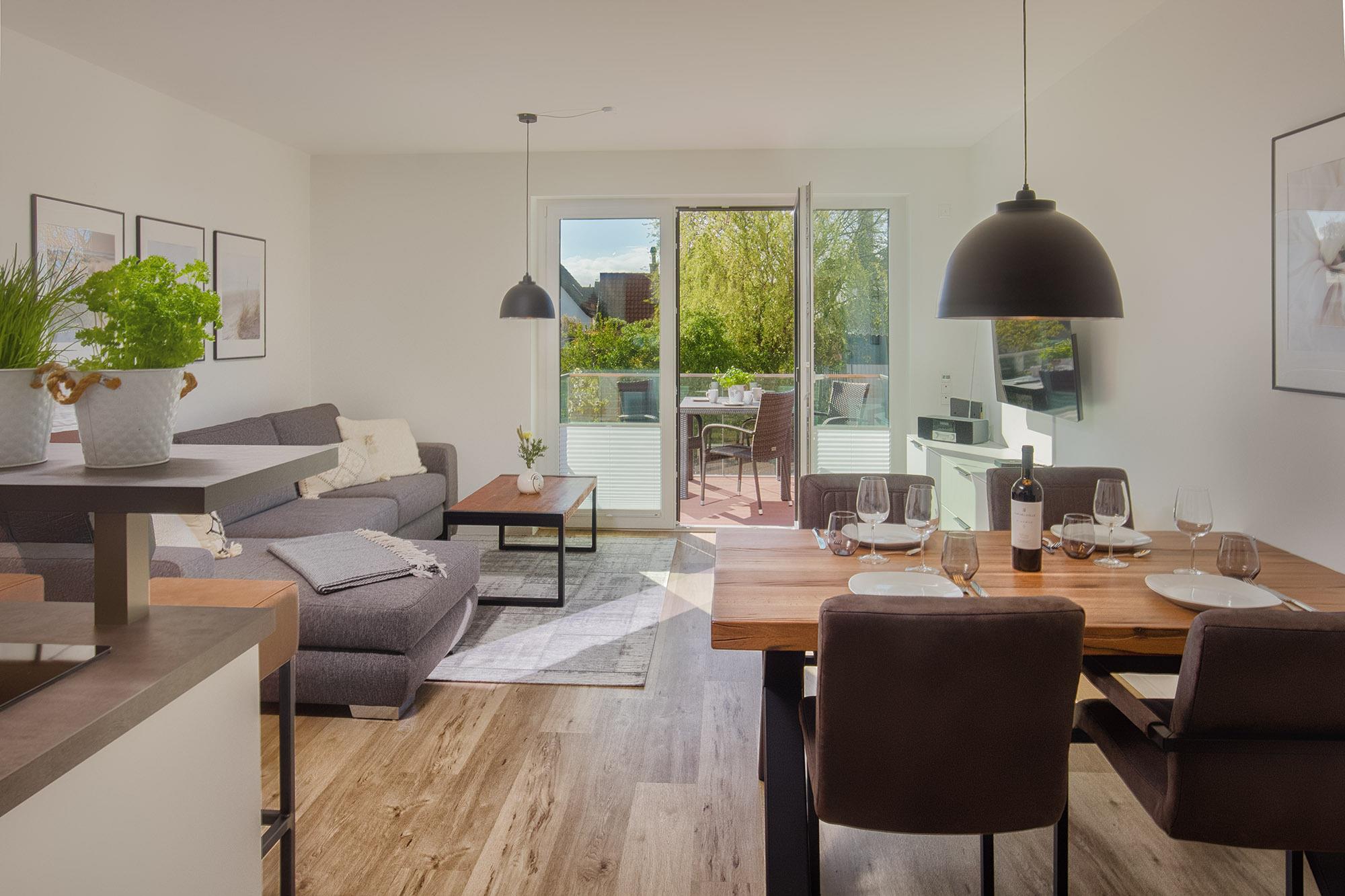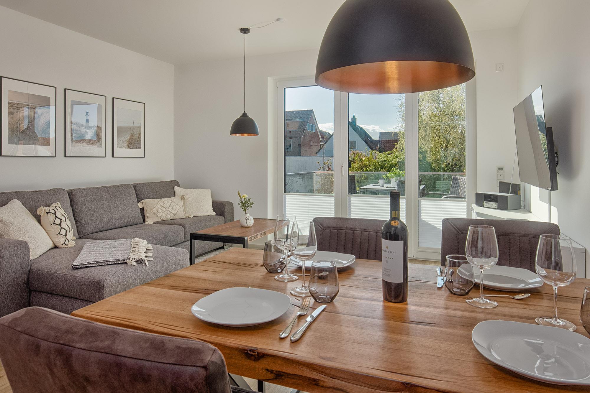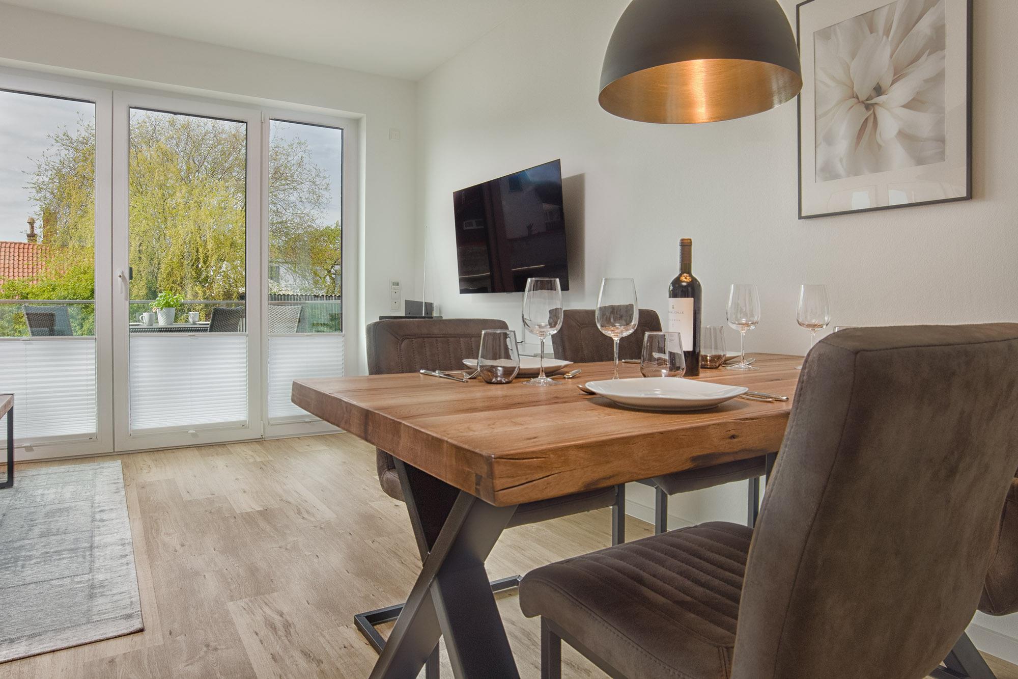 Herzstück ist der einladende Wohn- und Essbereich. Hier kann auf der gemütlichen Couch (mit Schlaffunktion) entspannt werden oder Sie genießen gesellige Stunden am großen Esstisch. Naturtöne und mit viel Geschick ausgewählte Dekorationen sorgen für ein wunderbar wohnliches Gefühl. TV und WLAN sind selbstverständlich. Durch die großen, charmanten Fenster haben Sie einen Blick in die Außenanlage vom Harbour Side Heiligenhafen. Für Sichtschutz sorgen Plissees und zusätzlich gegen Sonne auf der Balkonseite aussen der elektrische Screen-Sonnenschutz.
