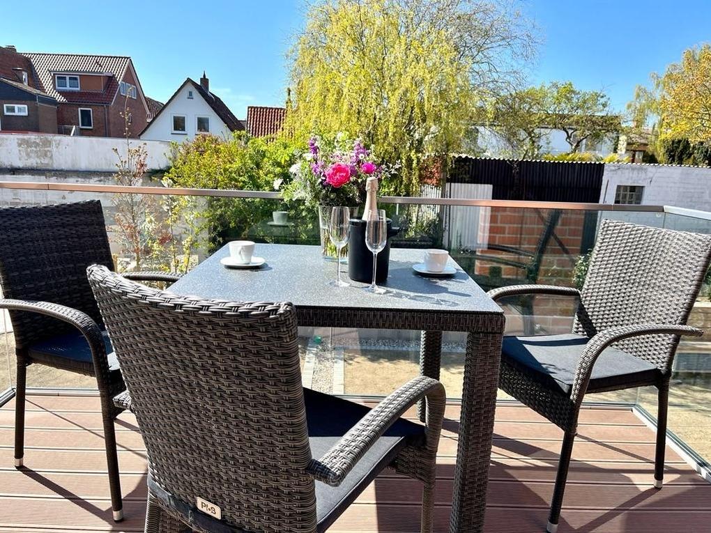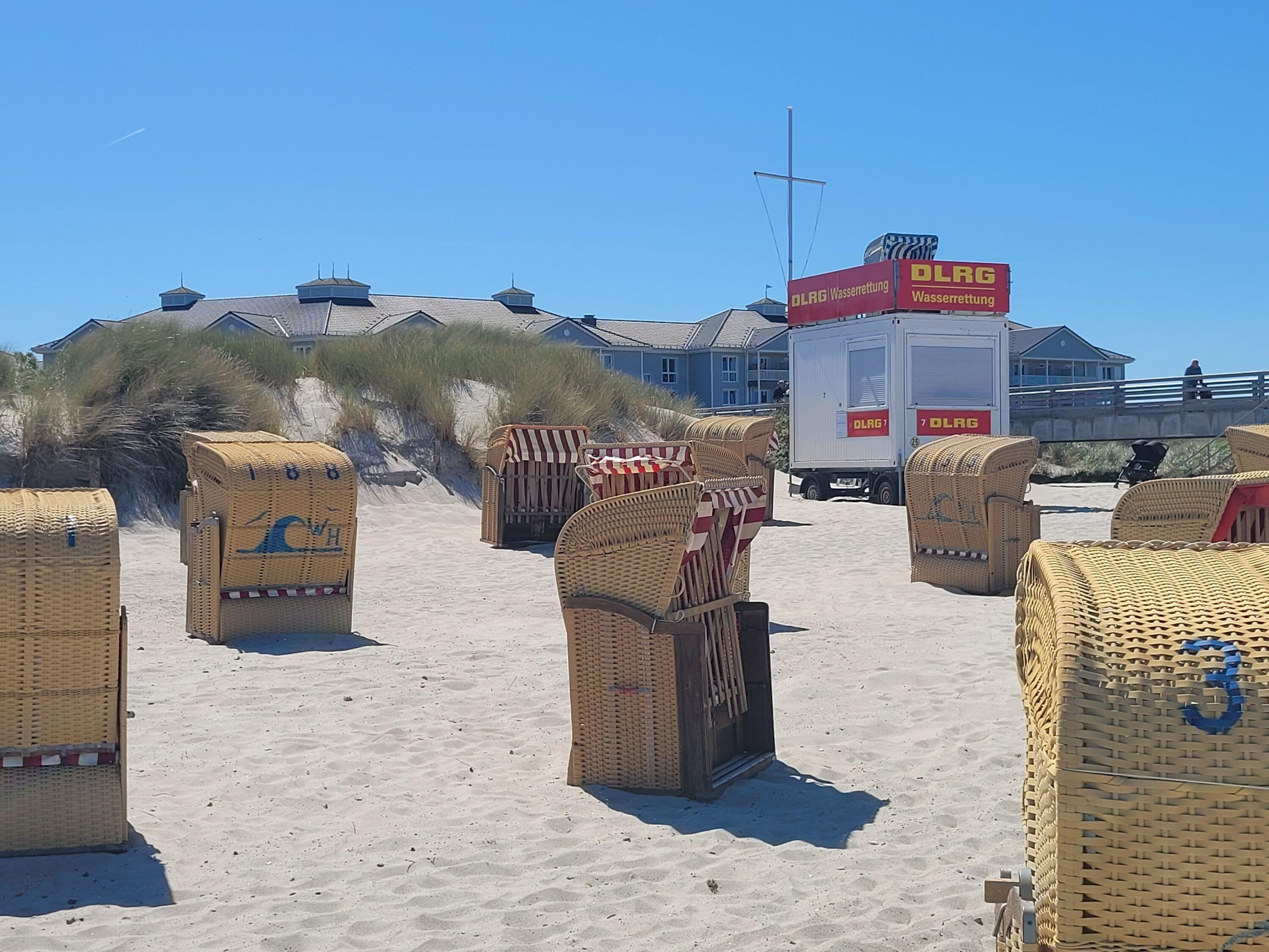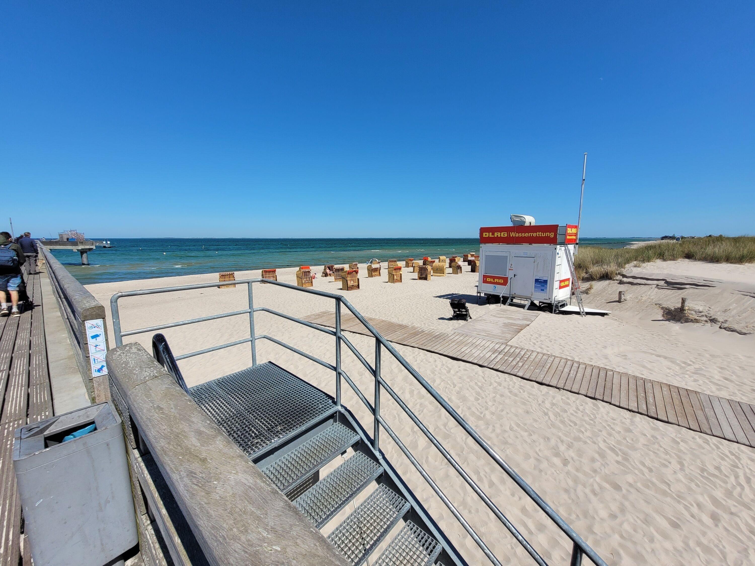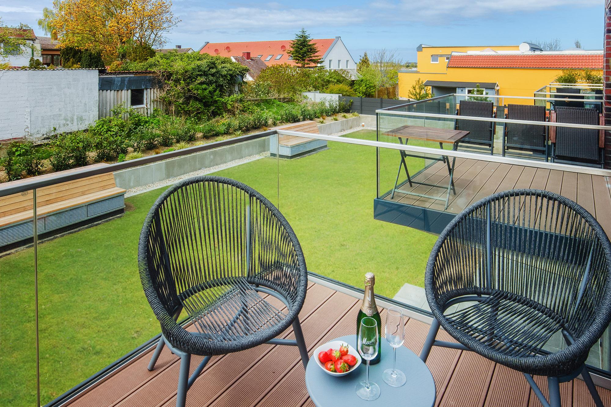 Zu den weiteren Ausstattungsmerkmalen gehört ein gemeinschaftlich nutzbarer, offener Gartenbereich. Die Seeglück hat 2 Balkone und dabei einen seitlichen Binnenseeblick aufs Wasser! Einmal direkt am Wohnbereich und einmal am Schlafzimmer haben Sie die Wahl. Der gemütliche Freisitz lädt dazu ein, den Tag mit einer Tasse Kaffee an der frischen Seeluft zu beginnen oder laue Sommerabende entspannt ausklingen zu lassen. Selbstverständlich stehen Ihnen bequeme Balkonmöbel zur Verfügung, so dass auch einem längeren Verweilen nichts im Wege steht. Und wenn es Sie zum Strand zieht, steht ein Strandkorb (rechts von der Seebrücke) zur Verfügung. Mehr Ostsee geht nicht!