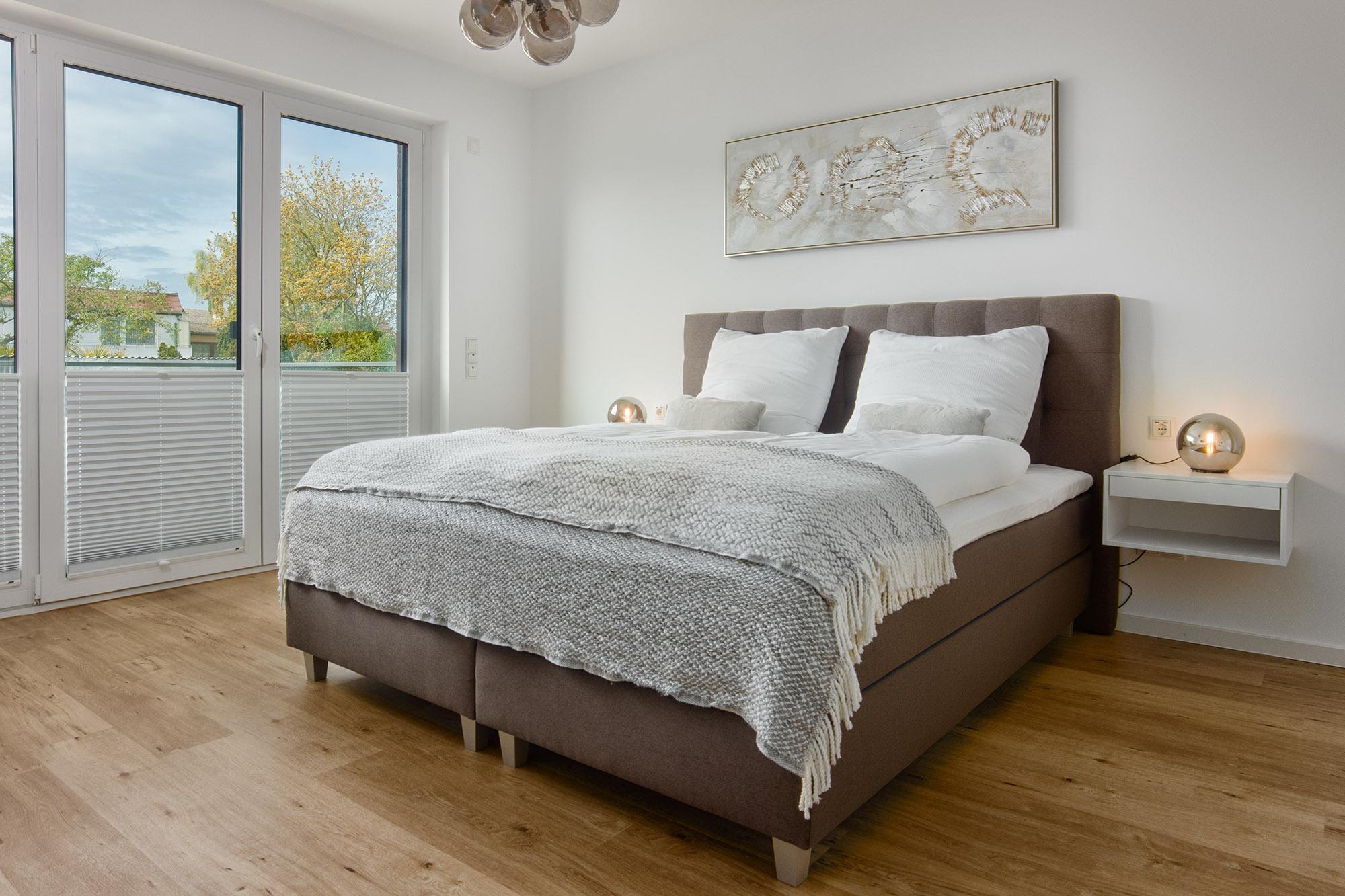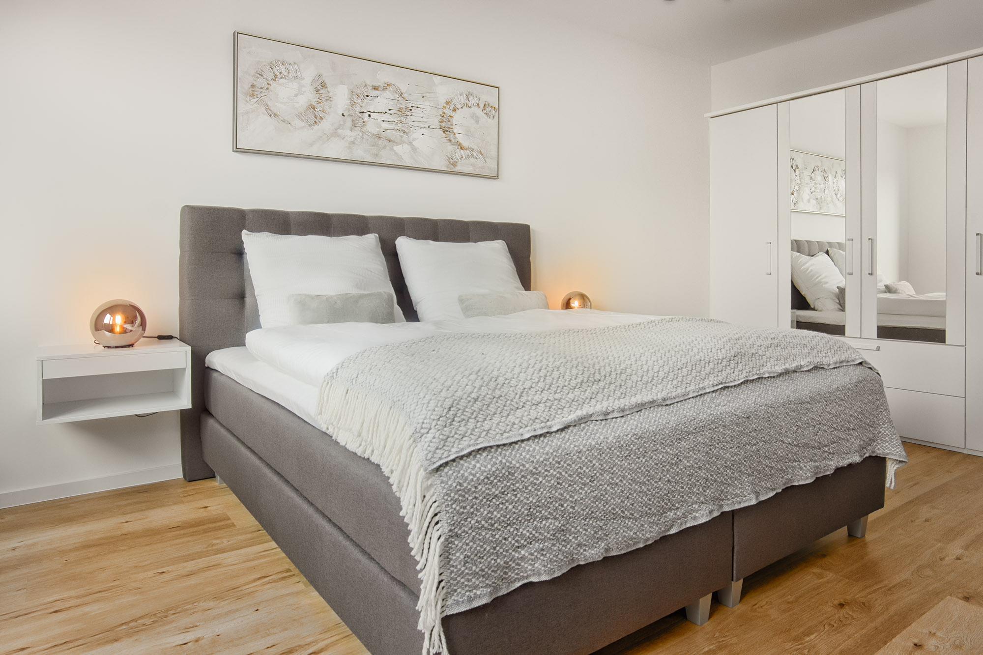 Ebenso komfortabel geht es im Schlafzimmer der Wohnung weiter. Hier wartet ein hochwertiges Doppelboxspringbett (180x200) mit durchgehender Matratze H3 und Lux Visco Topper. Ein TV über dem Sideboard sorgt auch im Schlafzimmer für mediale Unterhaltung. Im Wohnbereich finden Sie für die 3.+4.Person eine gemütliche Schlafcouch mit Doppelkernmatratze (140x200).
