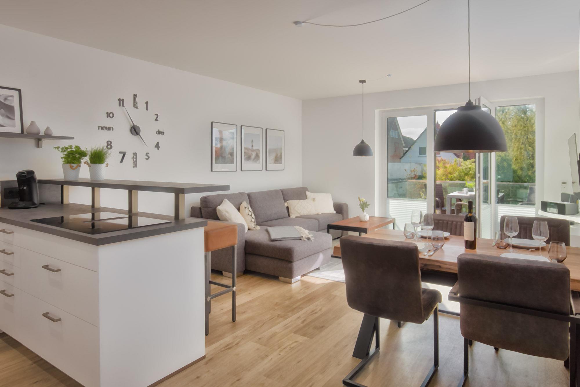 Auch die großzügige Küchenzeile wurde in den Wohnbereich integriert. Modern und durchdacht gestaltet, bietet Ihnen die Einbauküche alle Annehmlichkeiten für eine sorgenfreie Selbstversorgung. Das Induktionskochfeld mit integriertem Dunstabzug, sowie ein Tresen mit gemütlichen Barhockern laden förmlich zum kulinarischen Verweilen ein. Eine Nespresso Citiz Kapselmaschine steht zusätzlich zur Kaffeemaschine bereit.