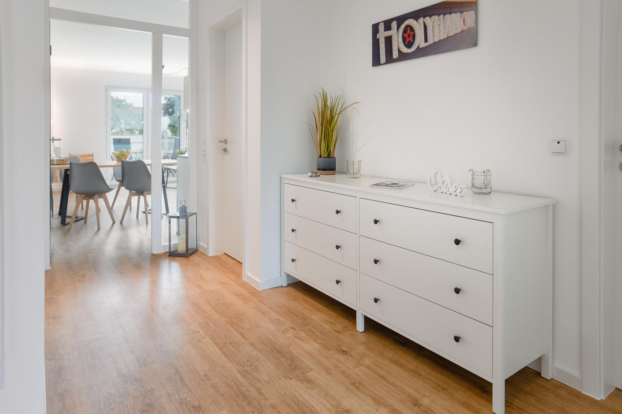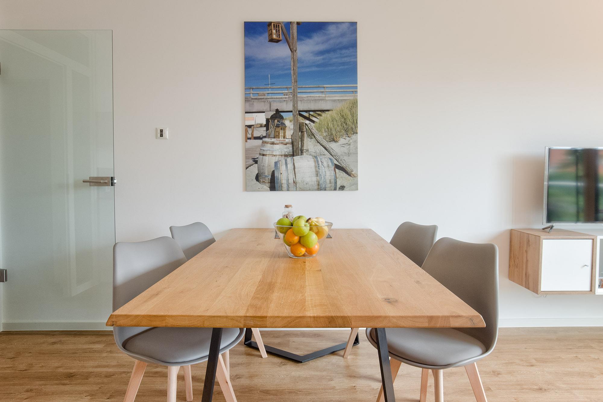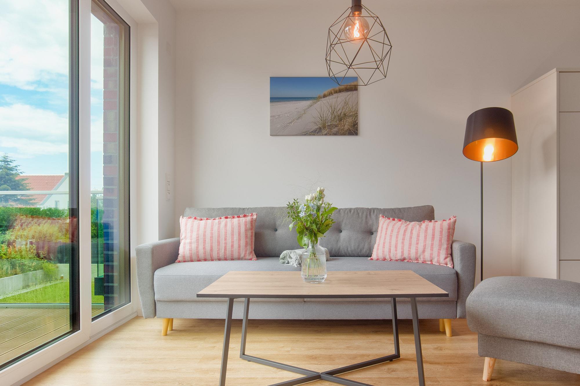 Der geschmackvolle Wohnbereich ist offengehalten und mit gemütlicher Couch (mit Schlaffunktion), Smart-TV und WLAN zur Unterhaltung ausgestattet. So kann man auch im Urlaub seine Lieblingsserien oder Filme per Stream schauen. Herzstück ist dabei der einladende Wohn- und Essbereich. Hier entspannen Sie bei geselligen Stunden am großen Esstisch. Naturtöne und mit viel Geschick ausgewählte Dekorationen sorgen für ein wunderbar wohnliches Gefühl. Durch die großen, charmanten Fenster, welche viel natürliches Licht in die Seensucht bringen, haben Sie einen Blick in die Außenanlage vom Harbour Side Heiligenhafen. Jahreszeitlich sogar mit kleinem Blick auf den Binnensee.