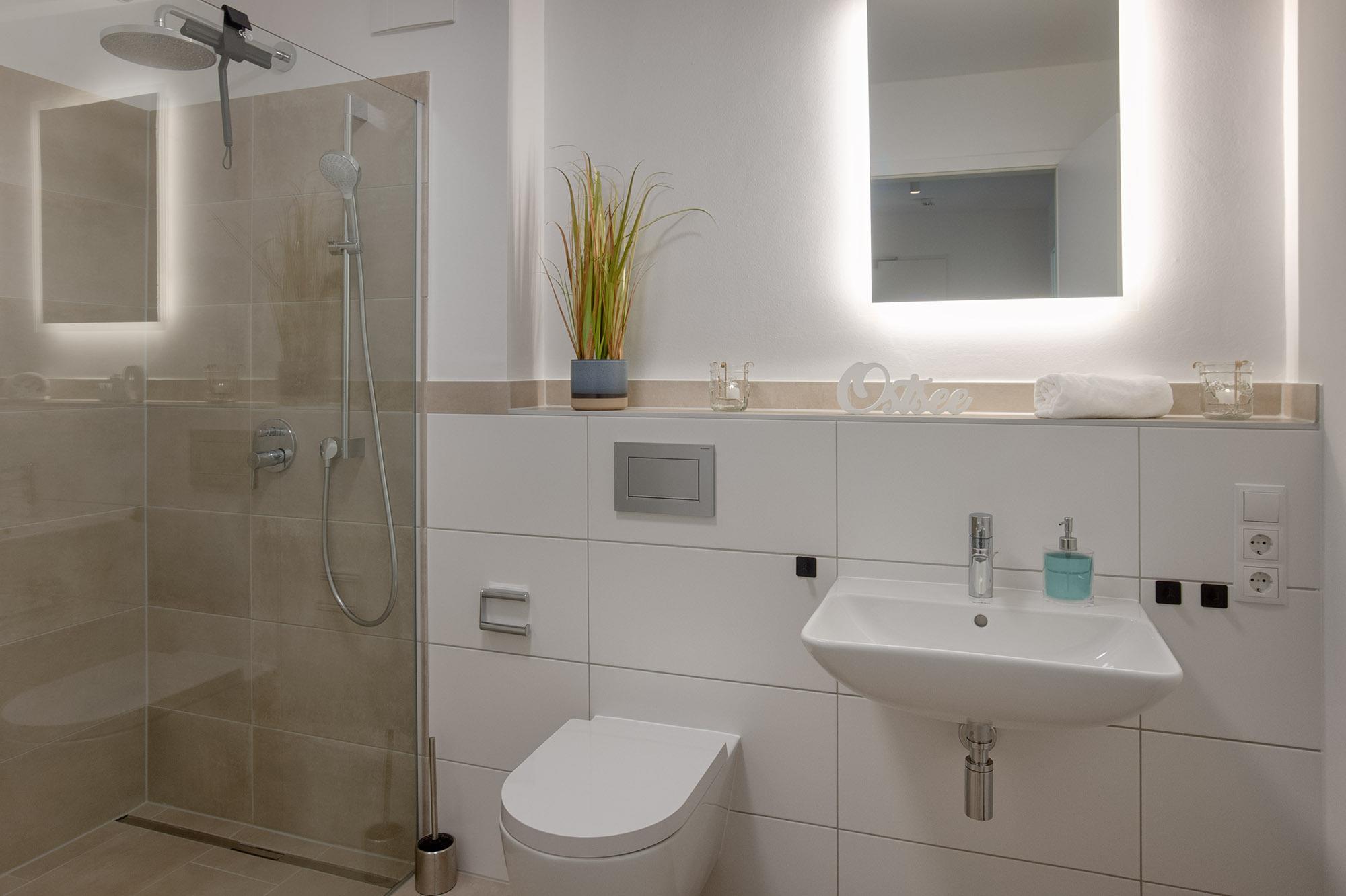 Das gut geschnittene, moderne Duschbad direkt neben den Schlafzimmern sorgt für weitere Bequemlichkeit. Die ebenerdige Dusche, Handtuchwärmer, WC, Waschbecken und Spiegel runden den Raum ab.