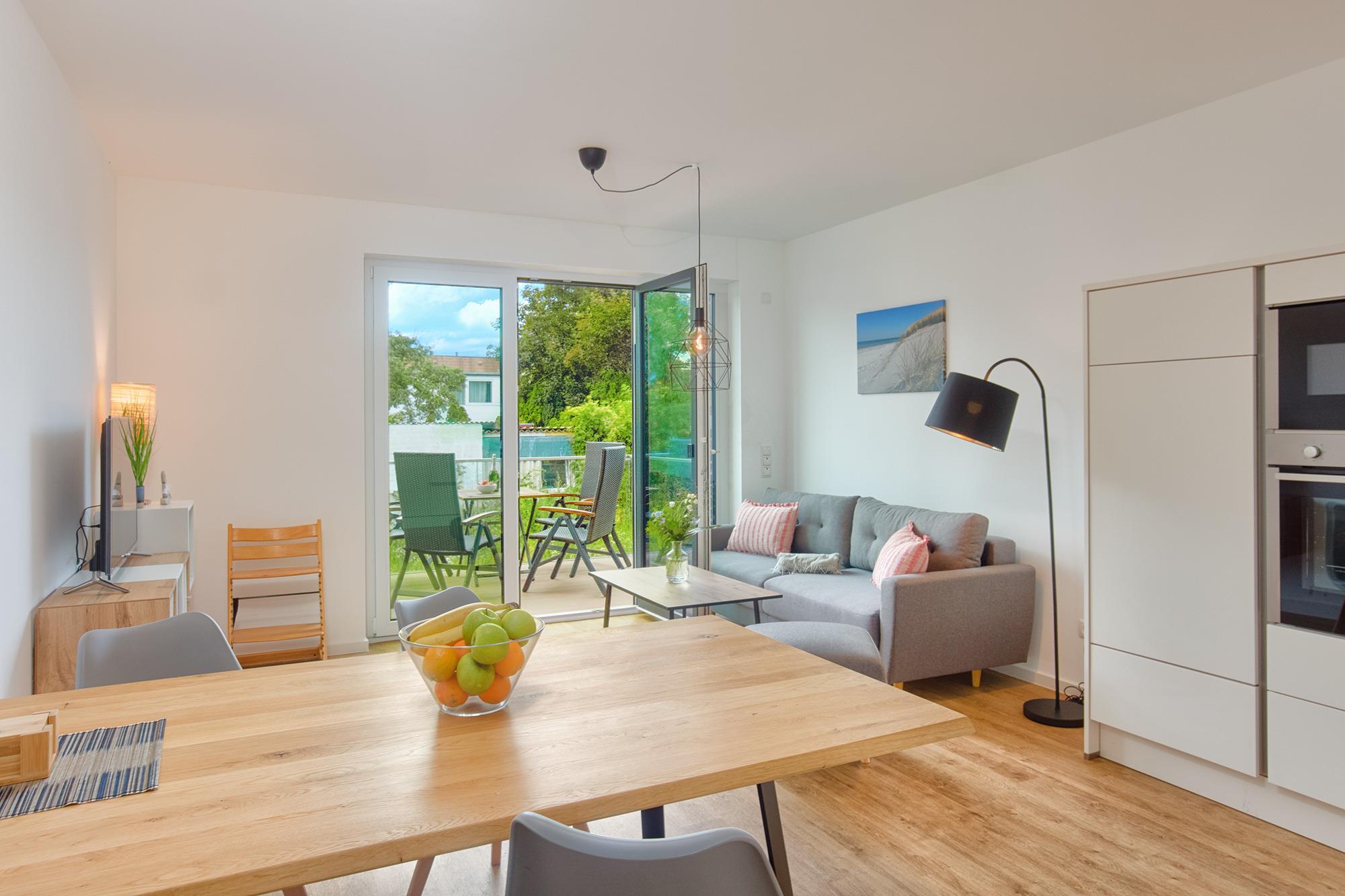 Zu den weiteren Ausstattungsmerkmalen gehören ein möblierte Balkon und ein gemeinschaftlich nutzbarer, offener Gartenbereich. Der Balkon der Wohnung schließt direkt an den Wohnbereich an. Hier lädt der gemütliche Freisitz dazu ein, den Tag mit einer Tasse Kaffee an der frischen Seeluft zu beginnen oder laue Sommerabende entspannt ausklingen zu lassen.