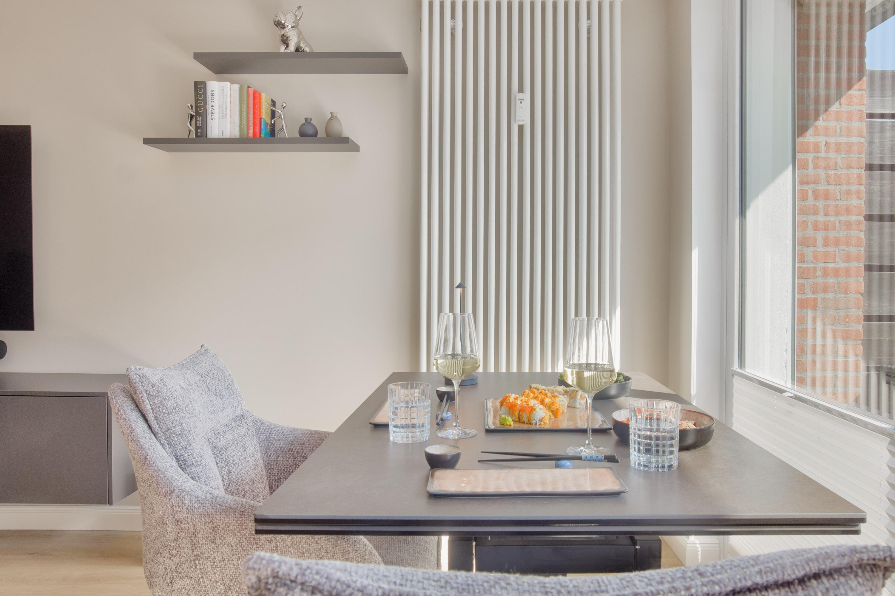 Die separate Küche mit kompletter Ausstattung (WMF), sowie Bistrotisch und Tresen Stühlen für den kleinen Hunger ist zudem sehr komfortabel. Ob Nespresso-Kaffeemaschine oder Weinkühler, es ist alles an Geräten und Utensilien vorhanden, was Sie für Ihren hochwertigen Urlaub erwarten. Der Kulinarik steht nichts im Wege. Dafür sorgt auch der Essbereich des Wohnzimmers mit Sitzkomfort und ausziehbarem Esstisch. Begrüßen Sie hier doch einfach Urlaubsbekanntschaften oder Freunde zum gepflegten Beisammensein. Eine Waschmaschine ist hier zudem komfortabel in der Küche integriert.