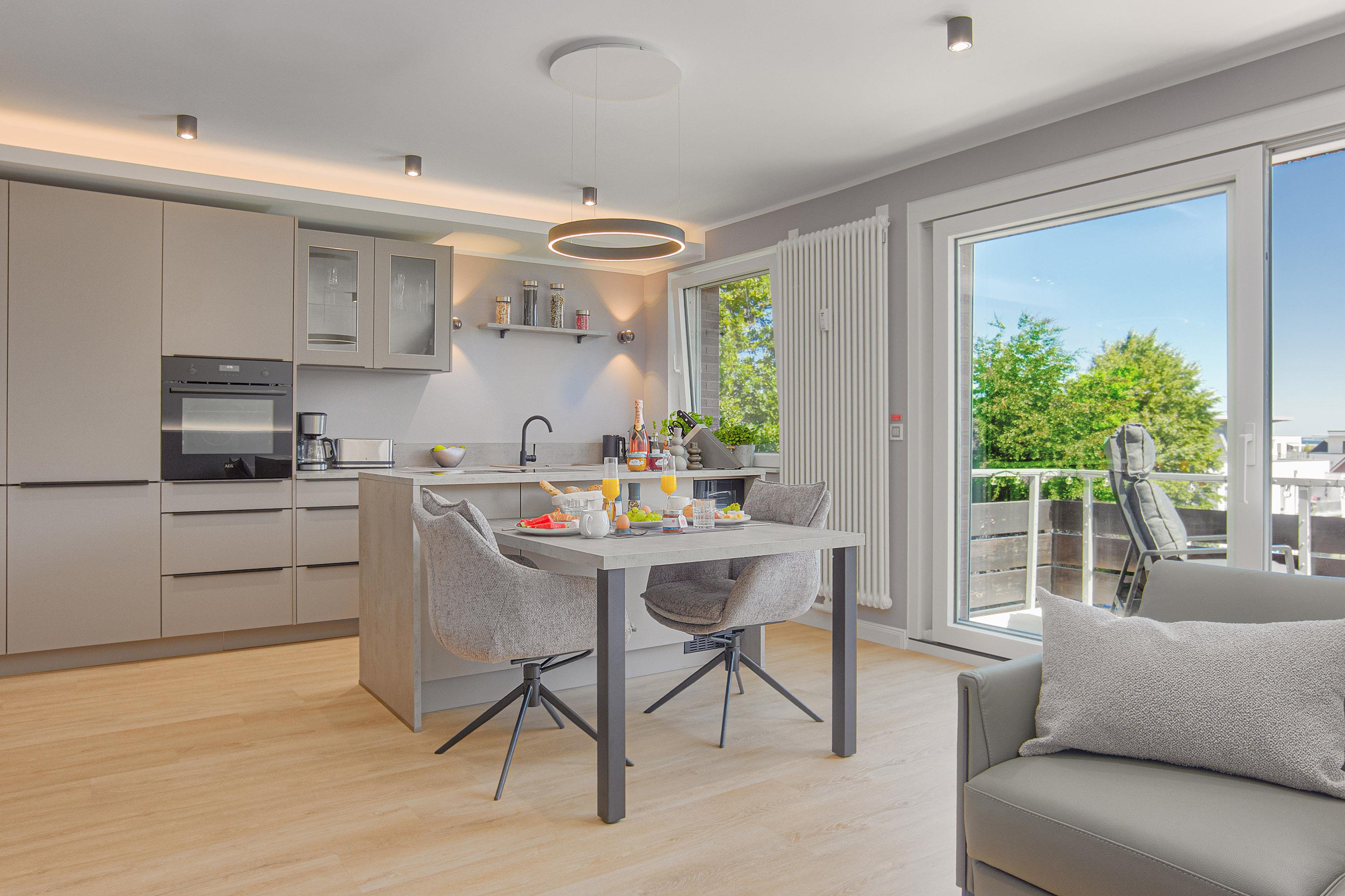 Die komplett neu sanierte Ferienwohnung Seewind 3, mit den liebevollen und erstklassigen Extras! Für maximal 2 Personen bietet diese geräumige Ferienunterkunft auf 55 m² Wohnfläche mit 5,5 m² möbliertem Balkon mit Ostseeblick im 2. Stock alles im Topzustand für Ihre beste Zeit des Jahres. Hier steht der stilvoll-moderne Komfort für Gäste im Vordergrund. Liebevoll designt und hochwertig mit maßgefertigten Einbaumöbeln eingerichtet. Der Wohnbereich mit elektrisch verstellbarem bequemen Ledersofa und topmoderner Unterhaltungstechnik bietet tolle Annehmlichkeiten. Die technische Ausstattung mit 4K-OLED-Smart-TV, WLAN und Streaming Möglichkeit, SONOS-Surroundsound-Anlage und einstellbarer Ambientebeleuchtung ist premium. Diverse Bücher und eine Spielesammlung sind ebenfalls vorhanden. Langweilig wird hier sicher niemand.