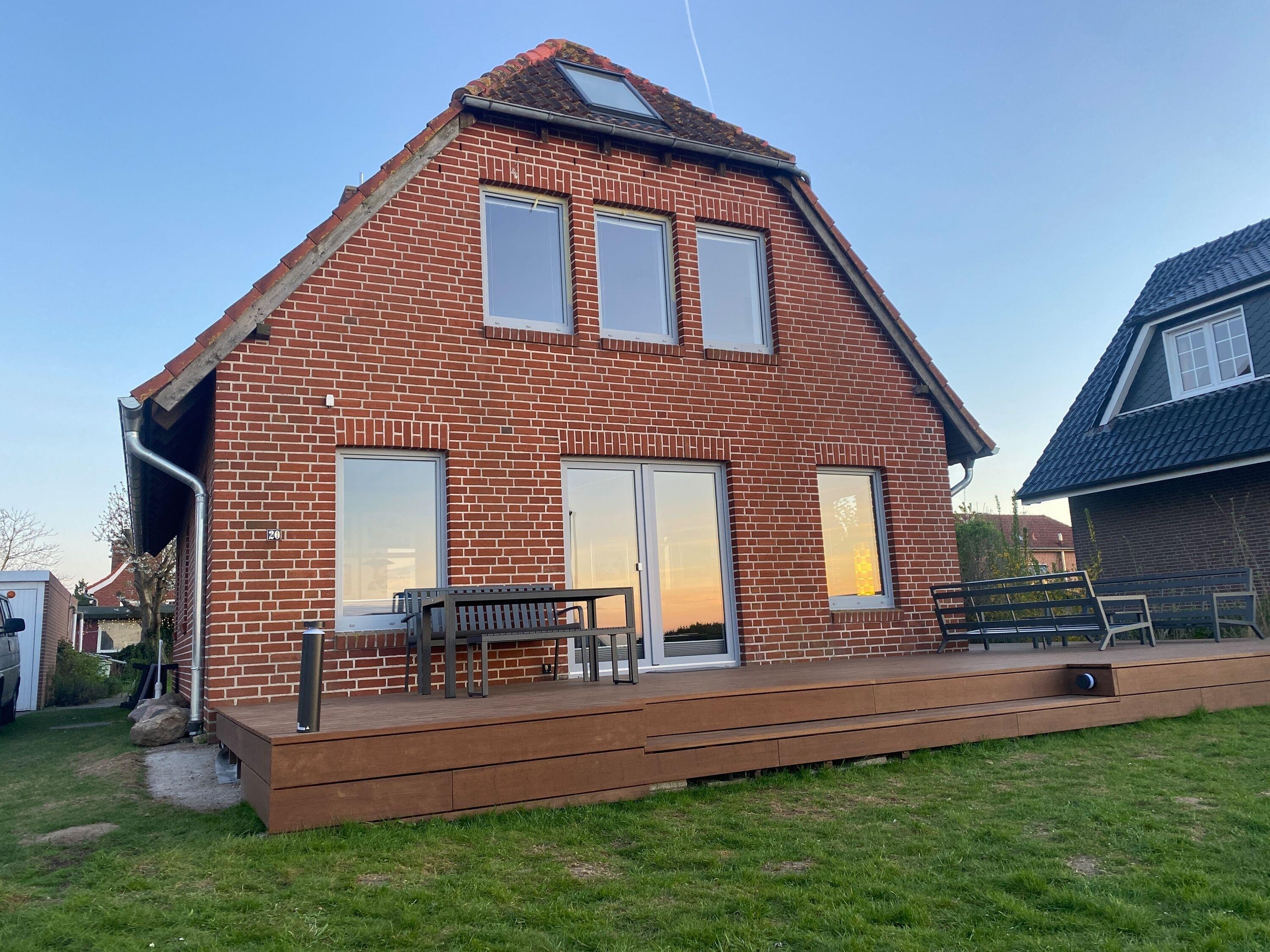 Der großzügige Außenbereich ist ein weiteres Highlight des Ferienhauses. Die Terrasse bietet Gartenmöbel und einen herrlichen Meerblick – der perfekte Ort, um den Tag bei einem Glas Wein ausklingen zu lassen oder ein gemeinsames Frühstück unter freiem Himmel zu genießen. Der umliegende Rasenbereich lädt die Kinder zum Spielen ein und bietet Raum zum Entspannen. Fahrräder können sicher untergestellt werden, und Parkmöglichkeiten auf dem Grundstück sind ebenfalls vorhanden.