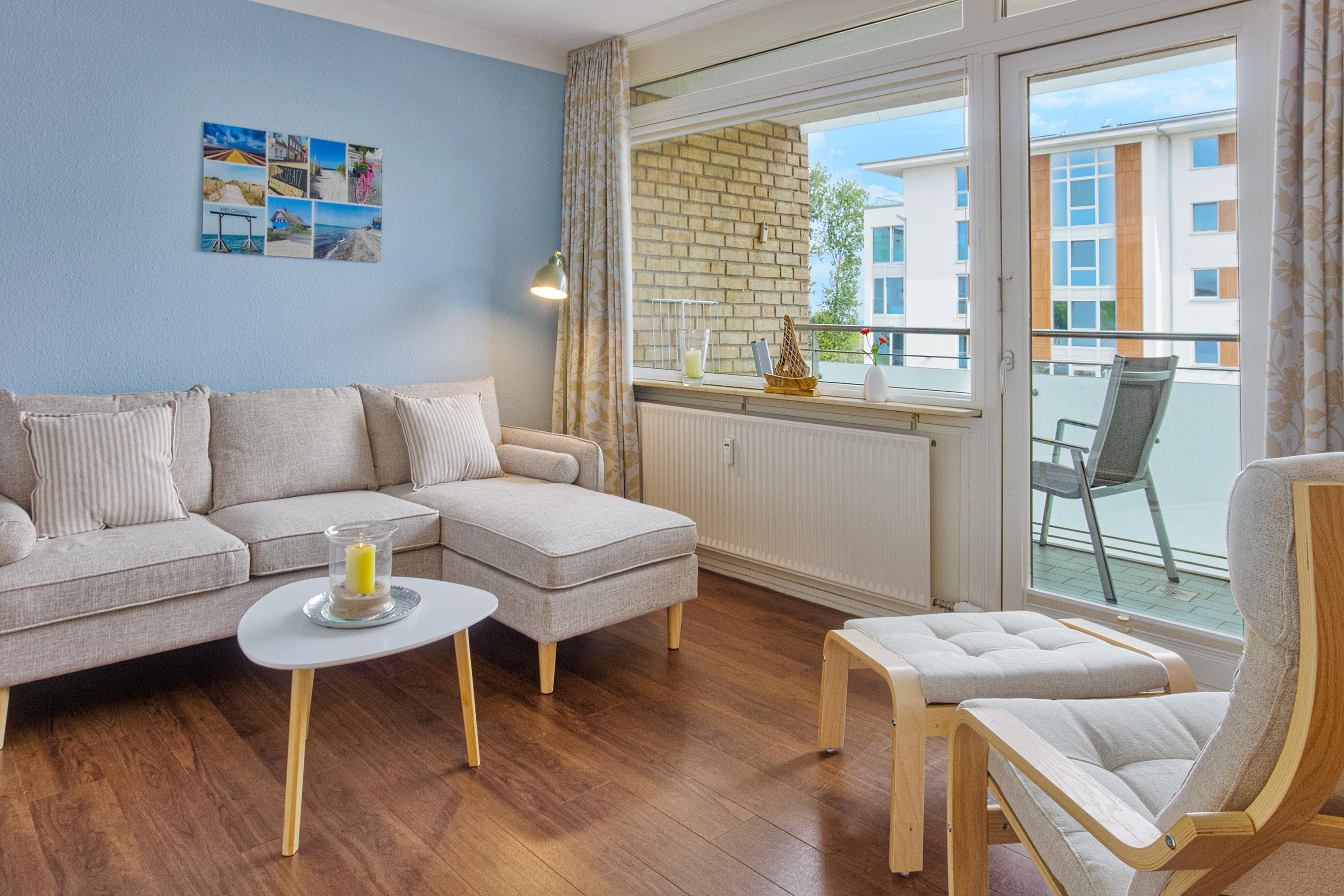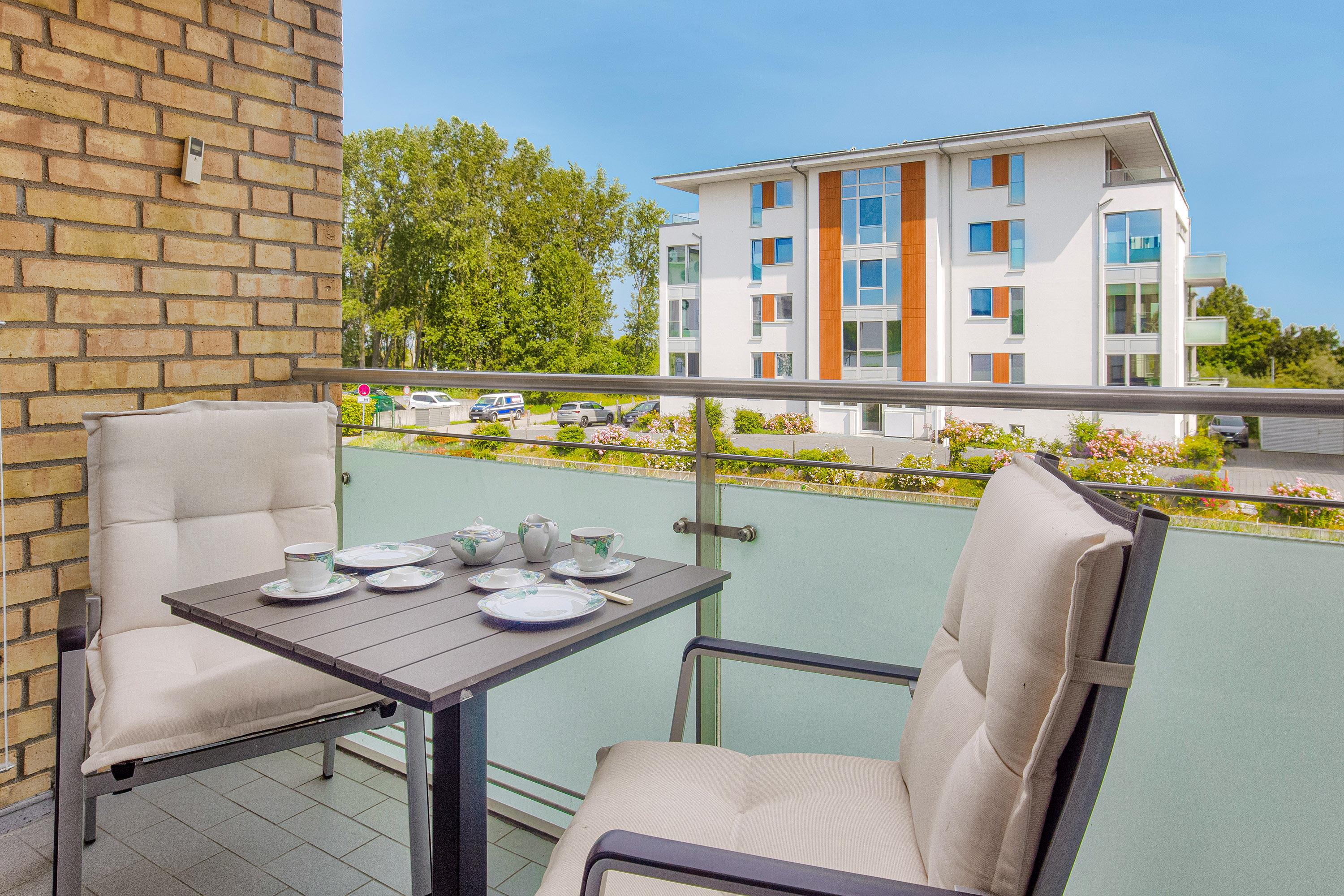 Auf dem möblierten Balkon kann man den Tag mit einer Tasse Kaffee an der frischen Seeluft beginnen oder entspannt die lauen Sommerabende mit kleinem Blick auf die Ostsee ausklingen lassen.
