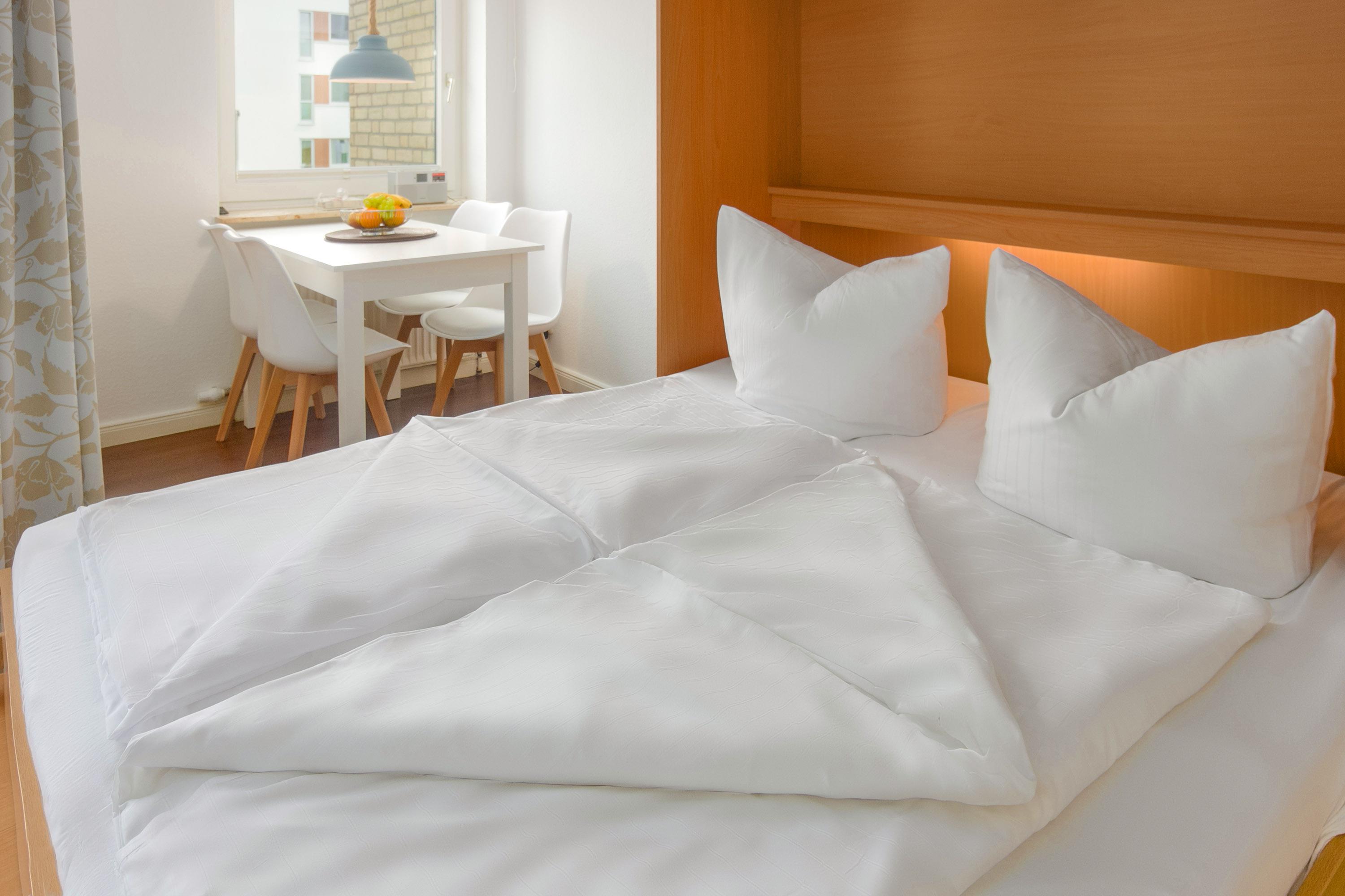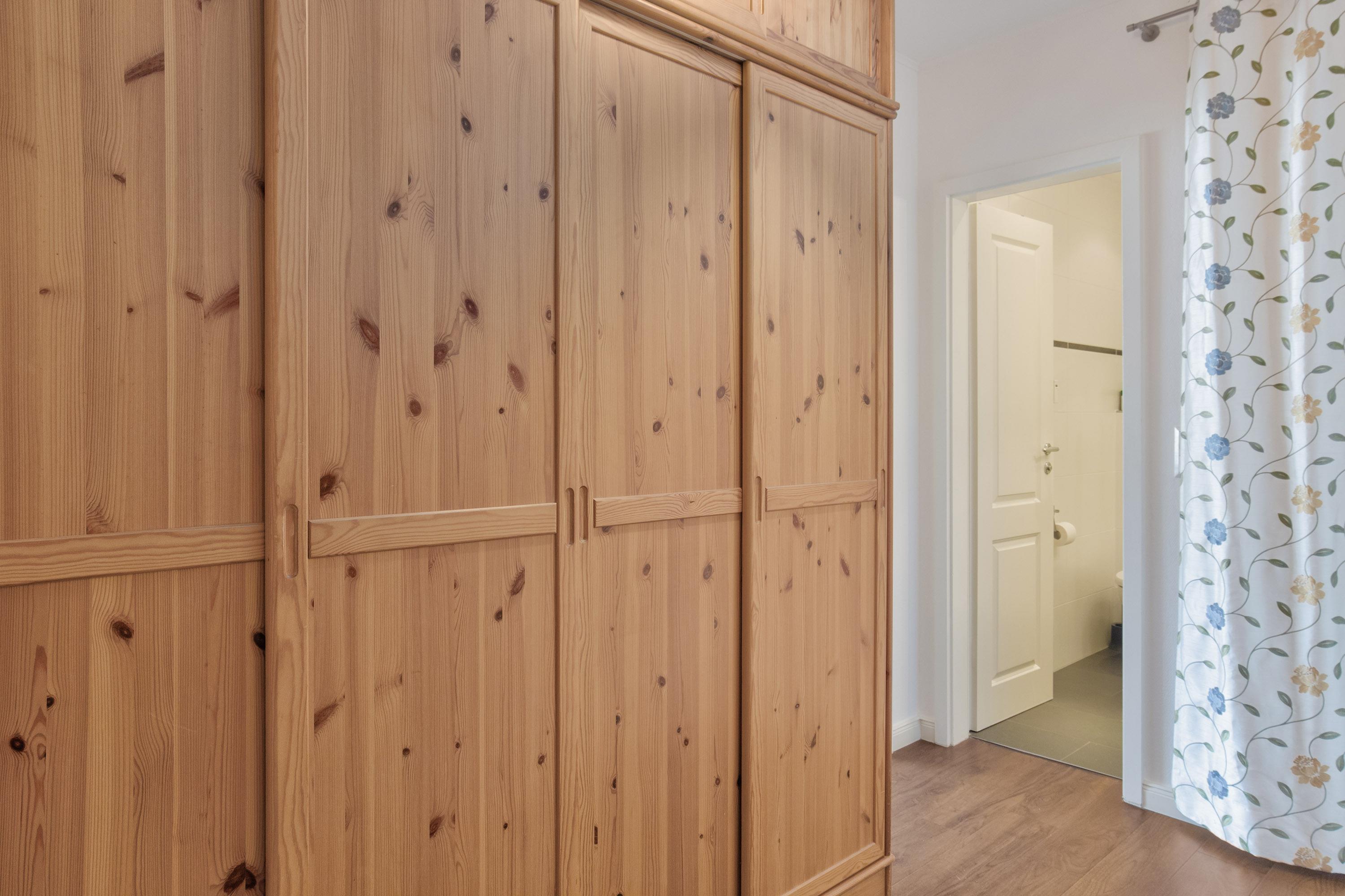 Ein platzsparendes Schrankbett (180x200) befindet sich ebenfalls im Wohnbereich. Ein großer Kleiderschrank im Flur bietet ausreichend Stauraum. Plissees und Vorhänge sorgen für Verdunklung. Bettwäsche und Handtuchsets sind gegen Gebühr möglich.